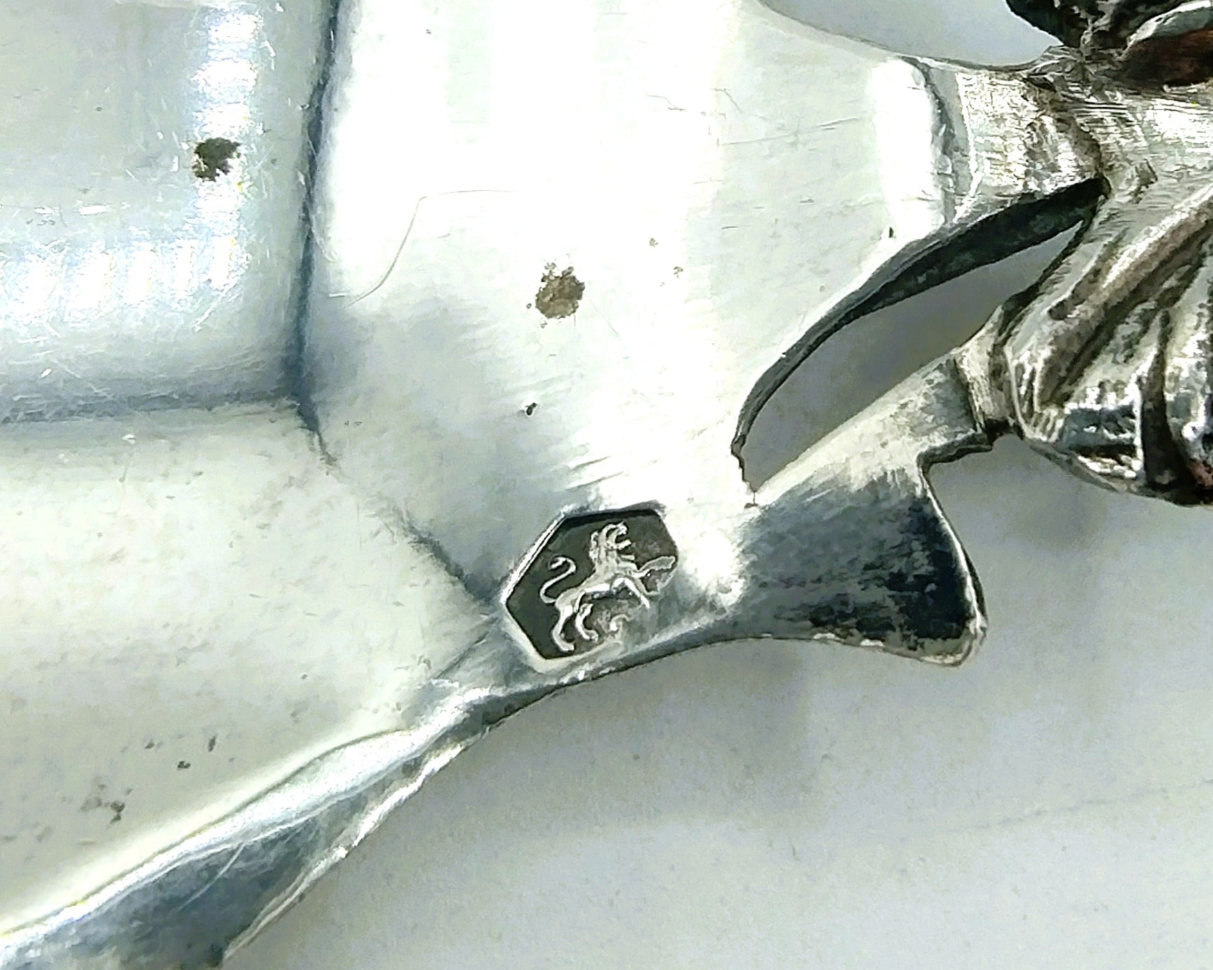 De lepel is gekeurd met het tweede gehaltekeur, meesterkeur: H13, jaarletter s voor 1902 en diverse pseudokeuren om de lepel een ouder uiterlijk te geven.