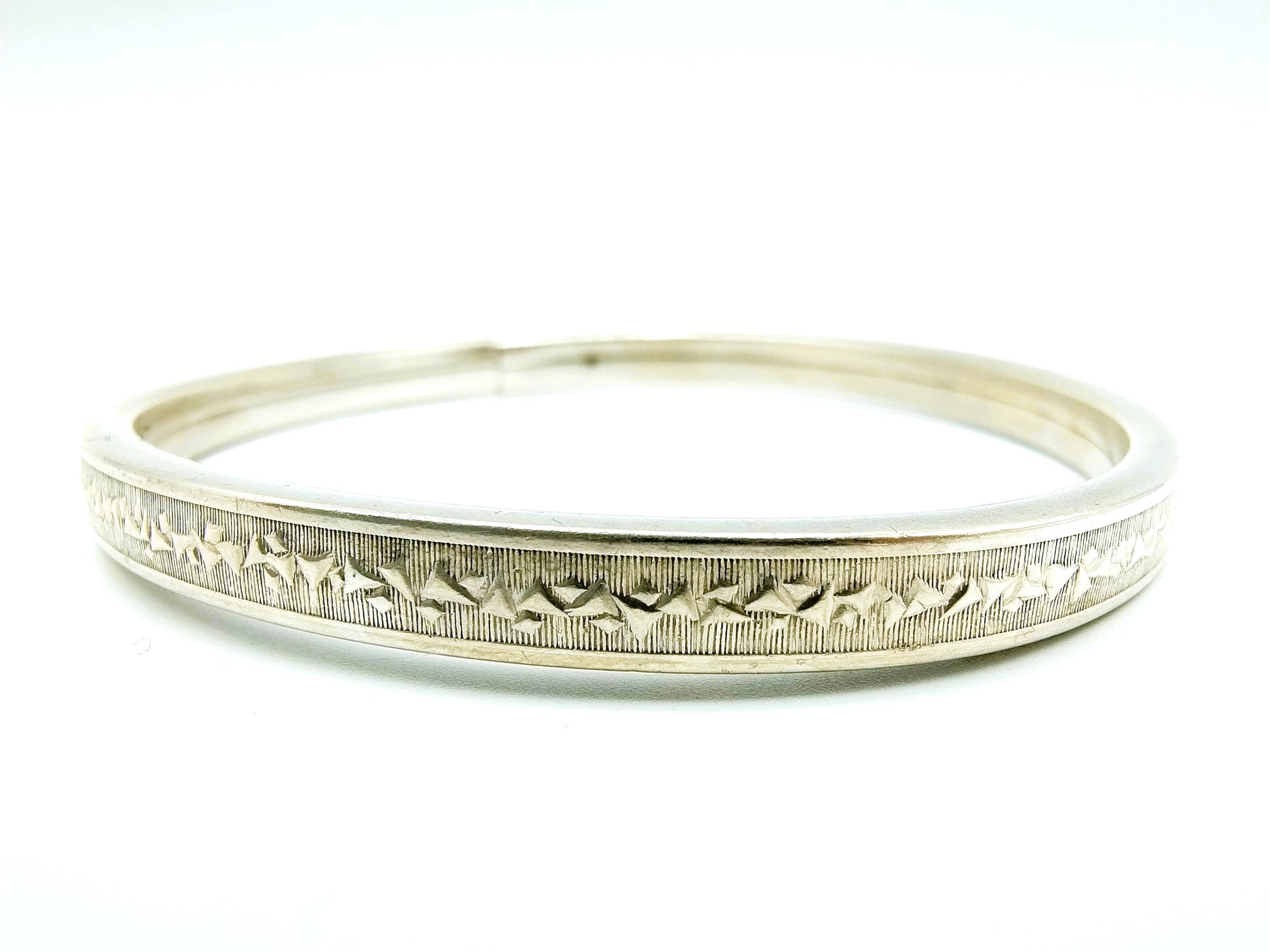 Zilveren vintage armband afkomstig uit Engeland. Het is een stijve armband met als binnenmaten: 5,5 x 6,5 cm. Breedte: 0,5 cm.