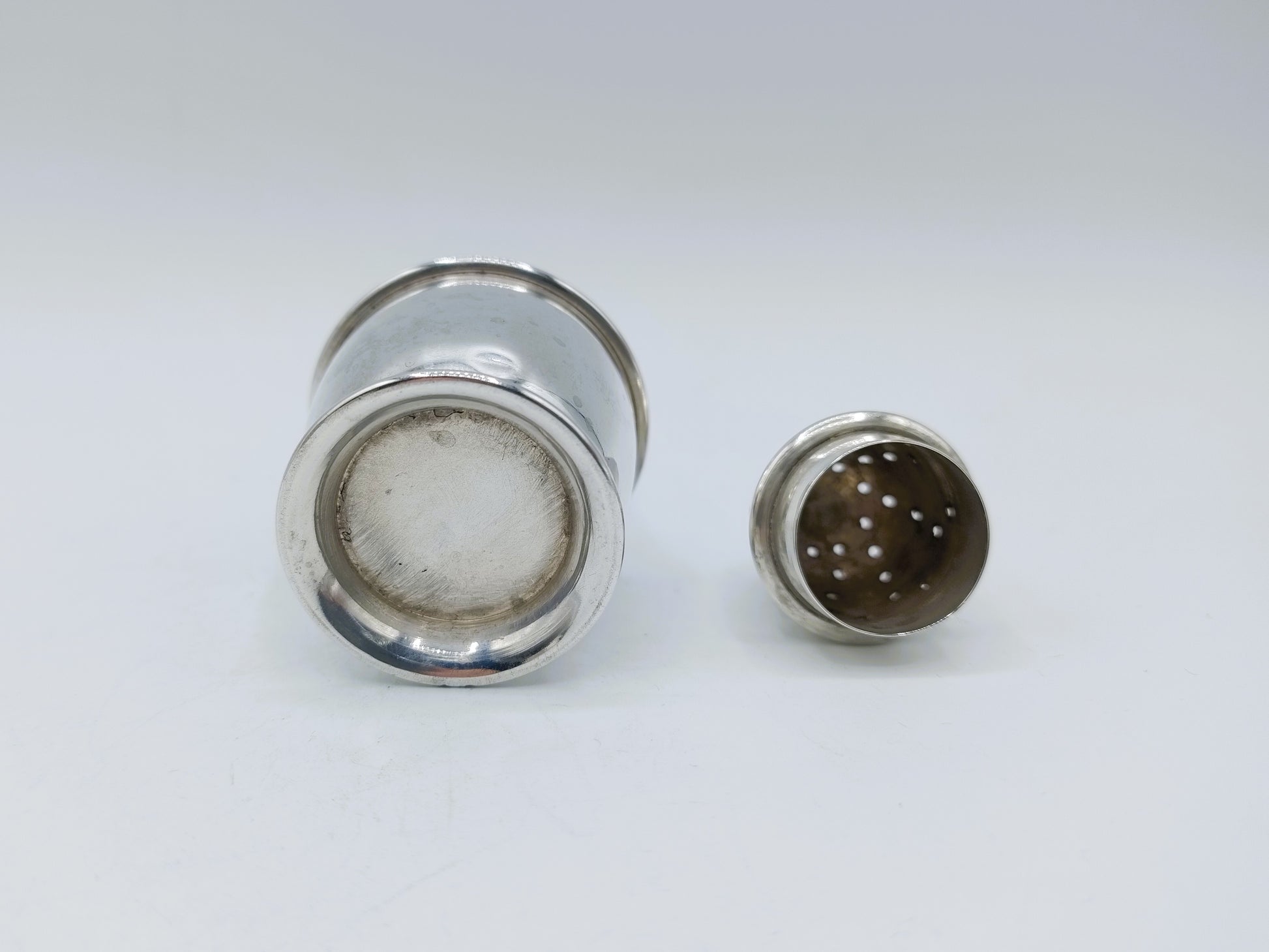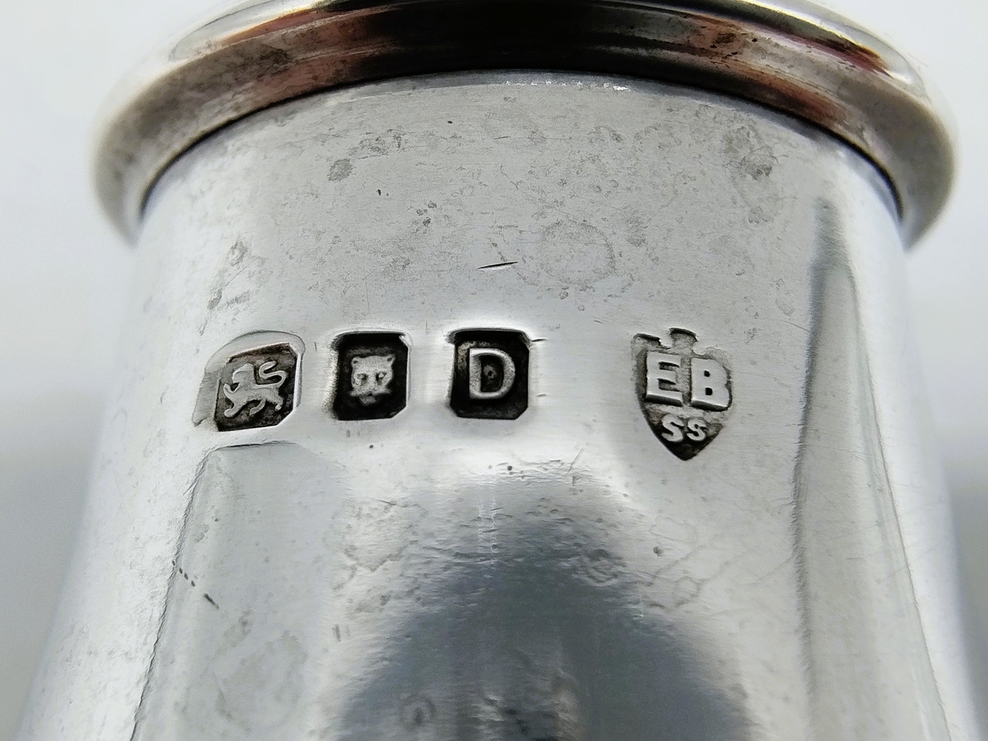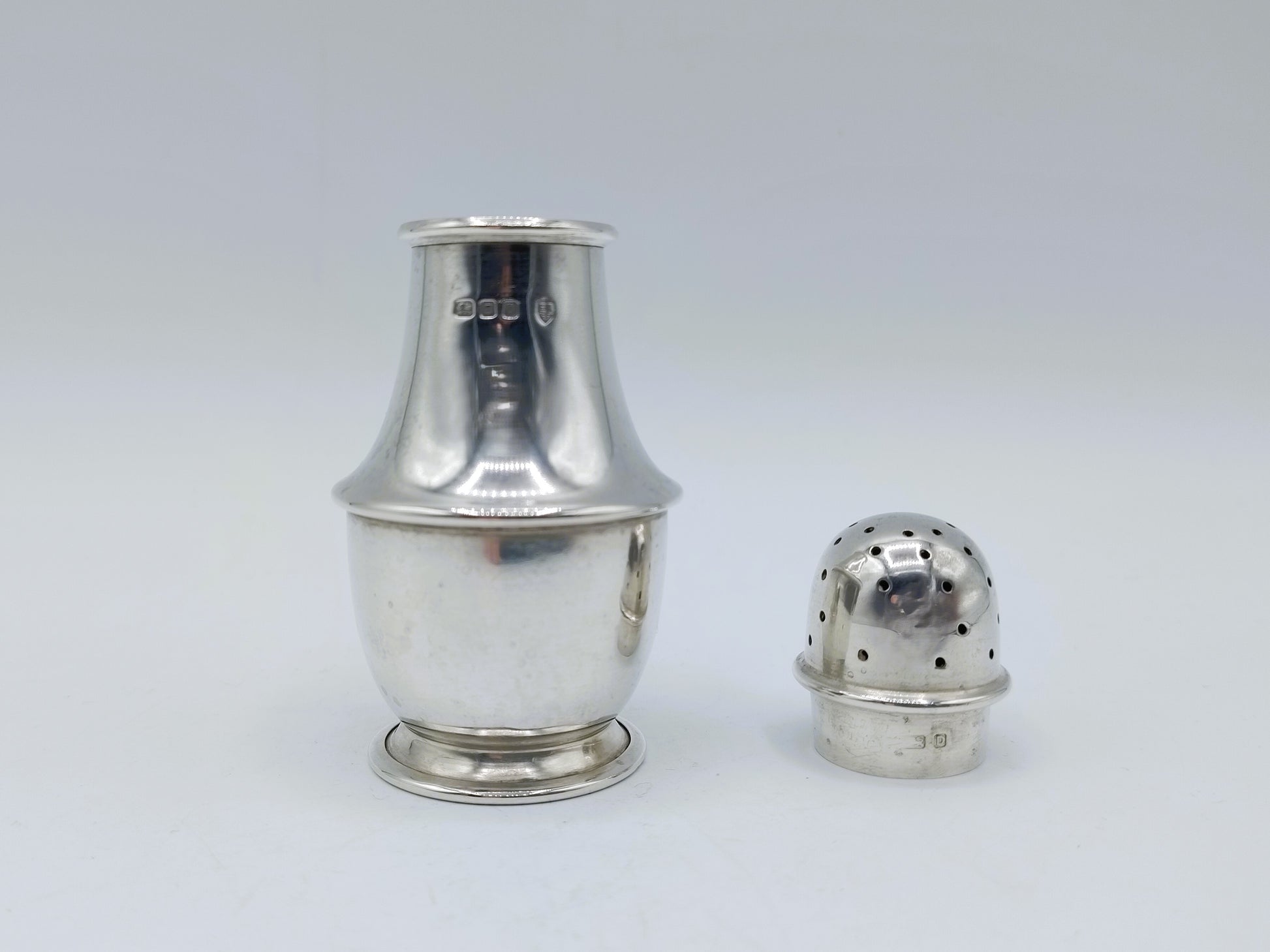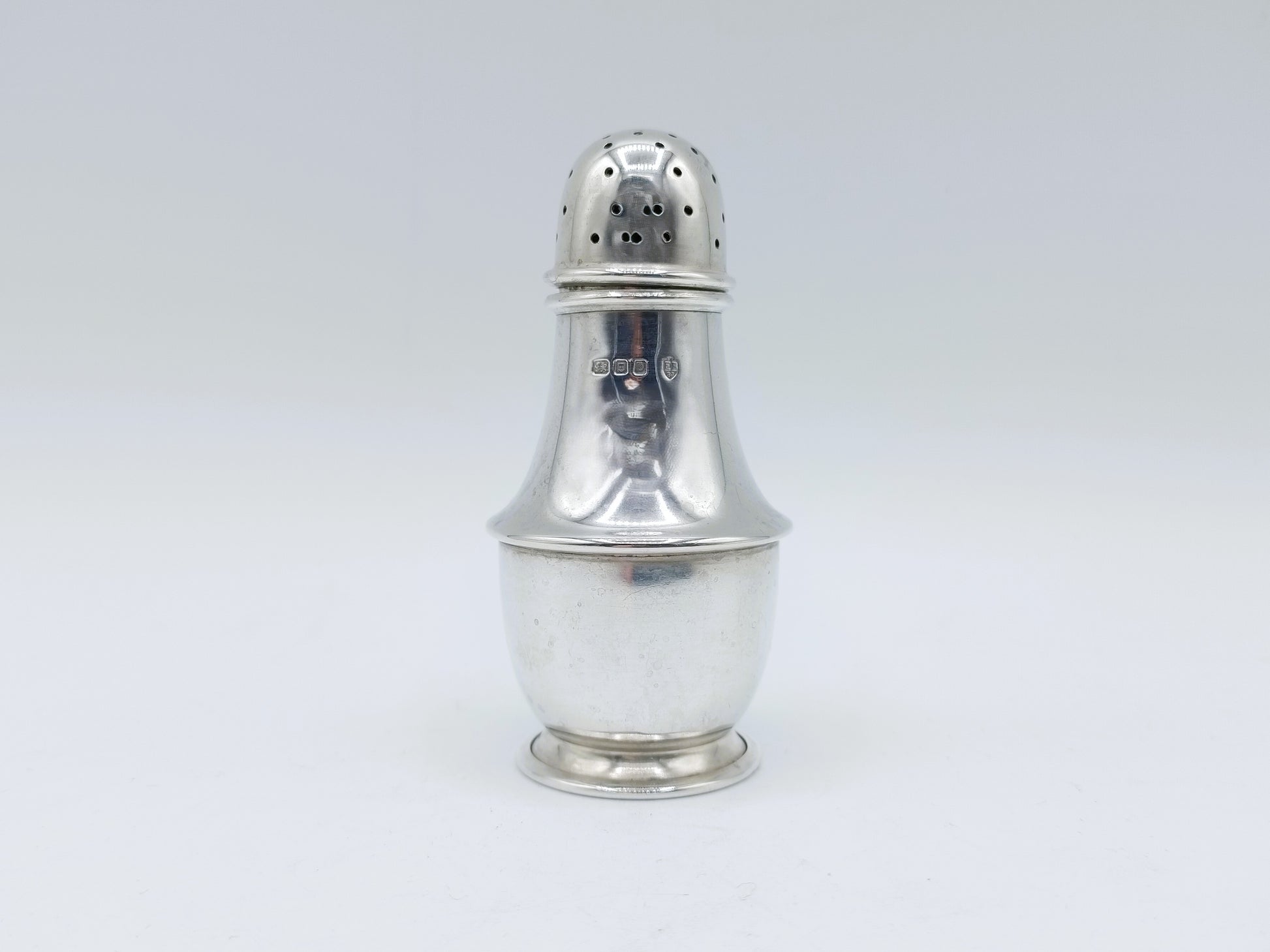 De strooibus is gekeurd met meesterteken EBs LD in een schild, jaarletter D voor 1939, stadskeur Londen en het 1e gehaltekeur voor sterling zilver.