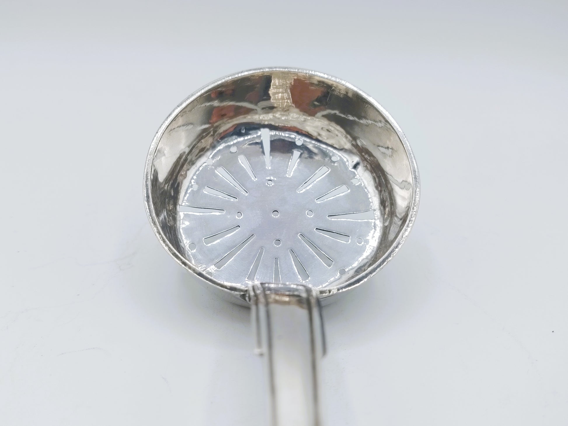 Zilveren strooilepel gemaakt door de zilversmid Anders Fredrik Weise uit Stockholm. Hij was werkzaam van 1776 tot 1808.