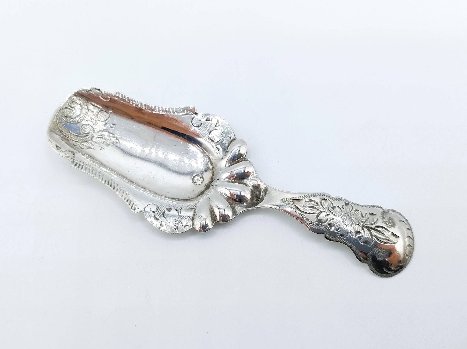 Zilveren suikerlepel in biedermeierstijl gemaakt door J. Schijfsma Jz uit Woudsend en Sneek. Hij werkte van 1848 tot 1889.