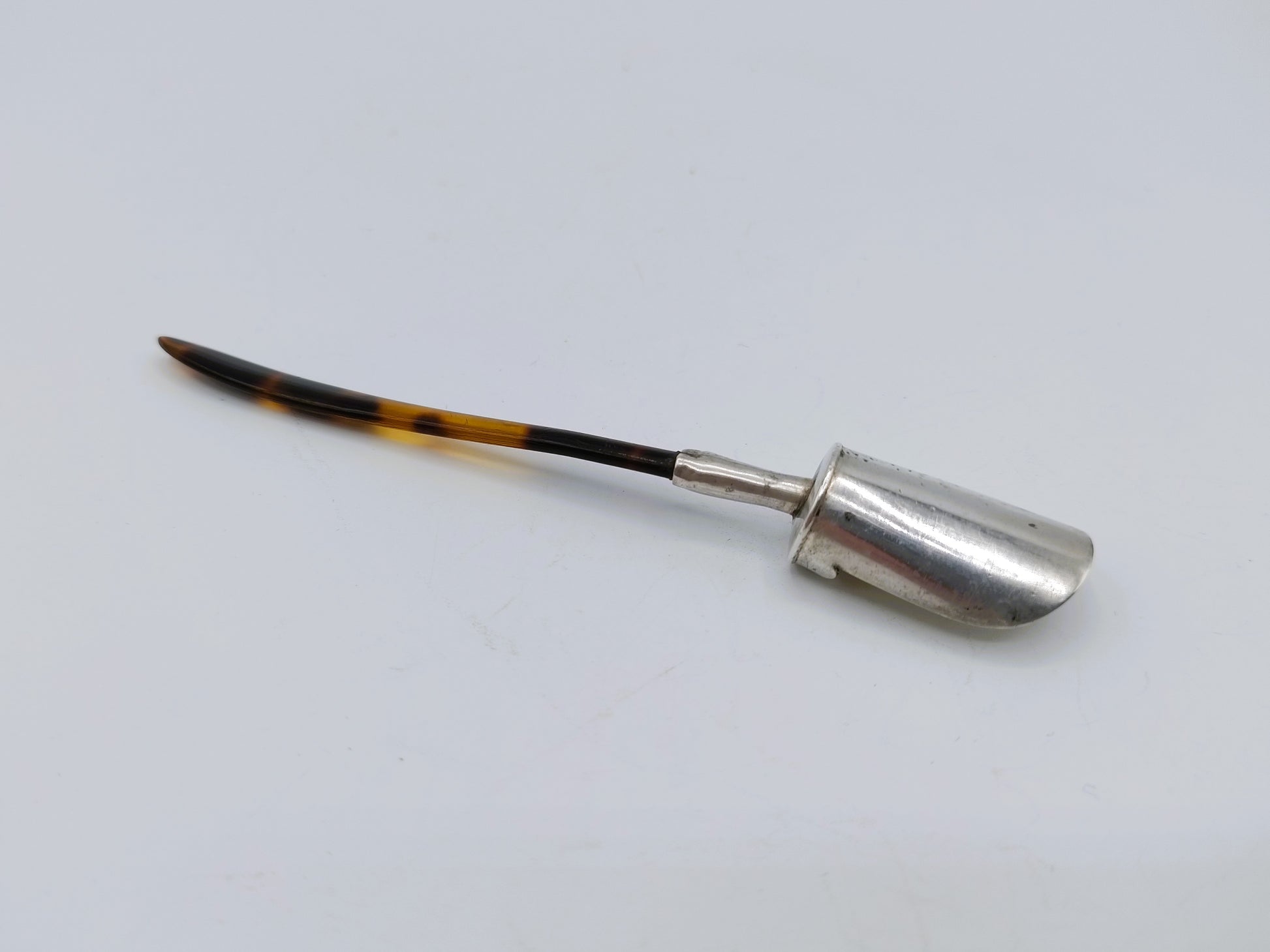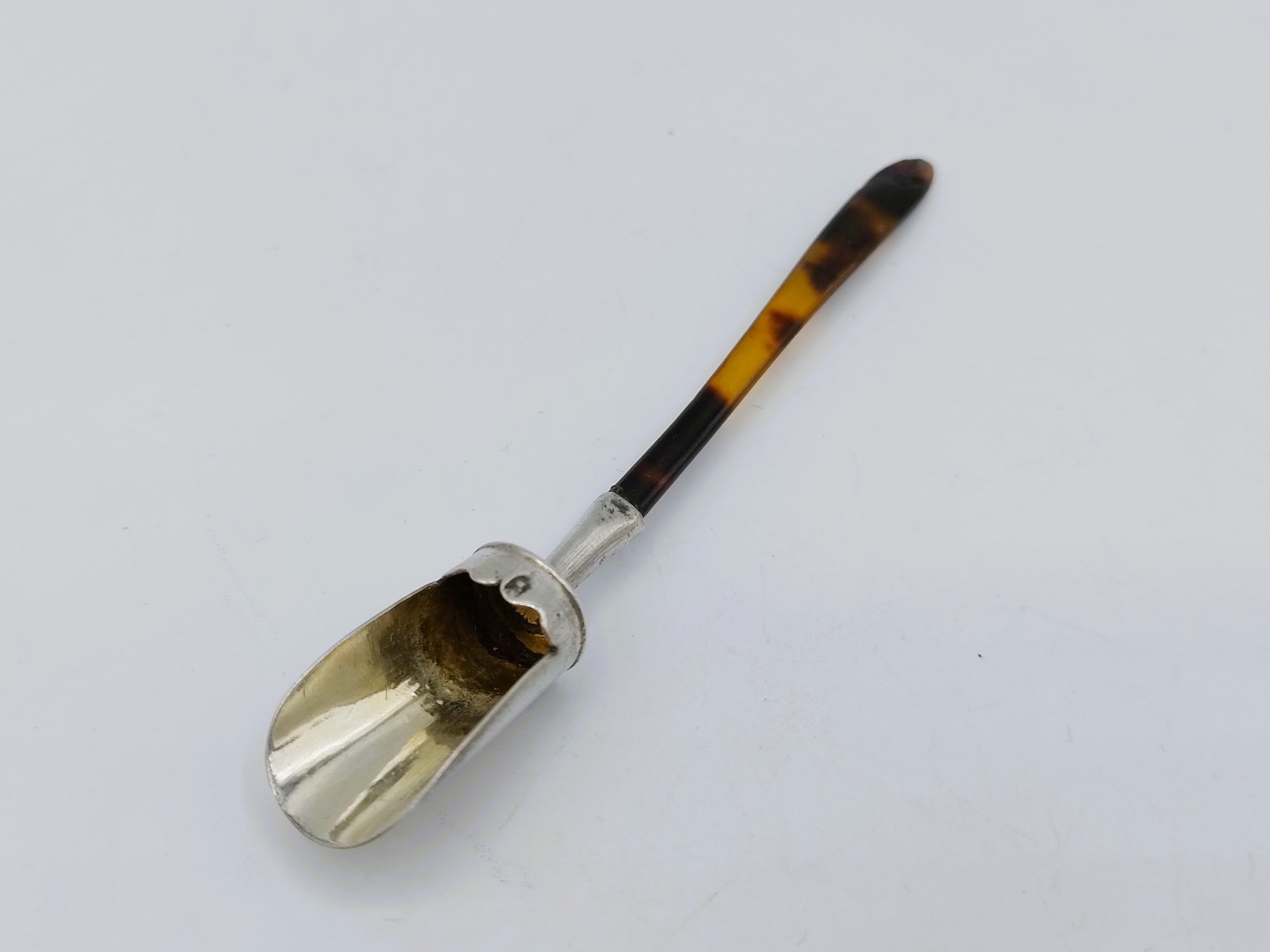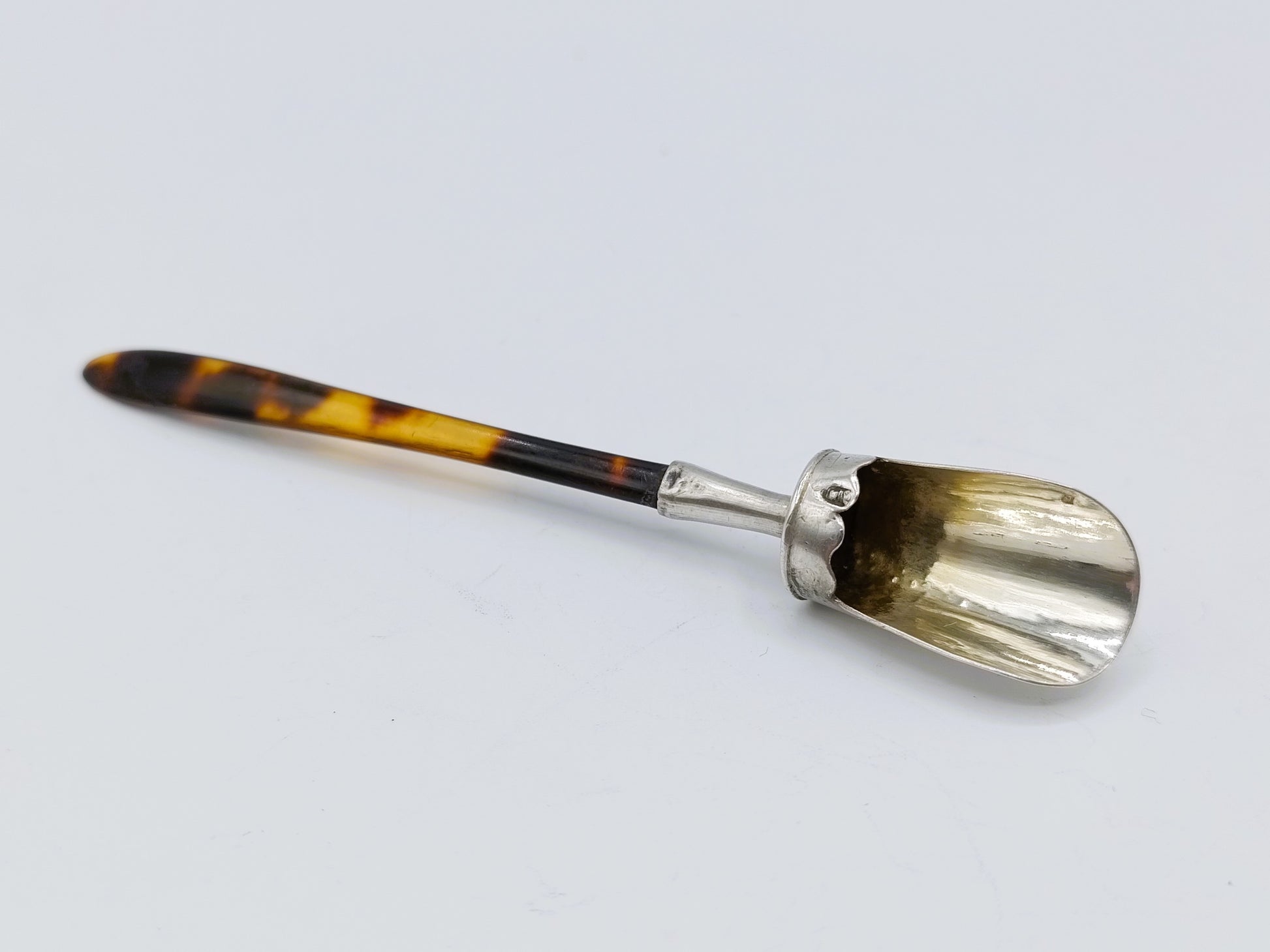 Zilveren suikerschepje met een heft gemaakt van schildpad.