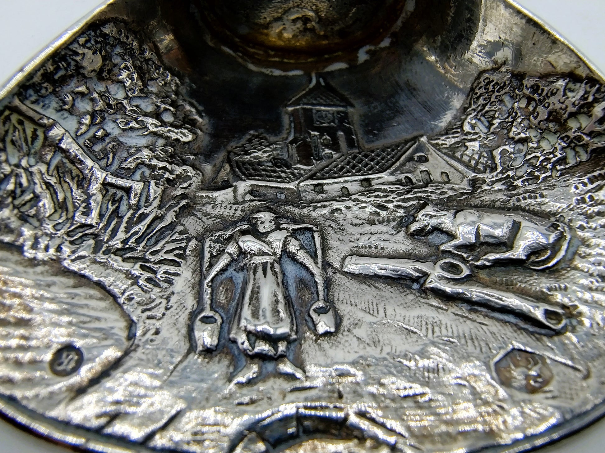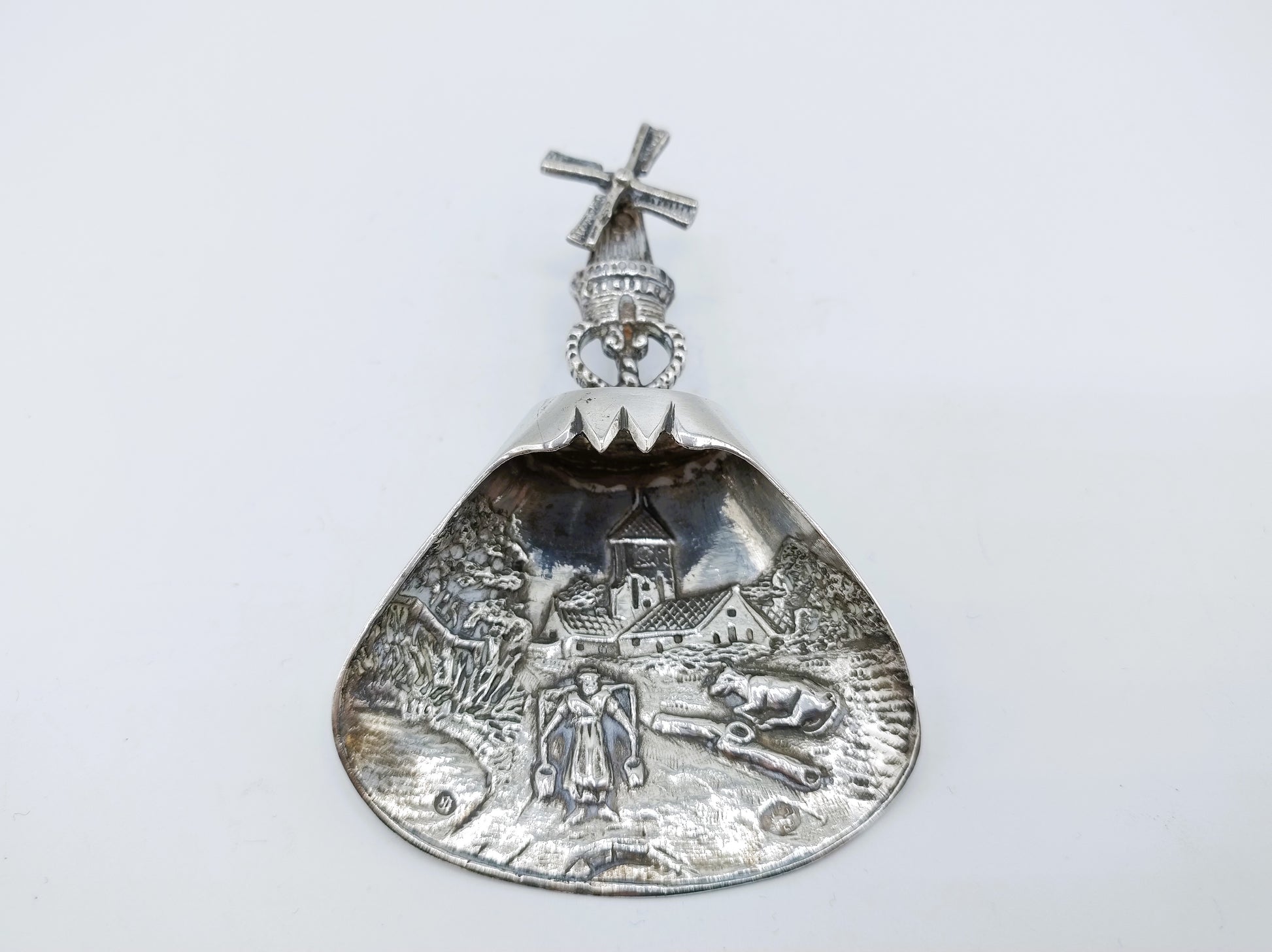 Zilveren suikerschepje met oud Hollands decor van een boerderij met melkende vrouw.