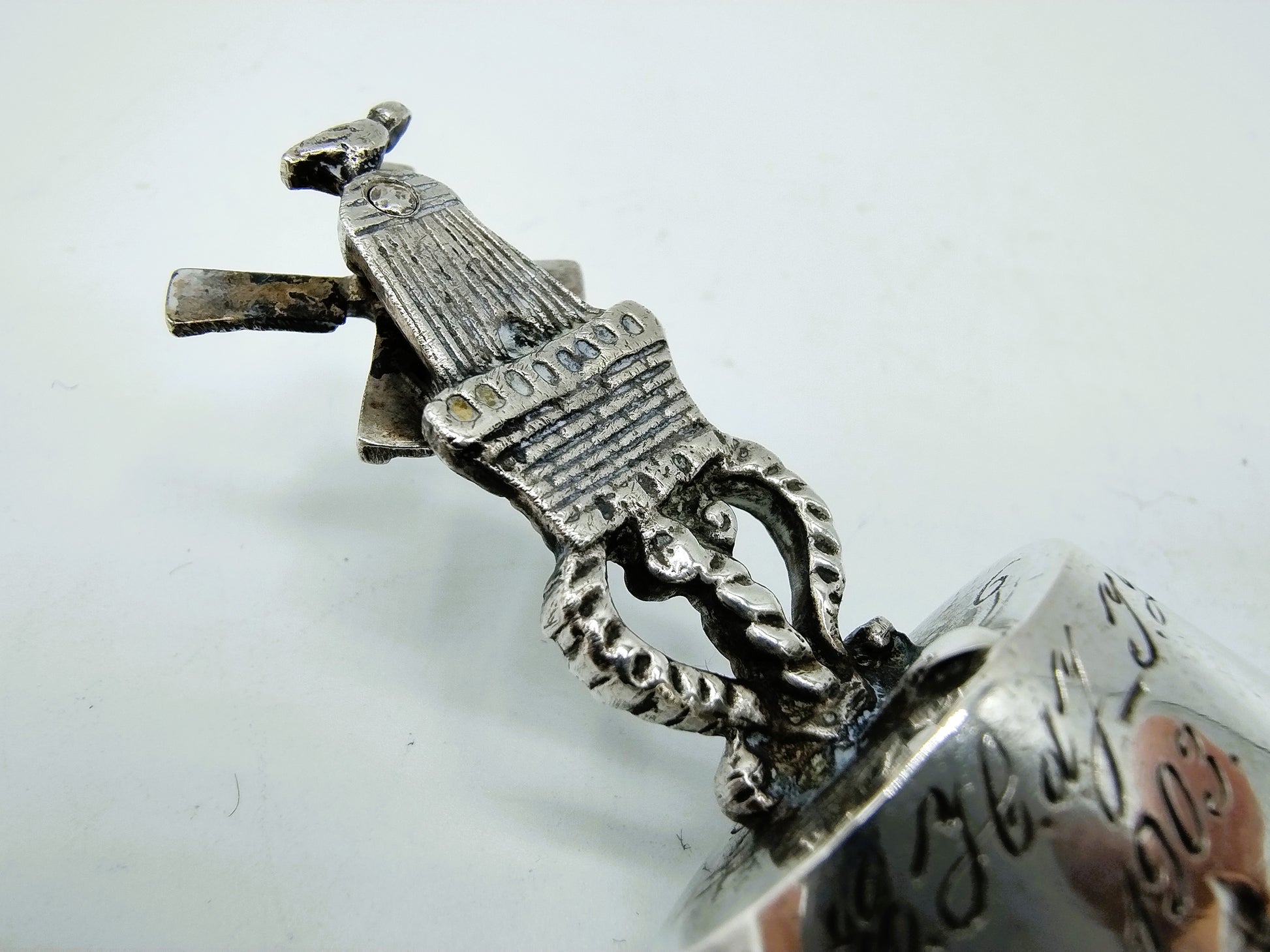 De lepel is gekeurd met het tweede gehalte keur, onleesbaar meesterteken, minervakopje en jaarletter R voor 1901.