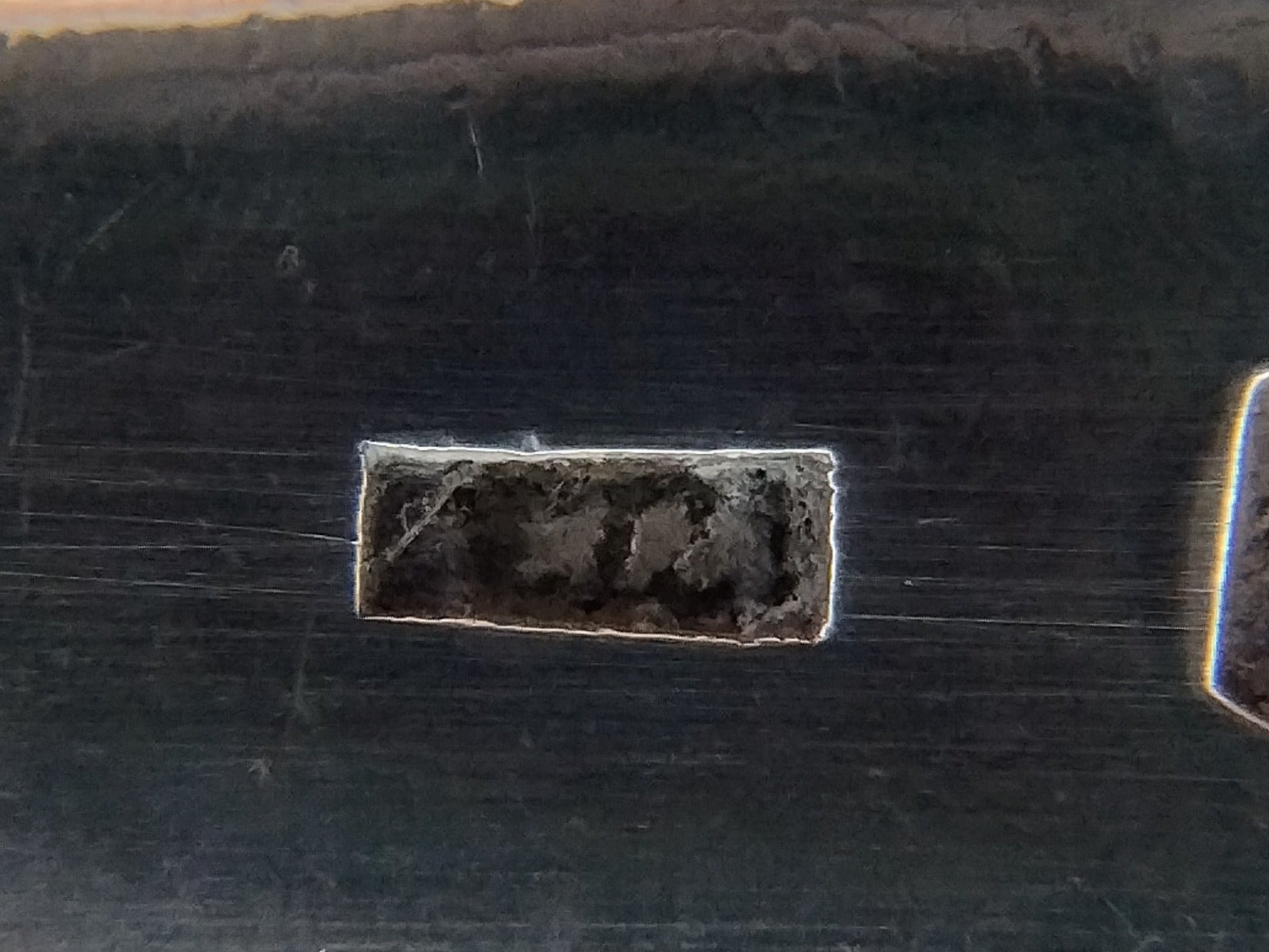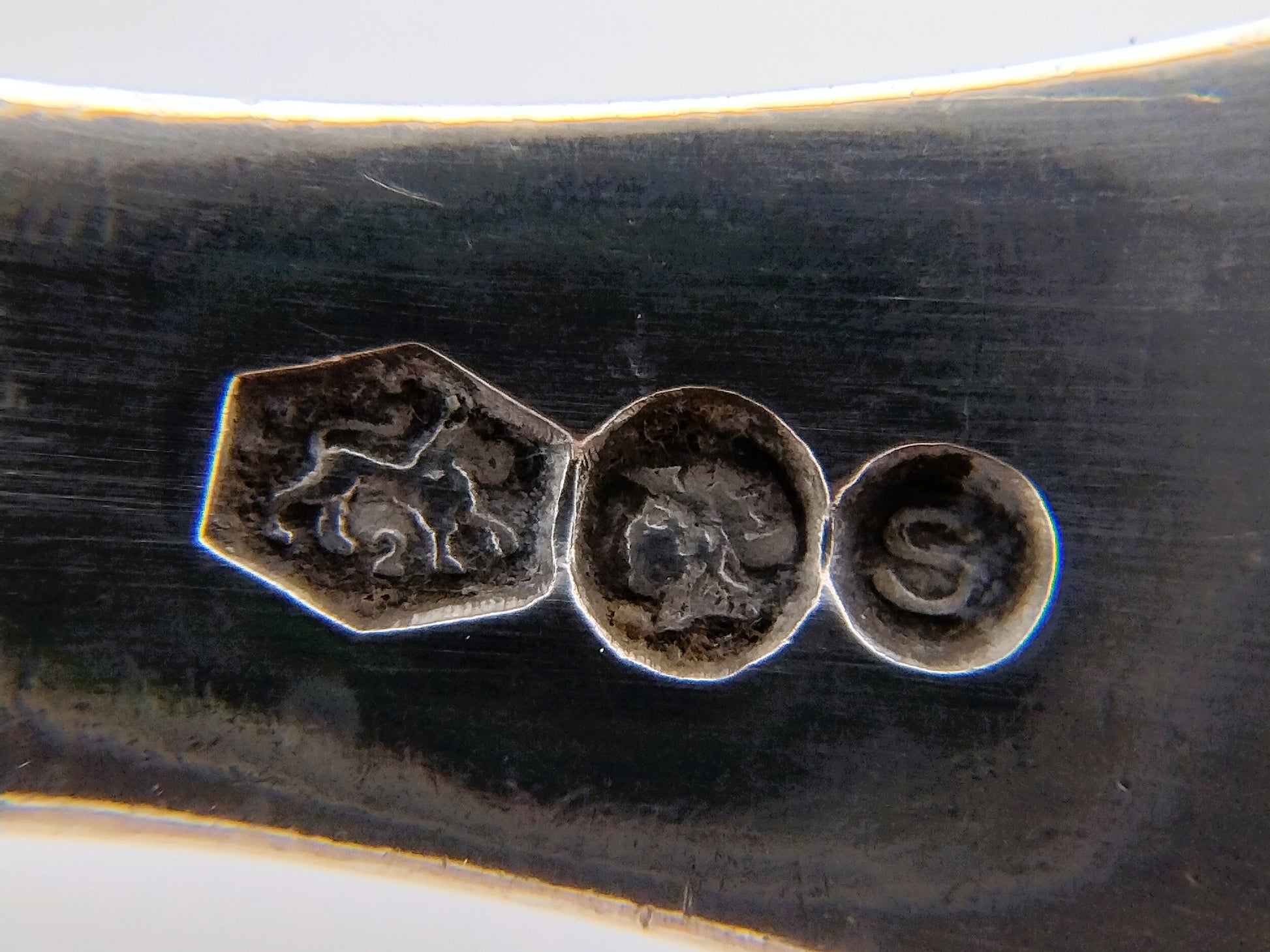 Het schepje is gekeurd met een moeilijk leesbaar meesterkeur W*?, tweede gehaltekeur, minervakopje en jaarletter S voor 1928.