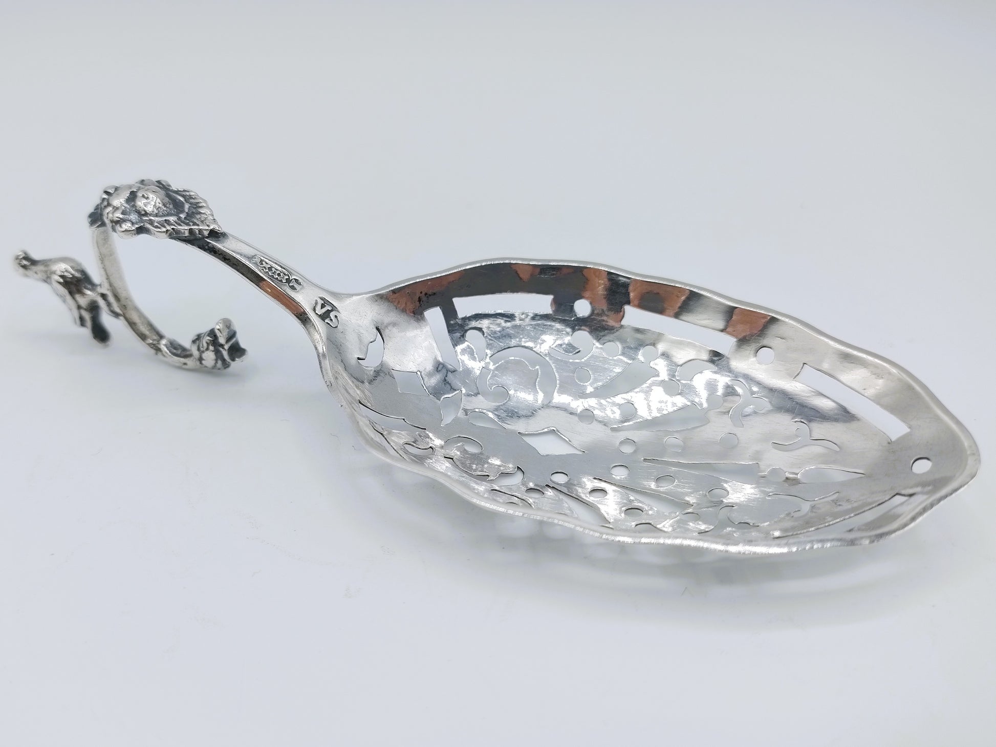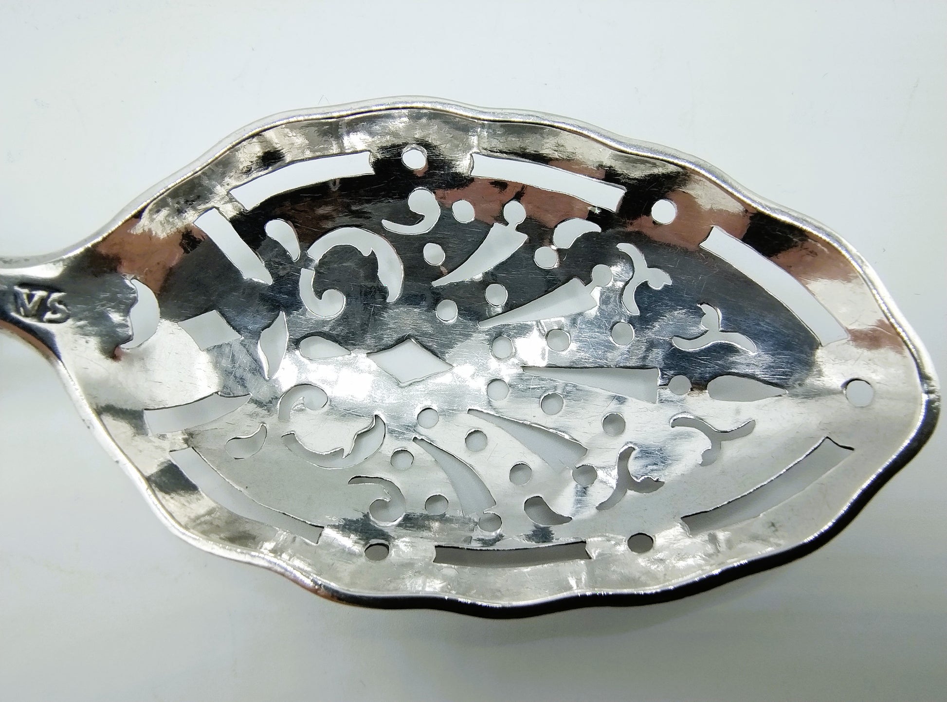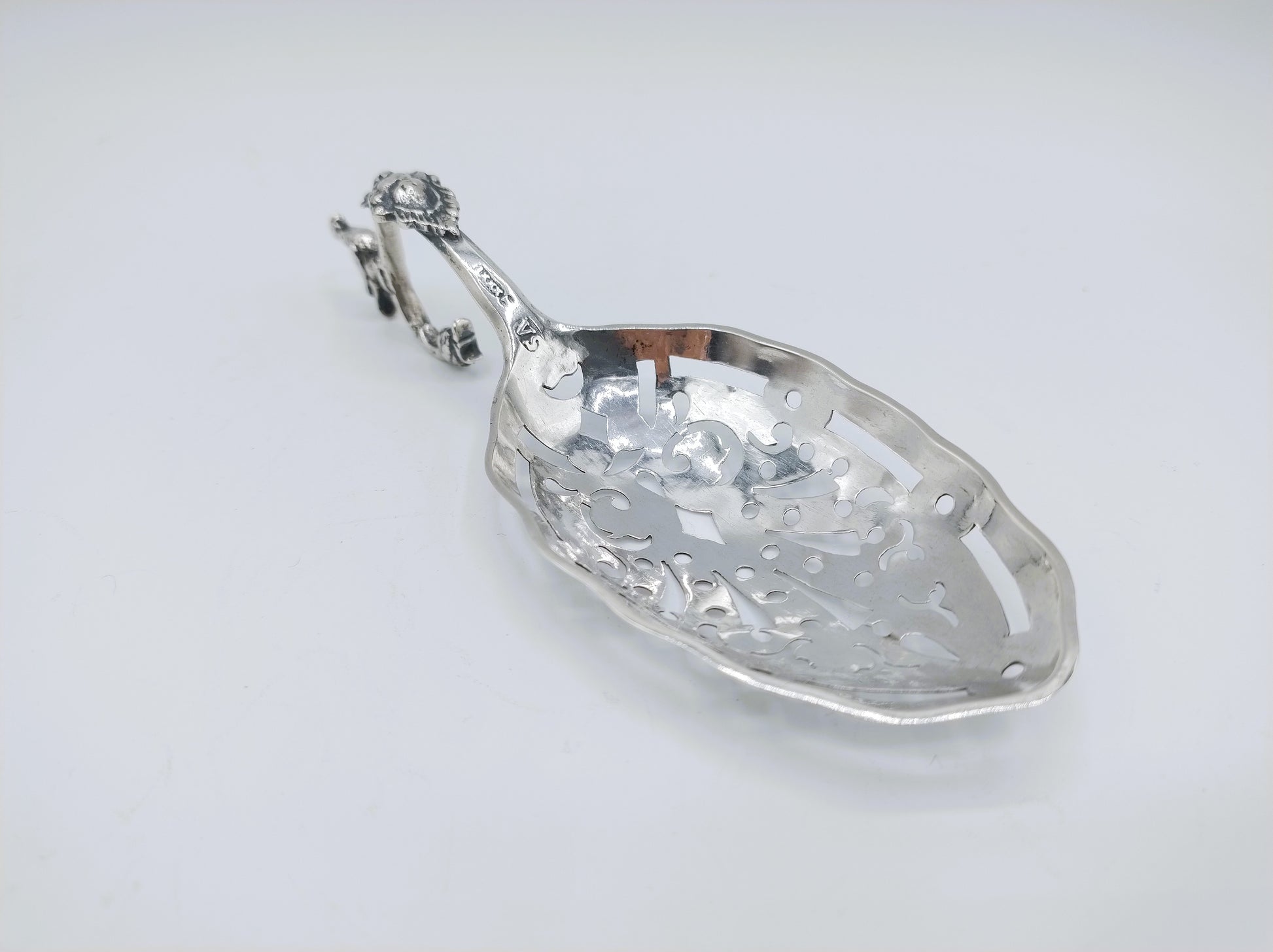 De strooilepel is gekeurd met meesterteken VS, stadskeur van Amsterdam en jaarletter I voor 1793.