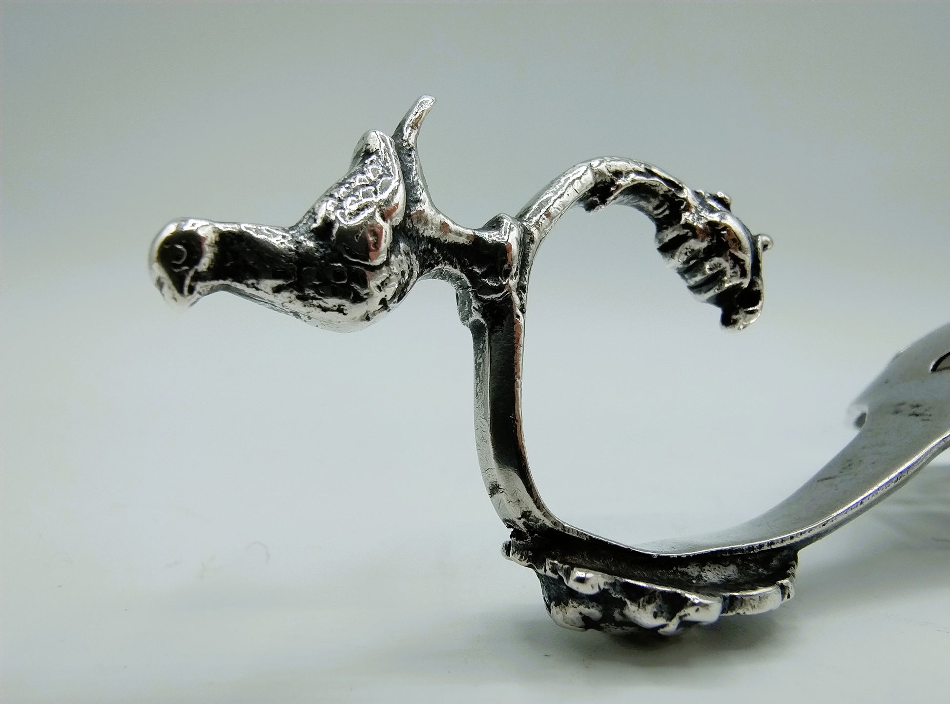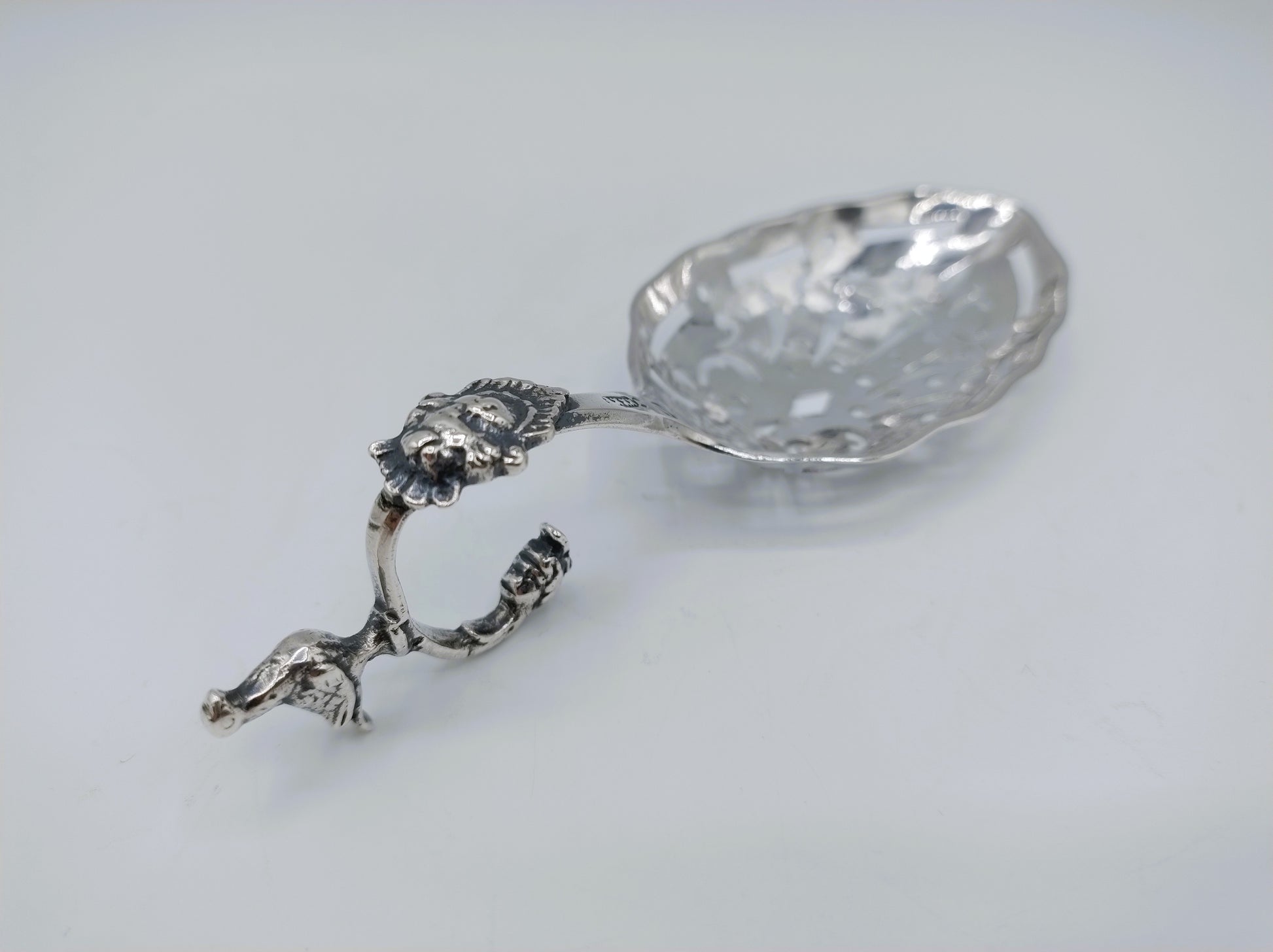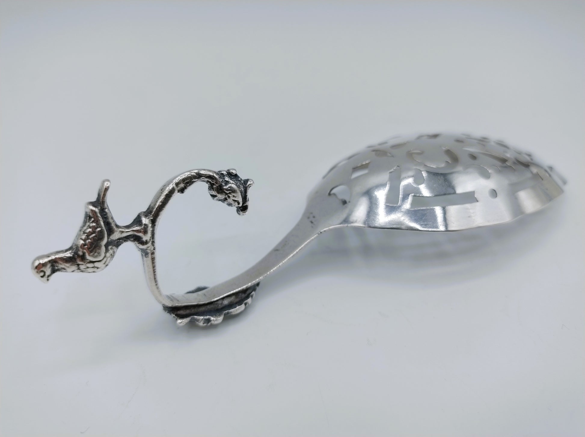 De lepel met geschulpte rand, heeft een kopje onder aan de steel en op de bovenkant staat een duif.
