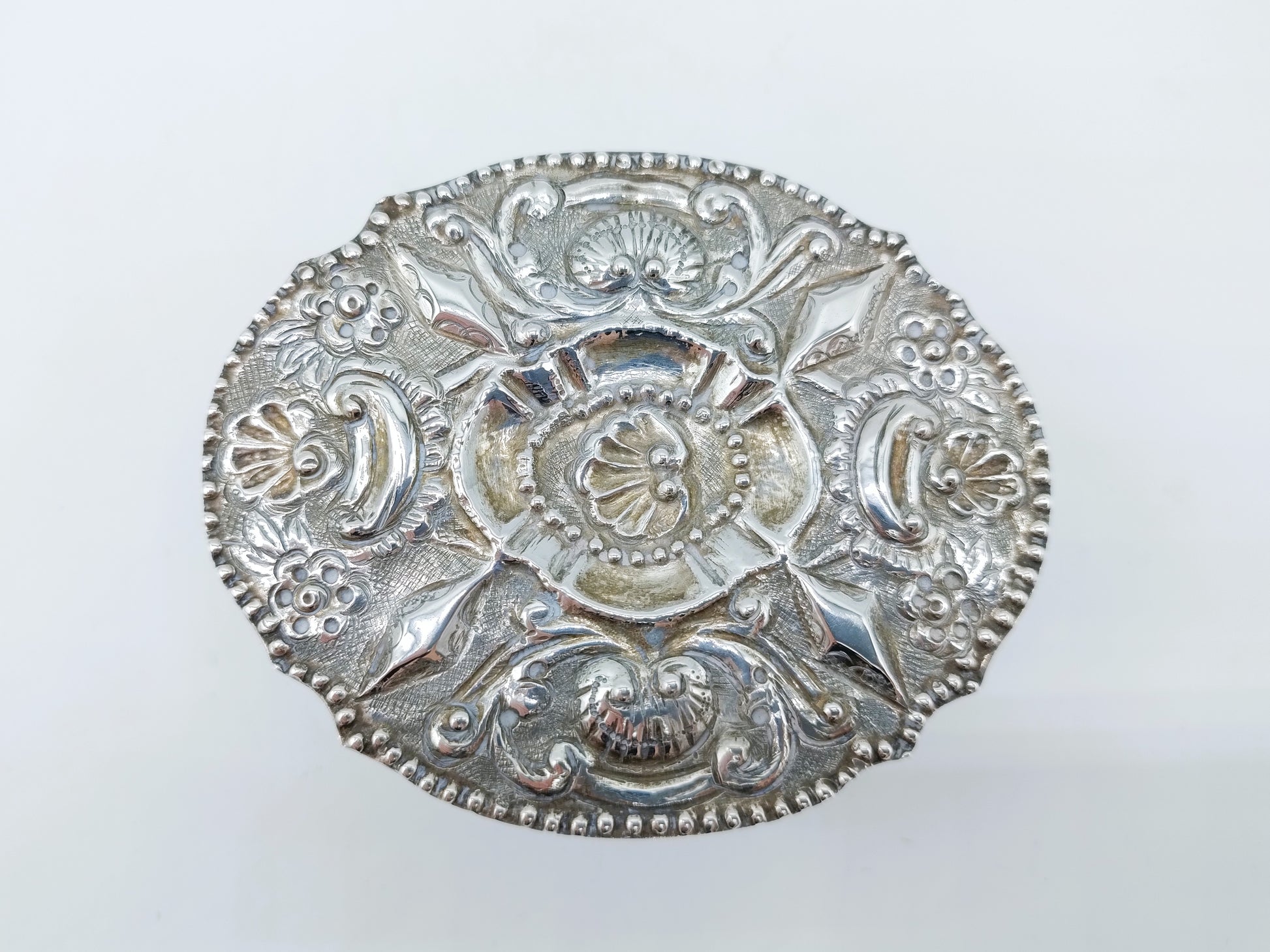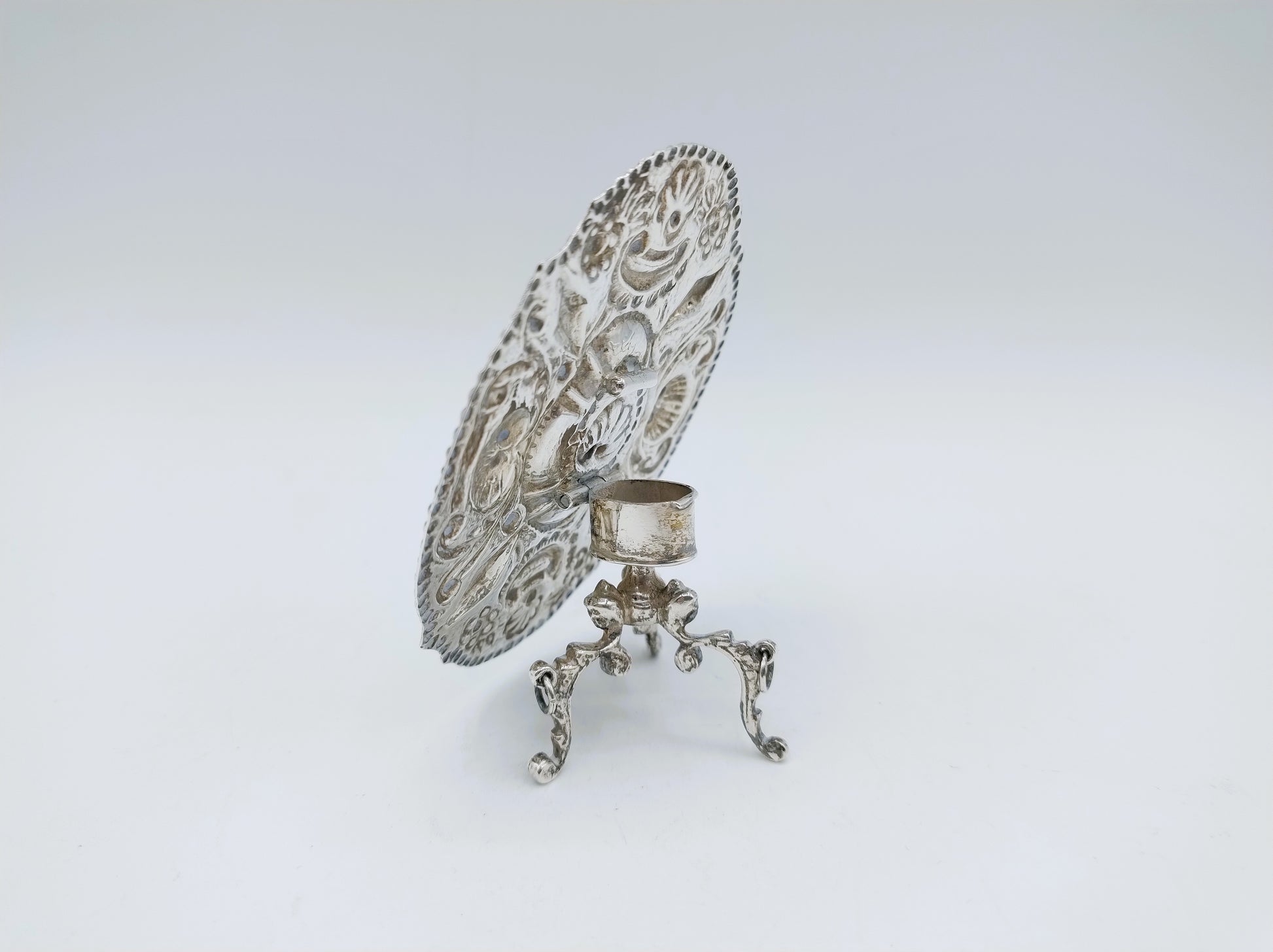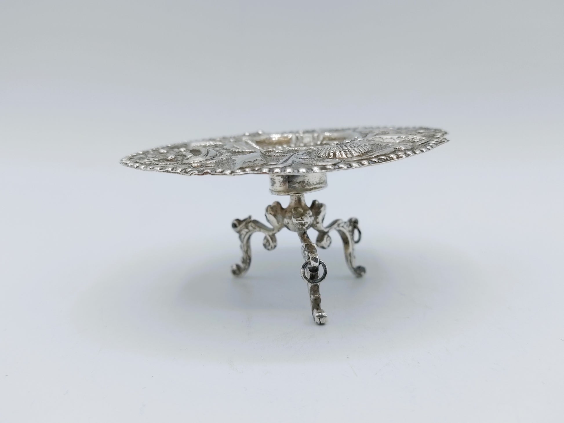 Klein model Fries zilveren suiker- of kandijtafeltje met een ovaal gecontourneerd blad gemaakt door een onbekende zilversmid. De meeste suikertafels zijn in Sneek geproduceerd.
