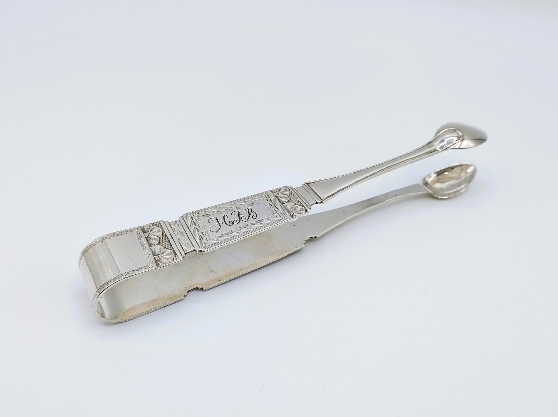 De tang is fraai gegraveerd en is voorzien van een dubbele monogram: HFB en CB.