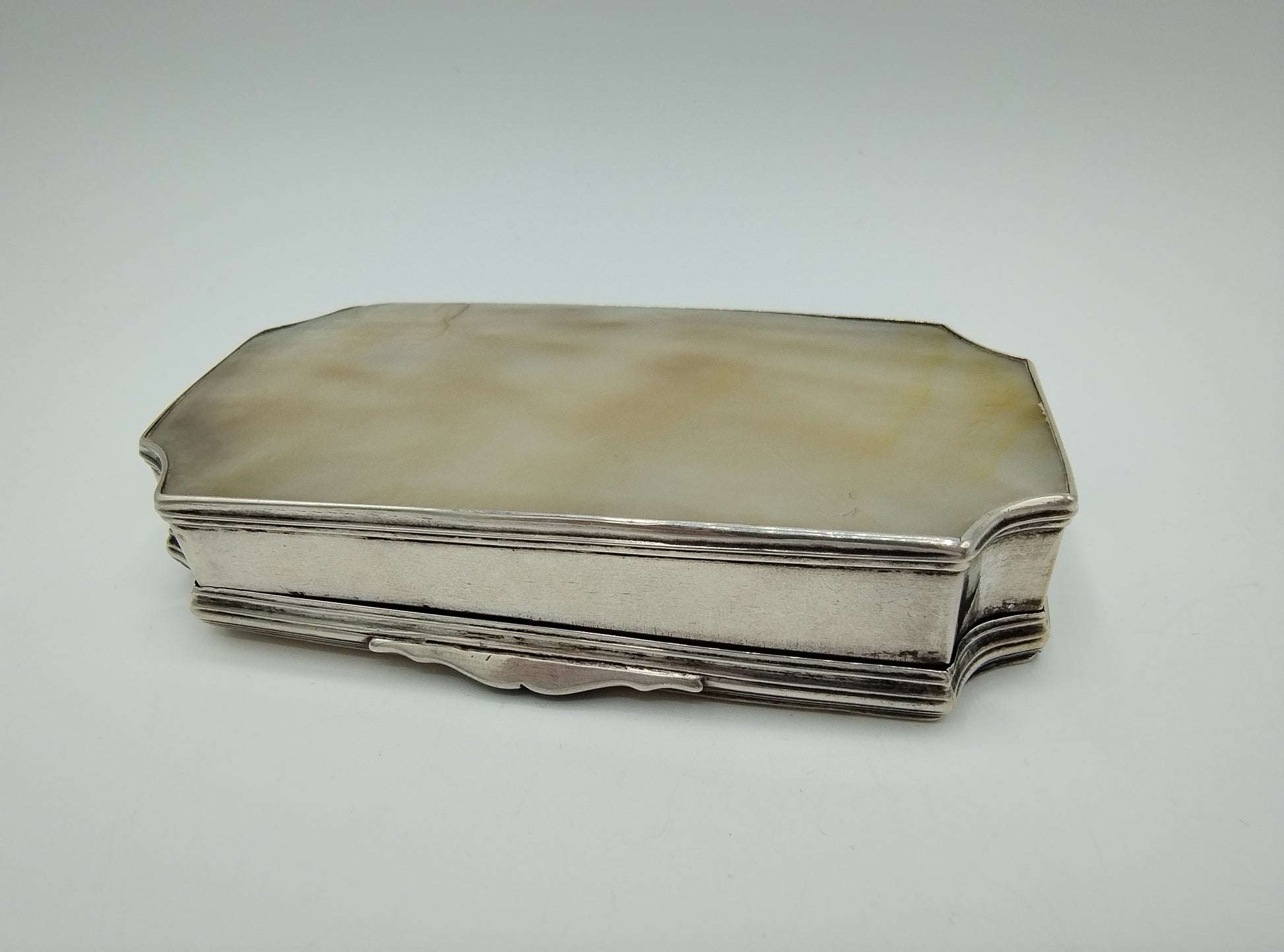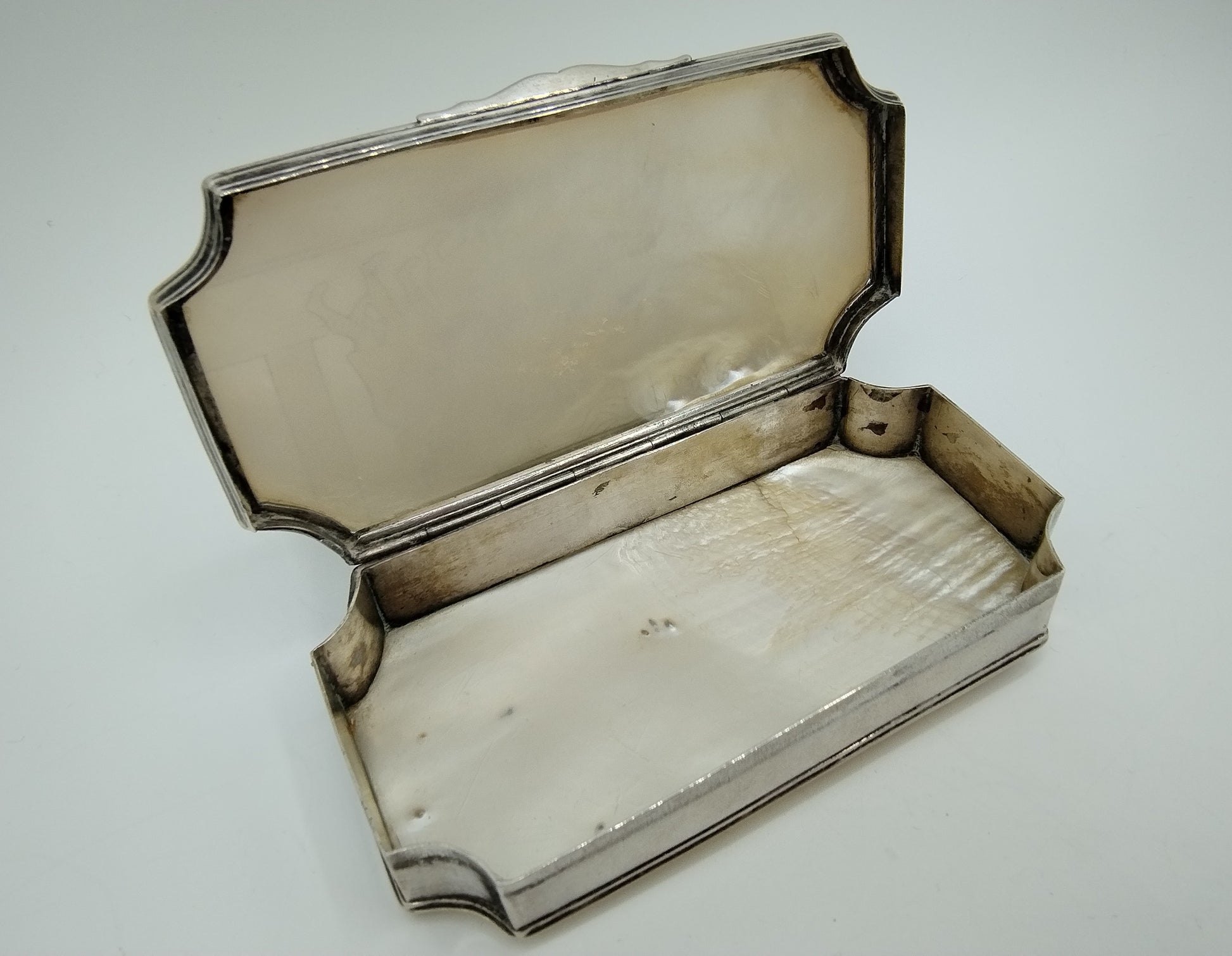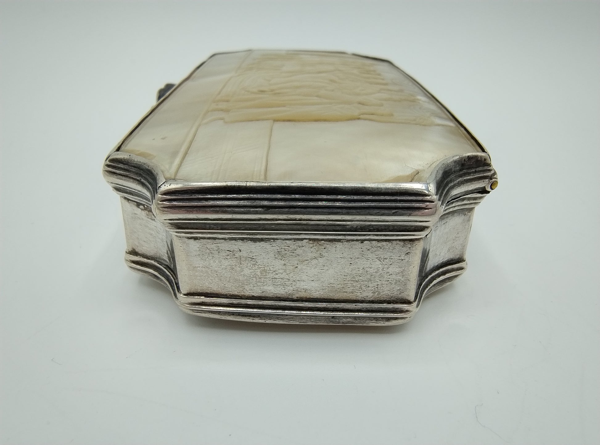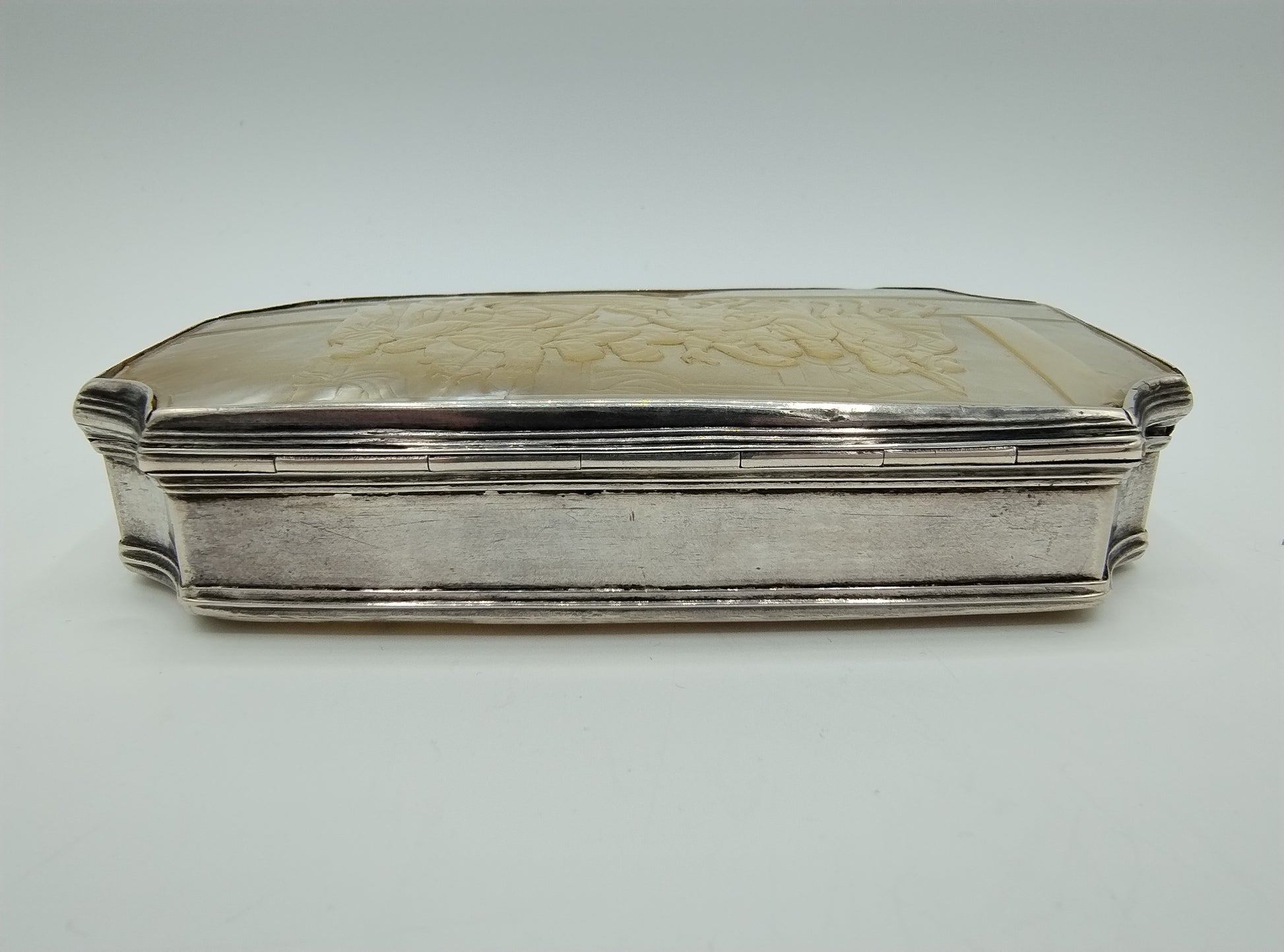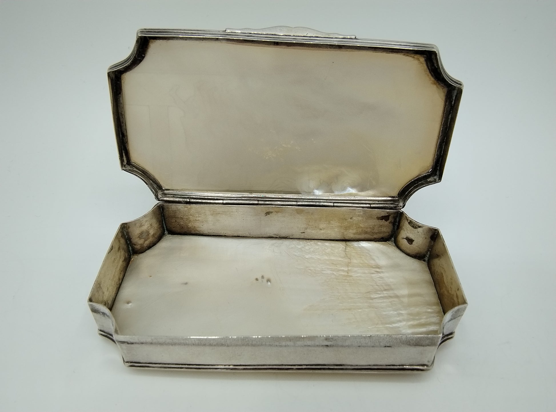 18 Eeuwse zilveren tabaksdoos met parelmoer boven- en onderkant.