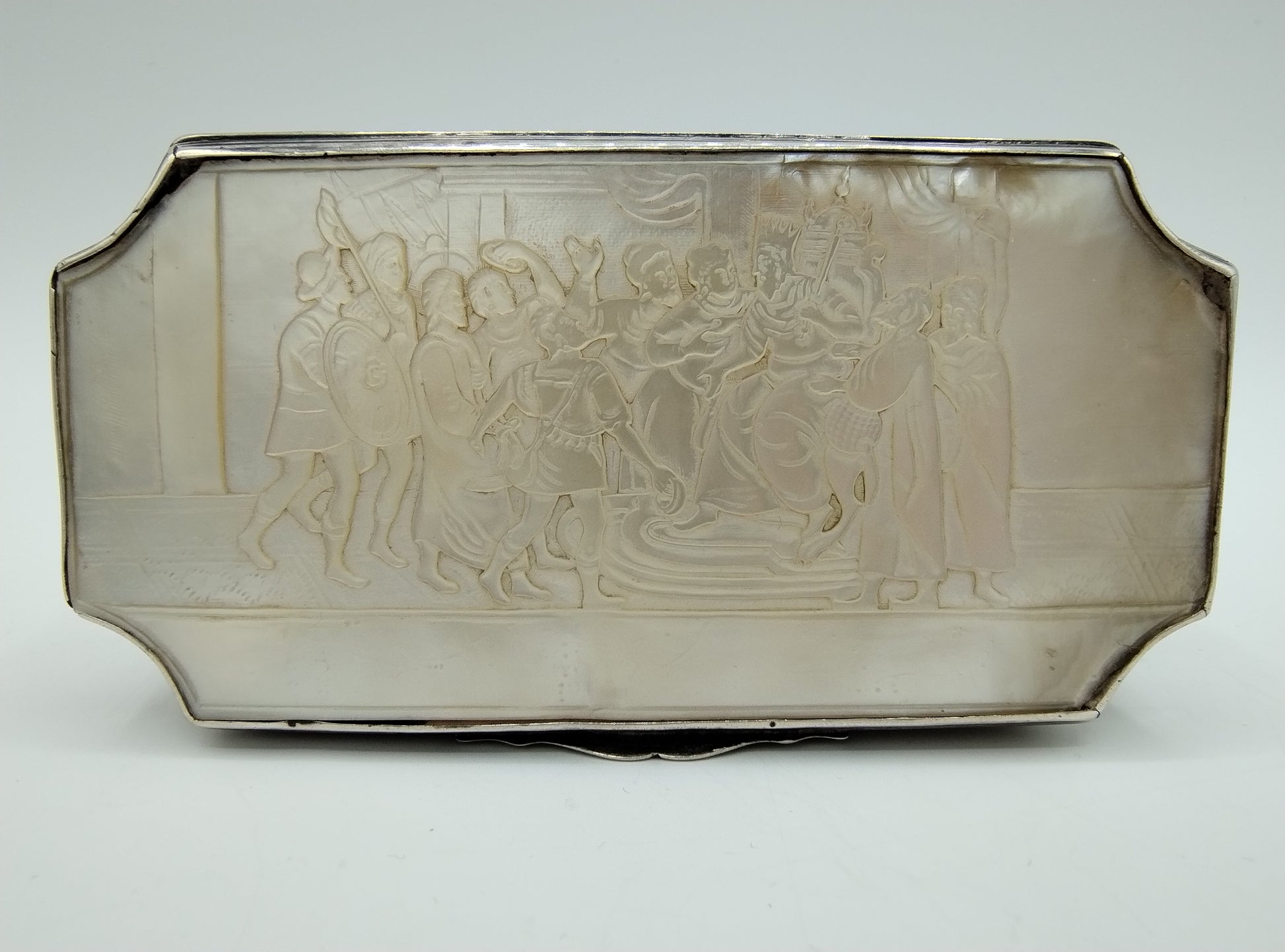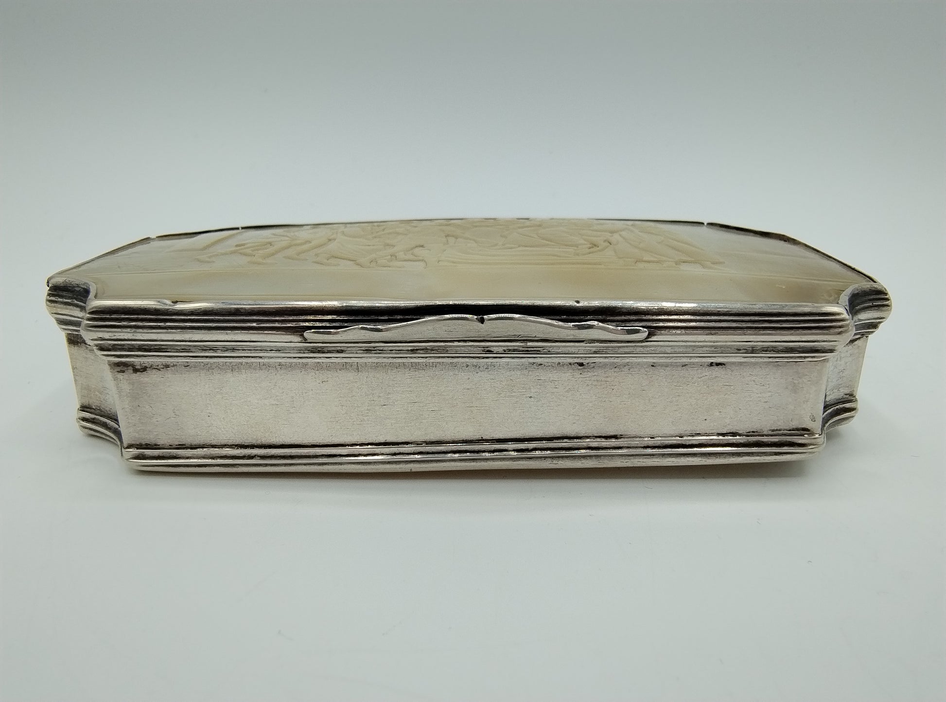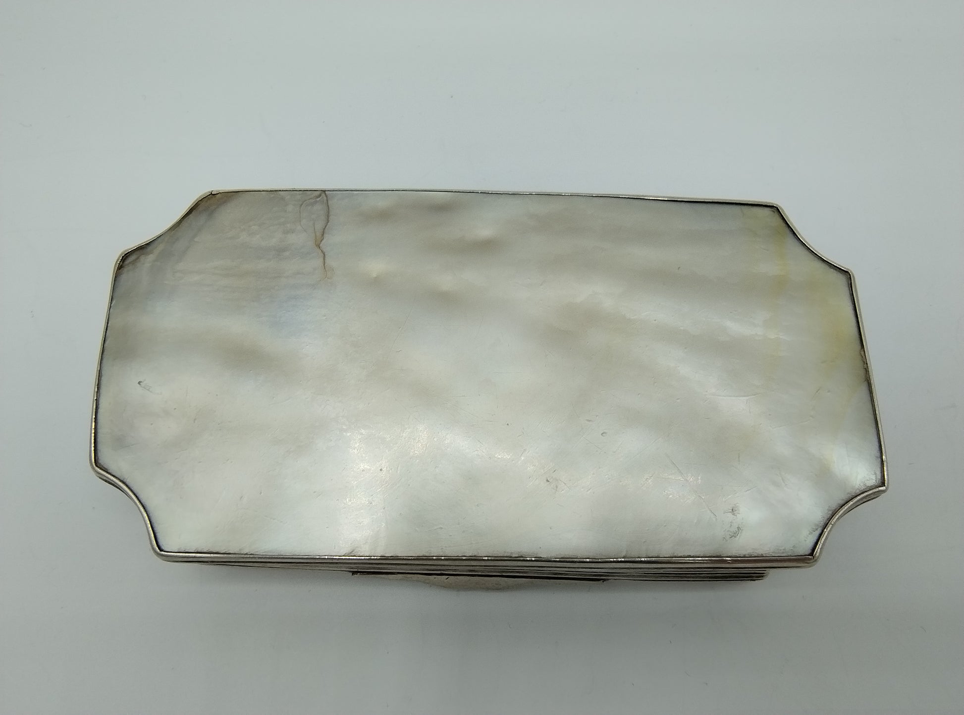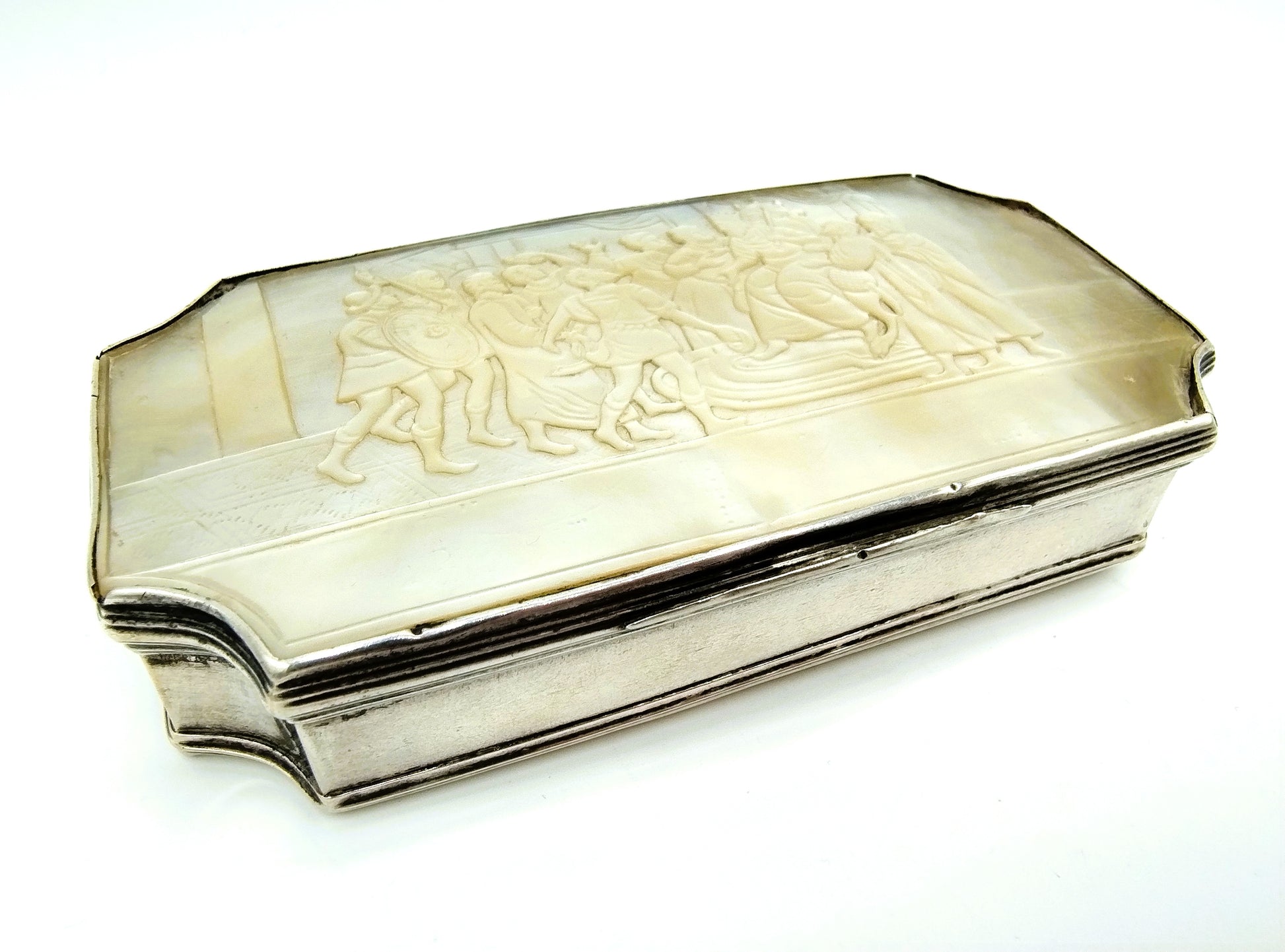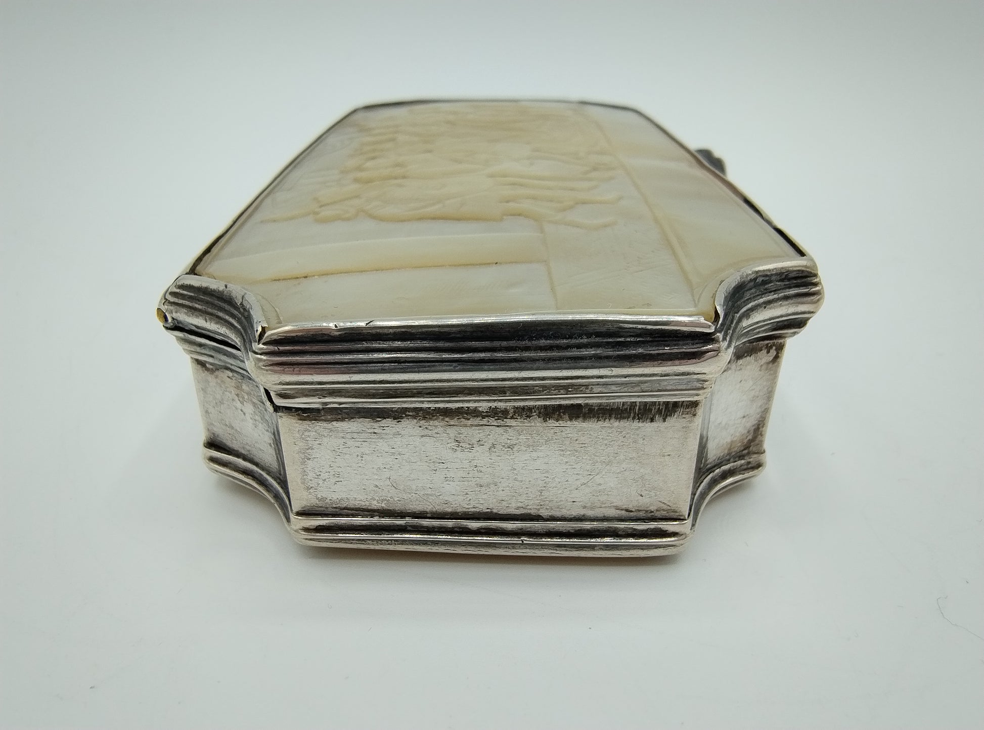 18 Eeuwse zilveren tabaksdoos met parelmoer boven- en onderkant.