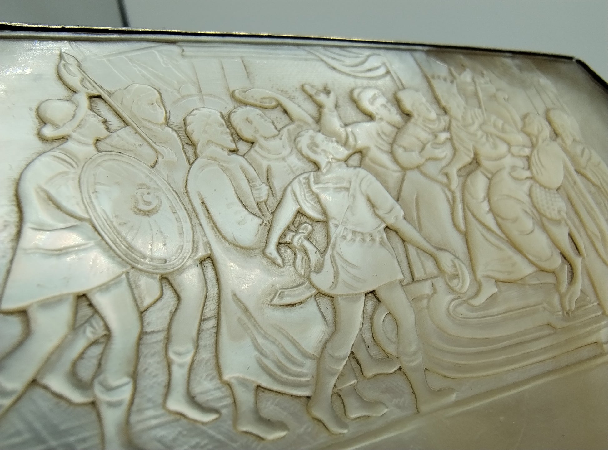 De tabaksdoos dateert uit ca. 1740-1760 en is voorzien van een voortreffelijk gesneden tafereel van Jezus die voorgeleid wordt aan Herodes.