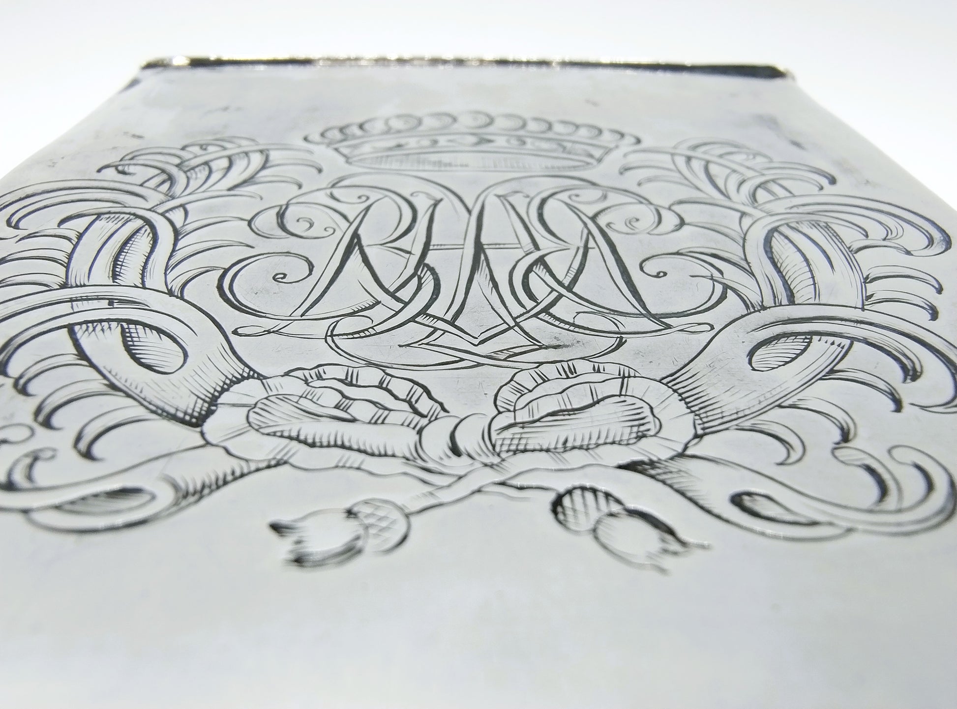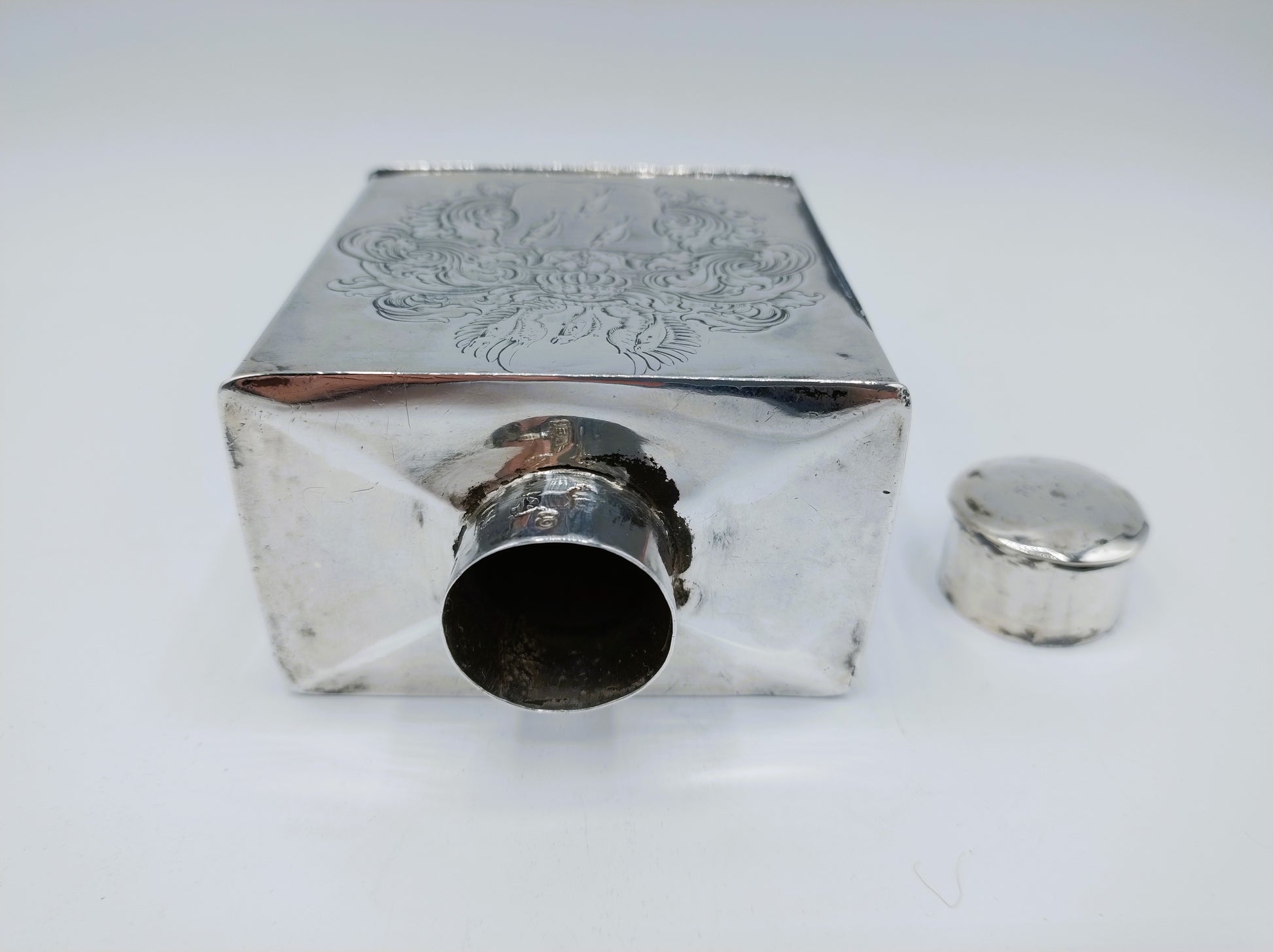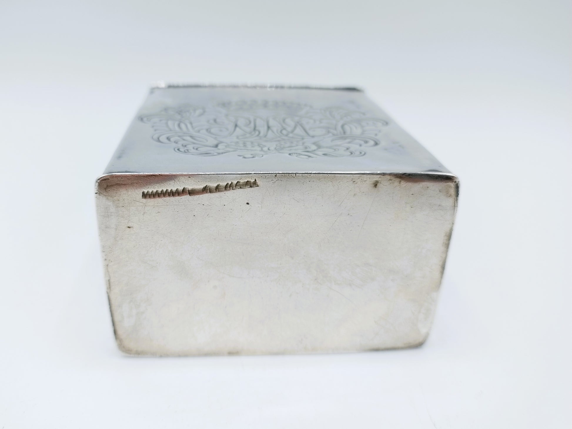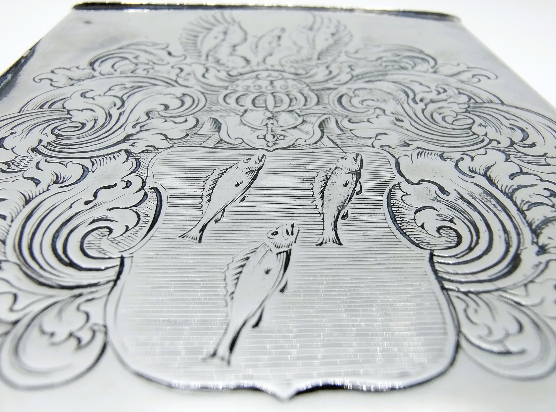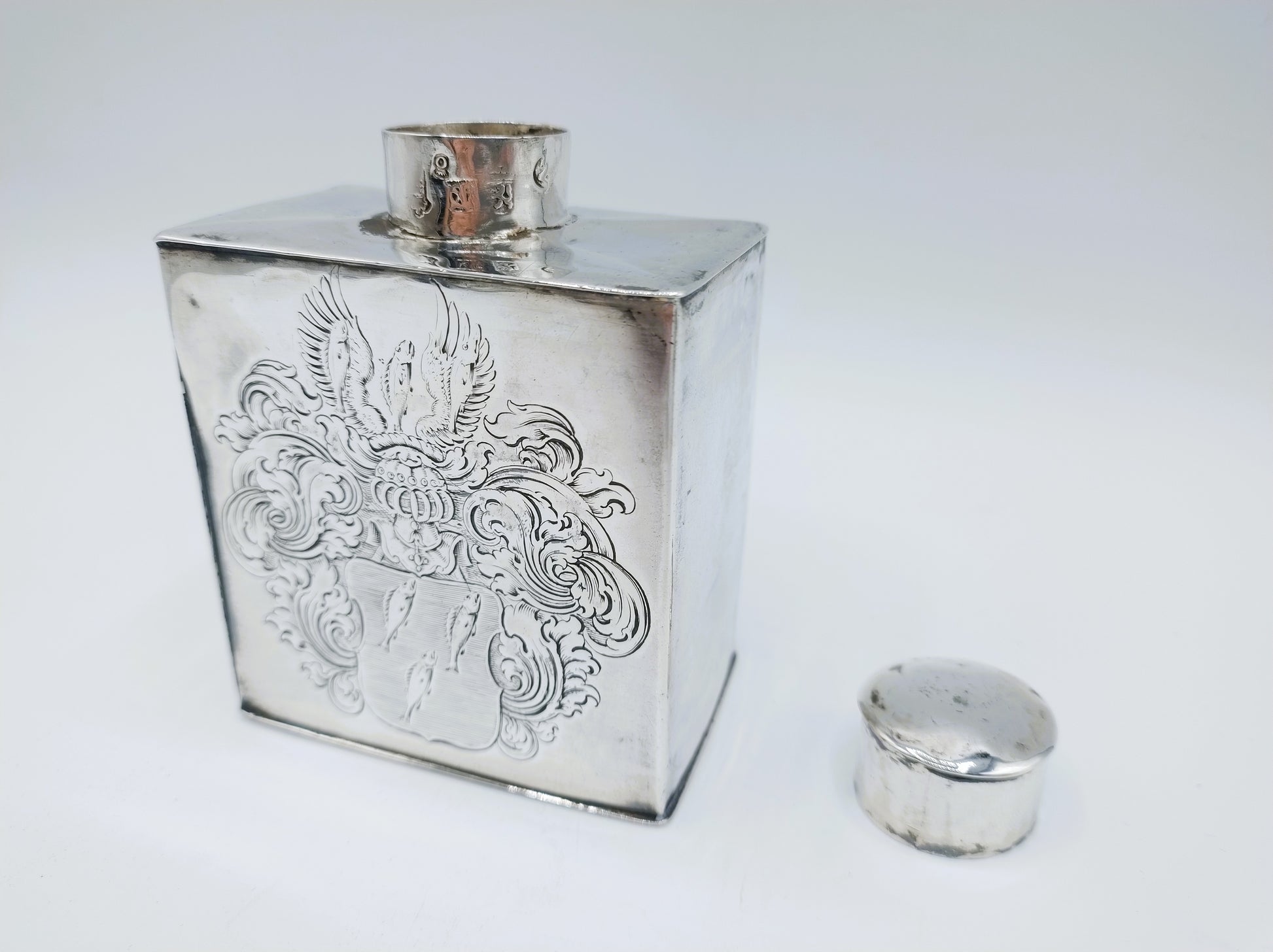 De theebus is voorzien van een wapengravure met 6 vissen aan de ene kant en een lettermonogram BHE (!) onder een baronskroon aan de andere kant.