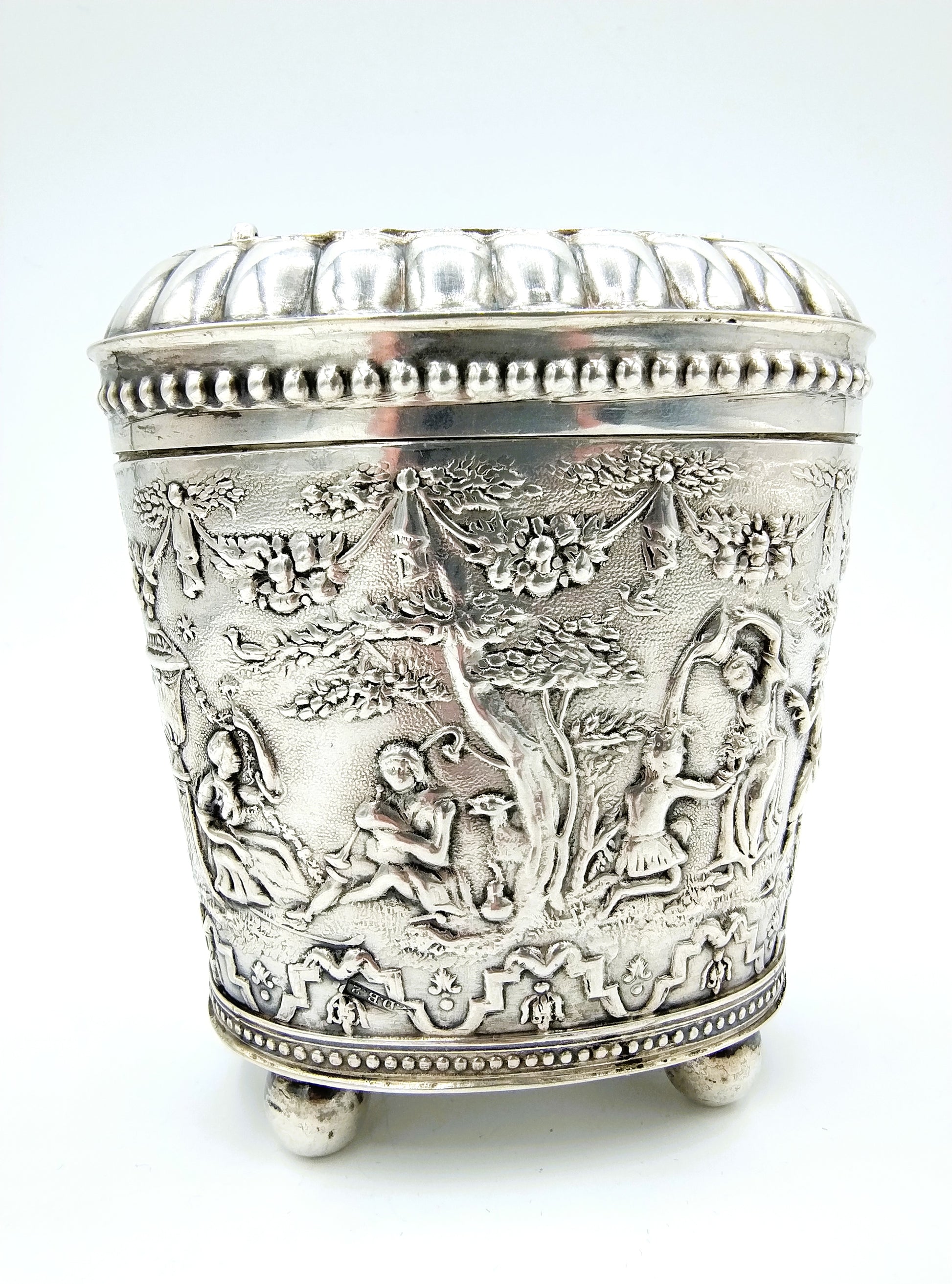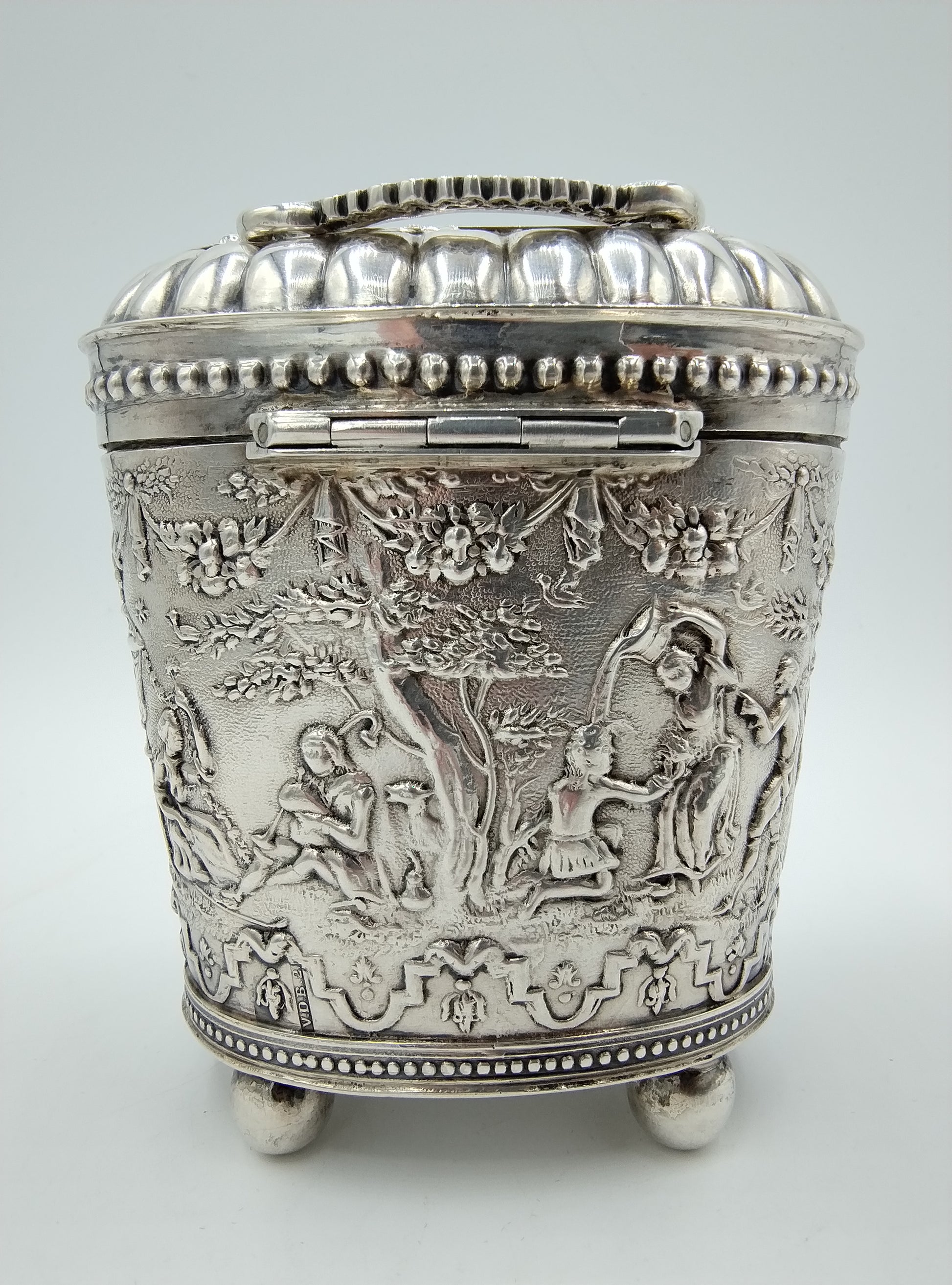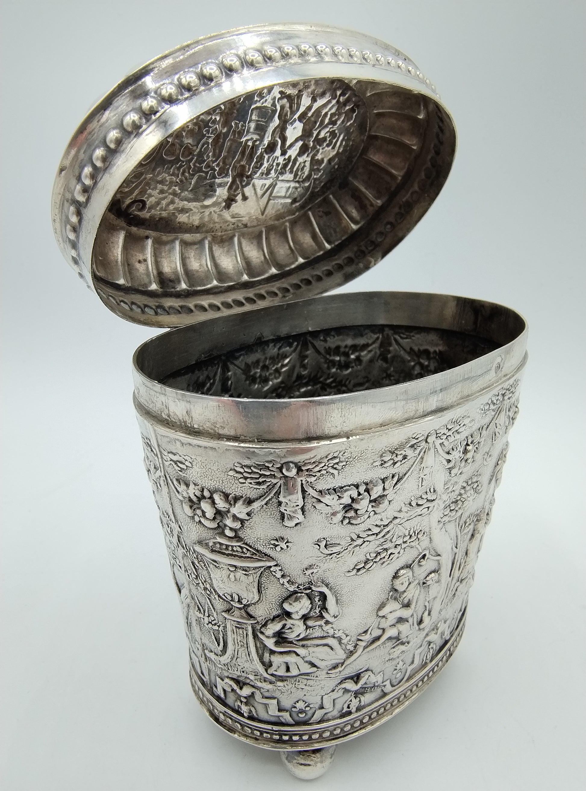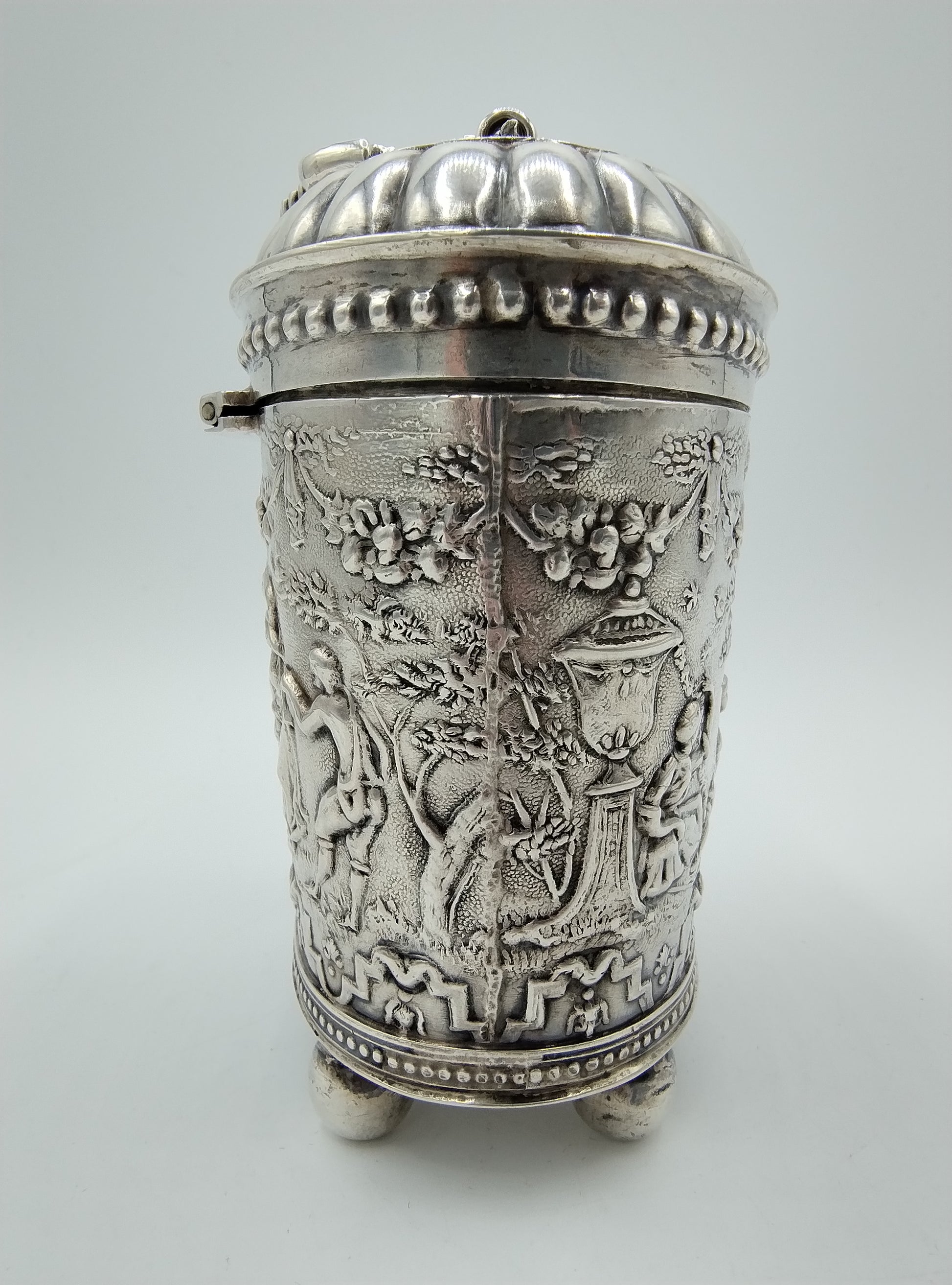 Zilveren theebus met mythologische voorstelling op de zijkant en oud Hollandse voorstelling op het deksel.