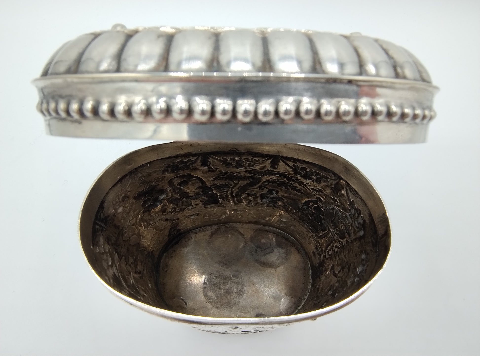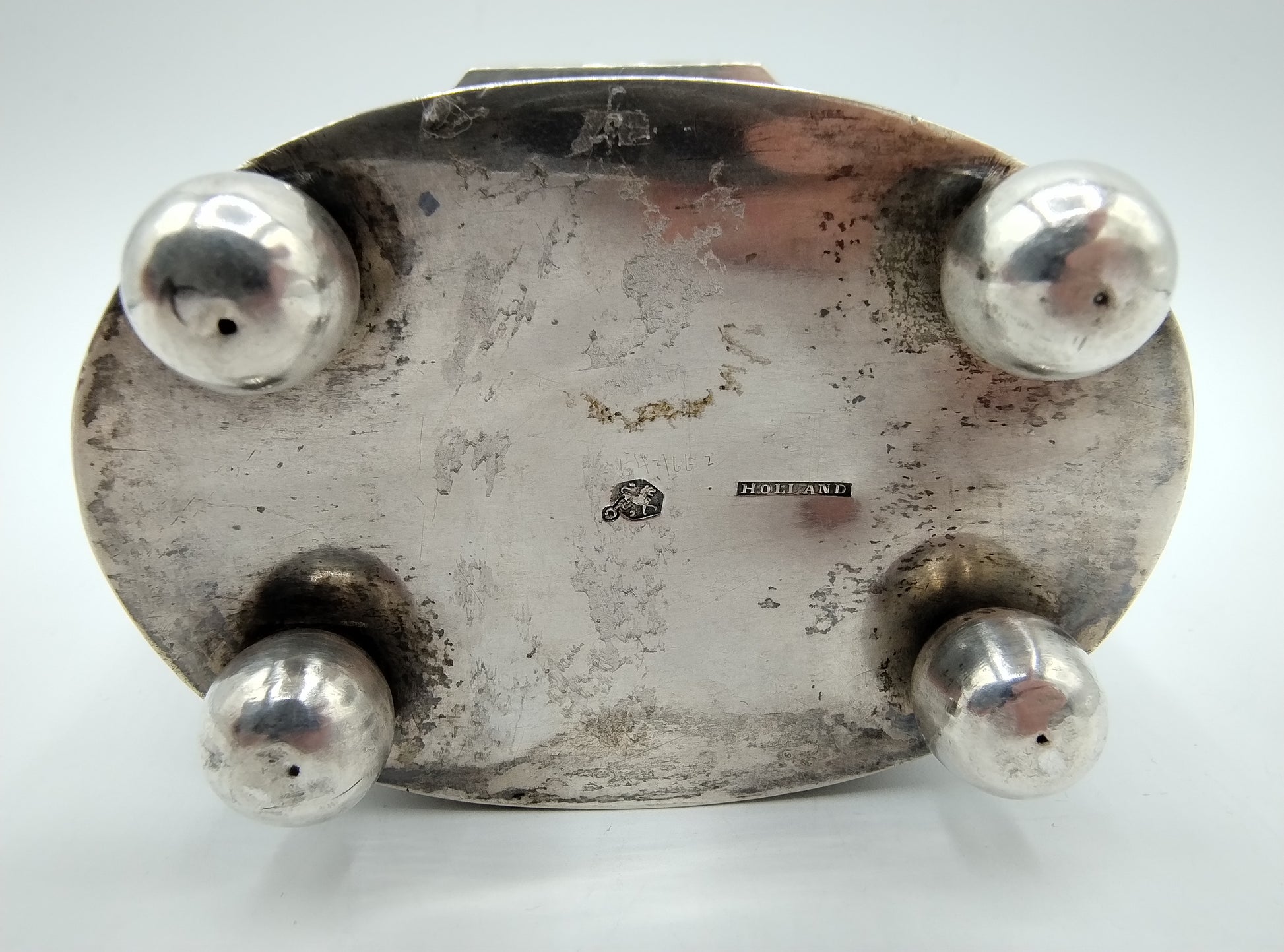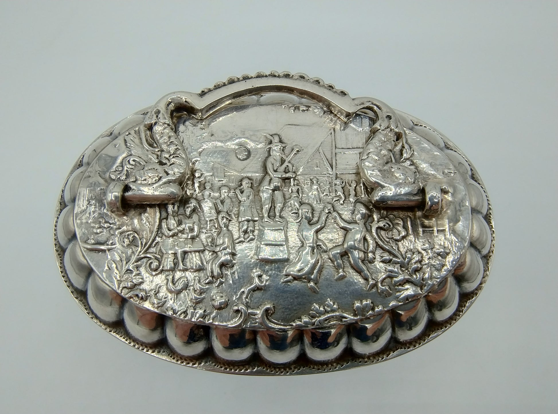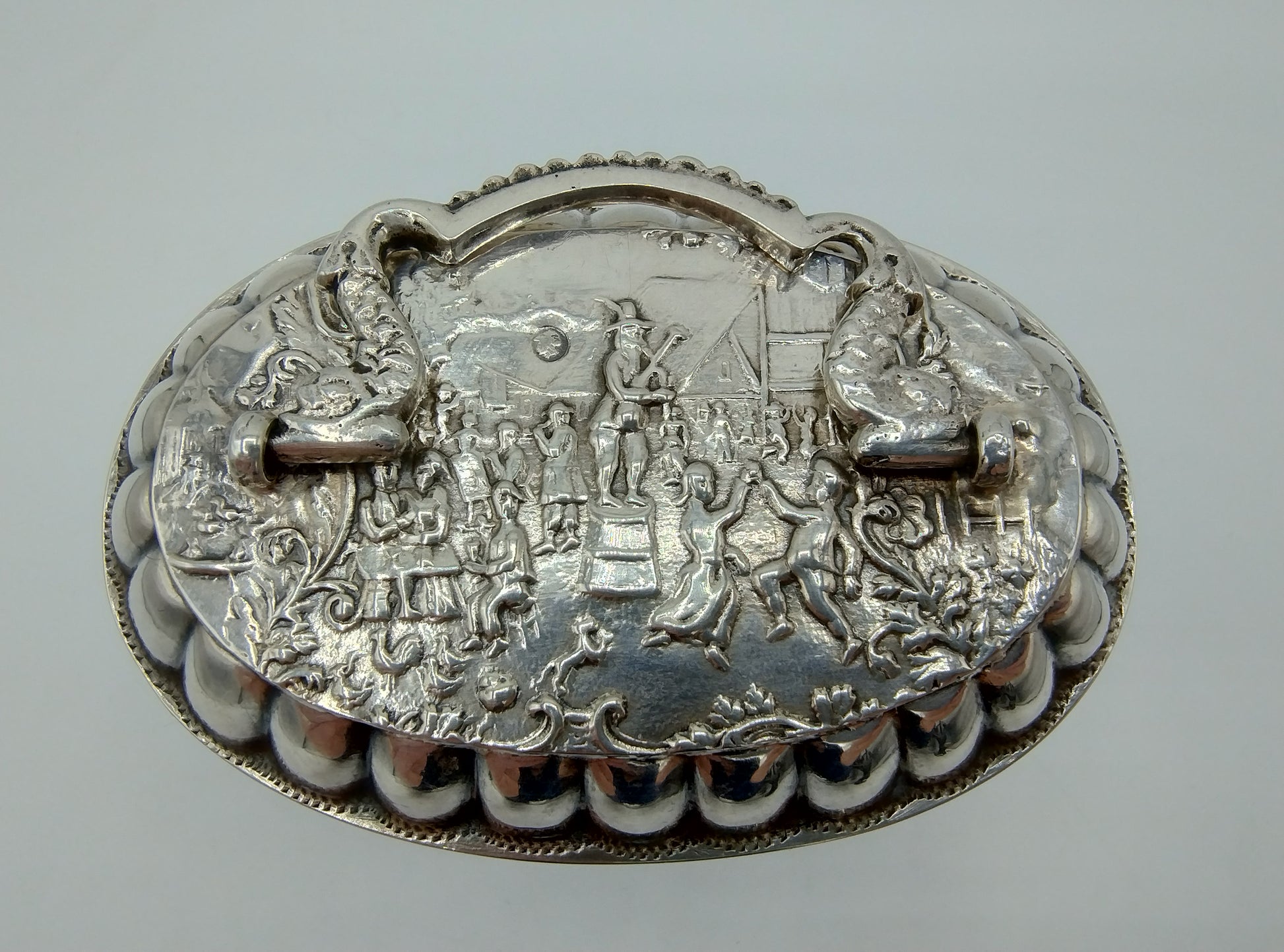 Zilveren theebus met mythologische voorstelling op de zijkant en oud Hollandse voorstelling op het deksel.