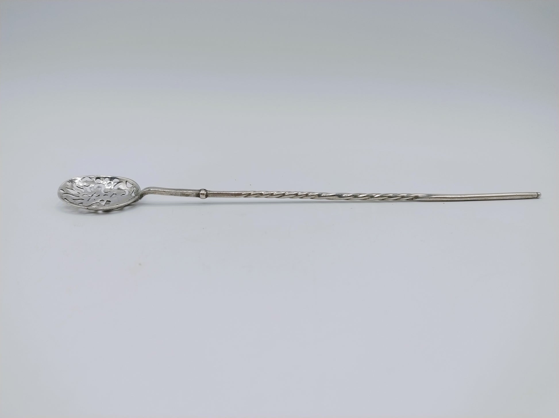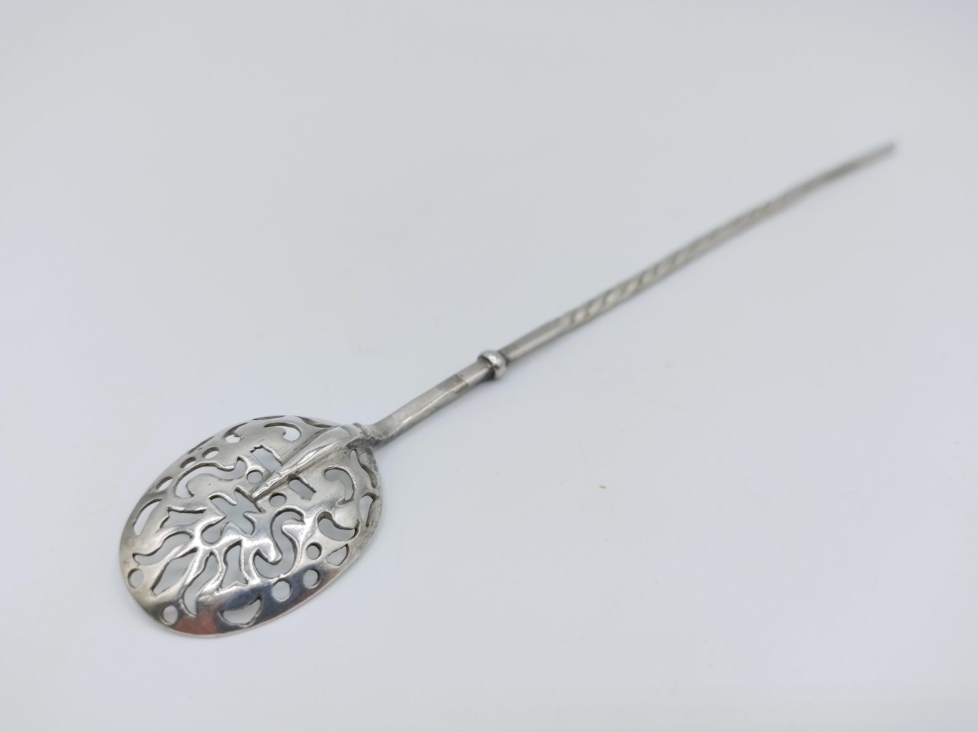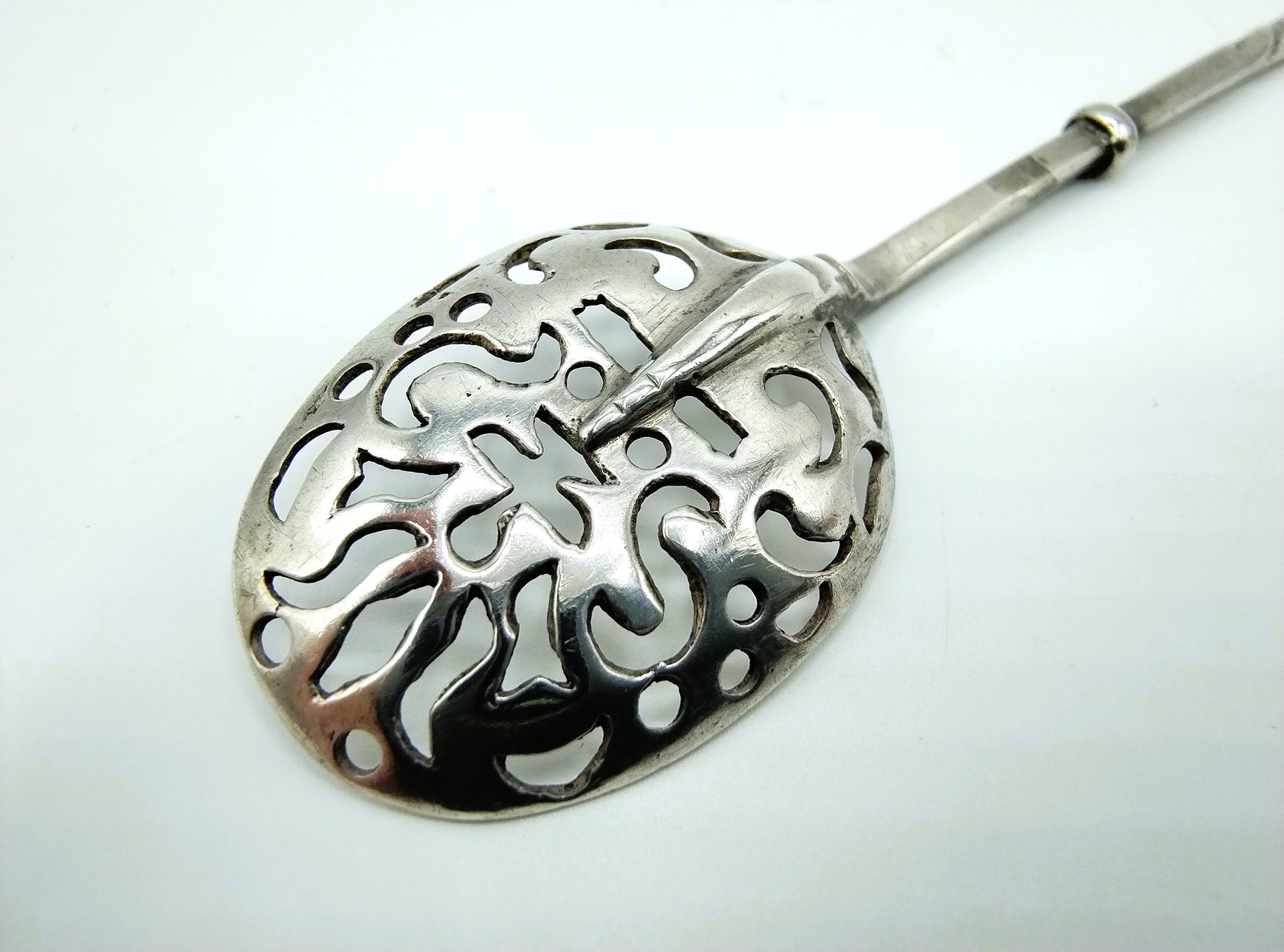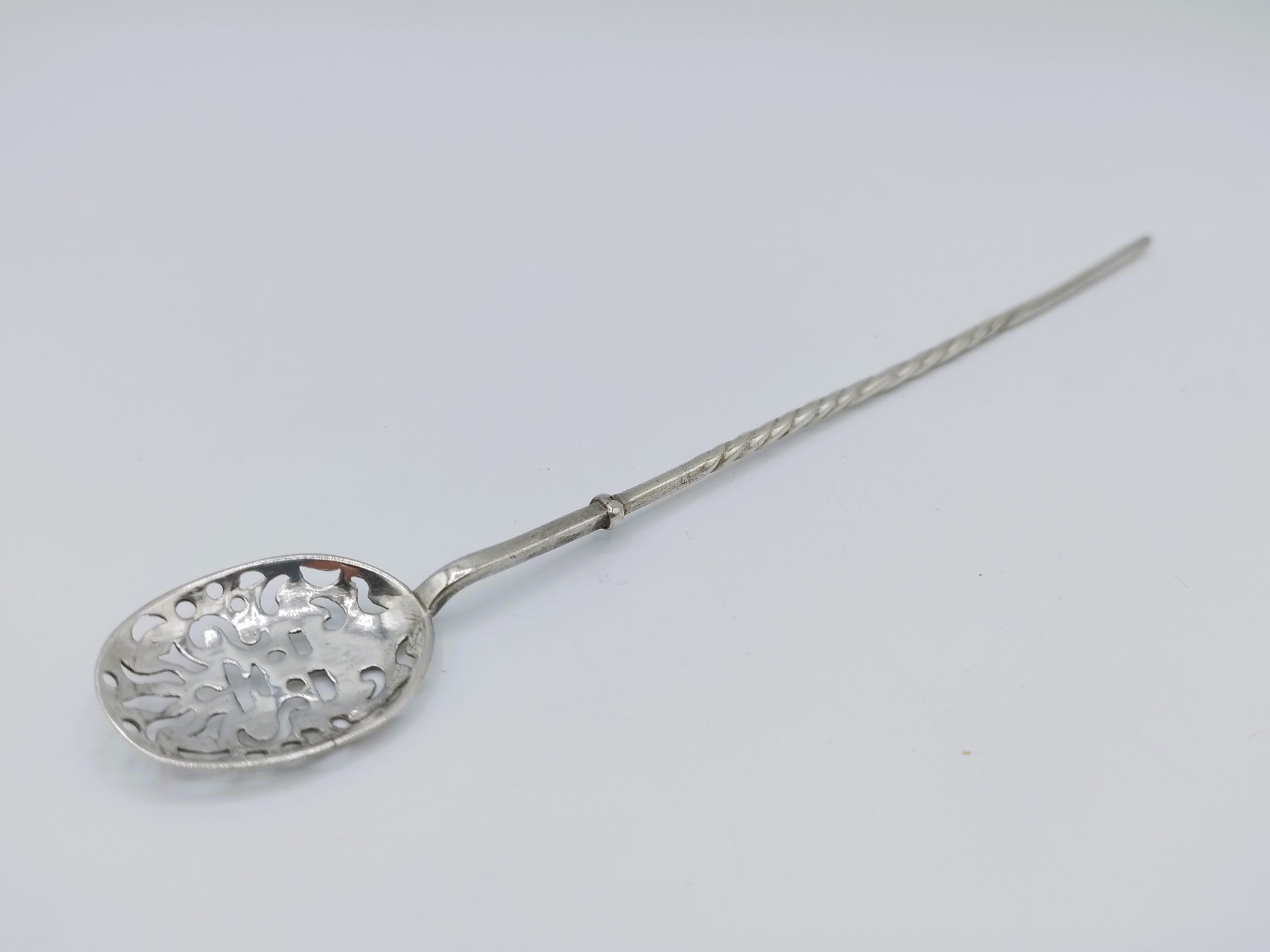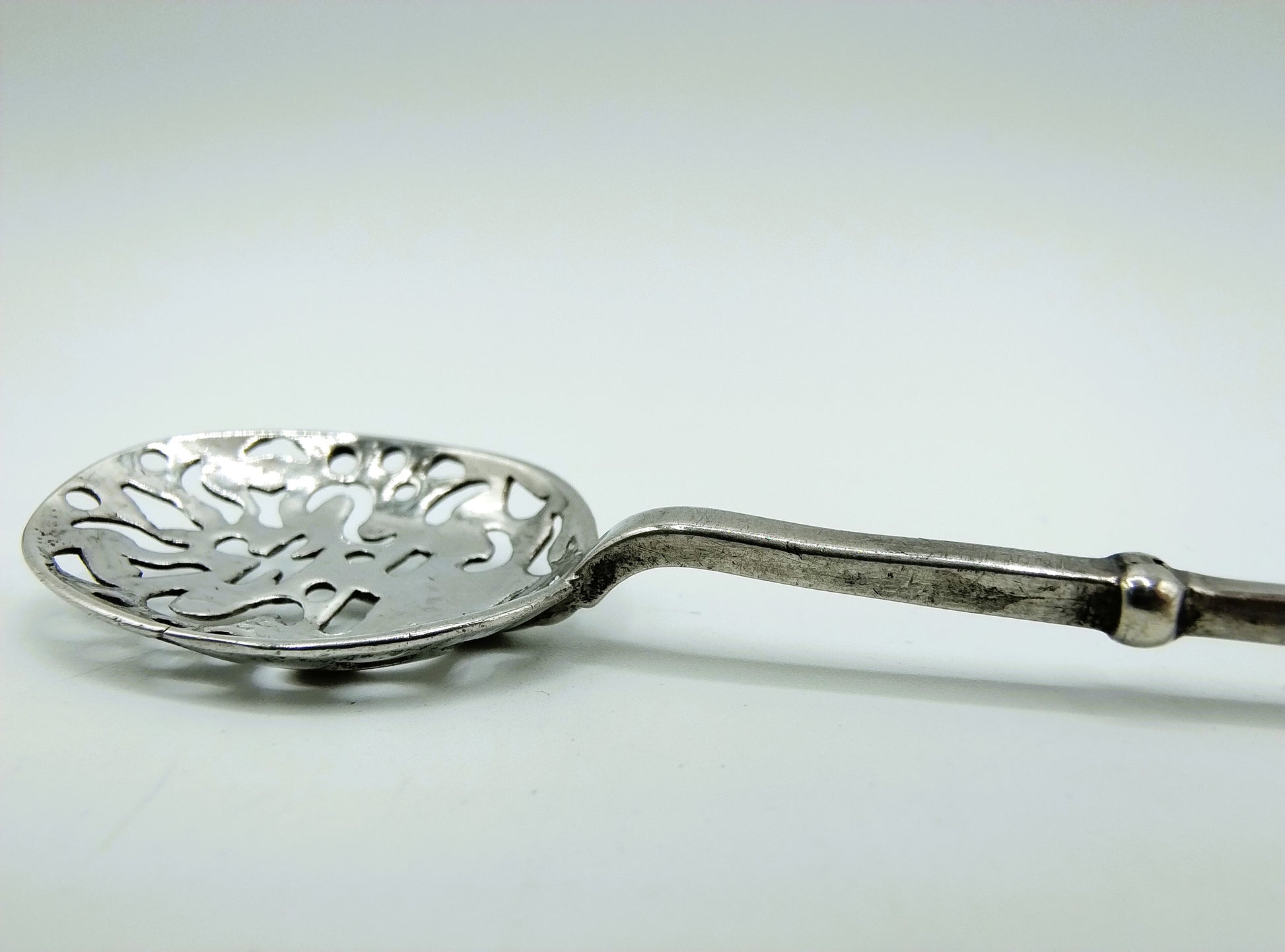 Zilveren 'mote' lepel, gebruikt om theeblaadjes uit het theekopje te zeven als voorloper van het theezeefje.