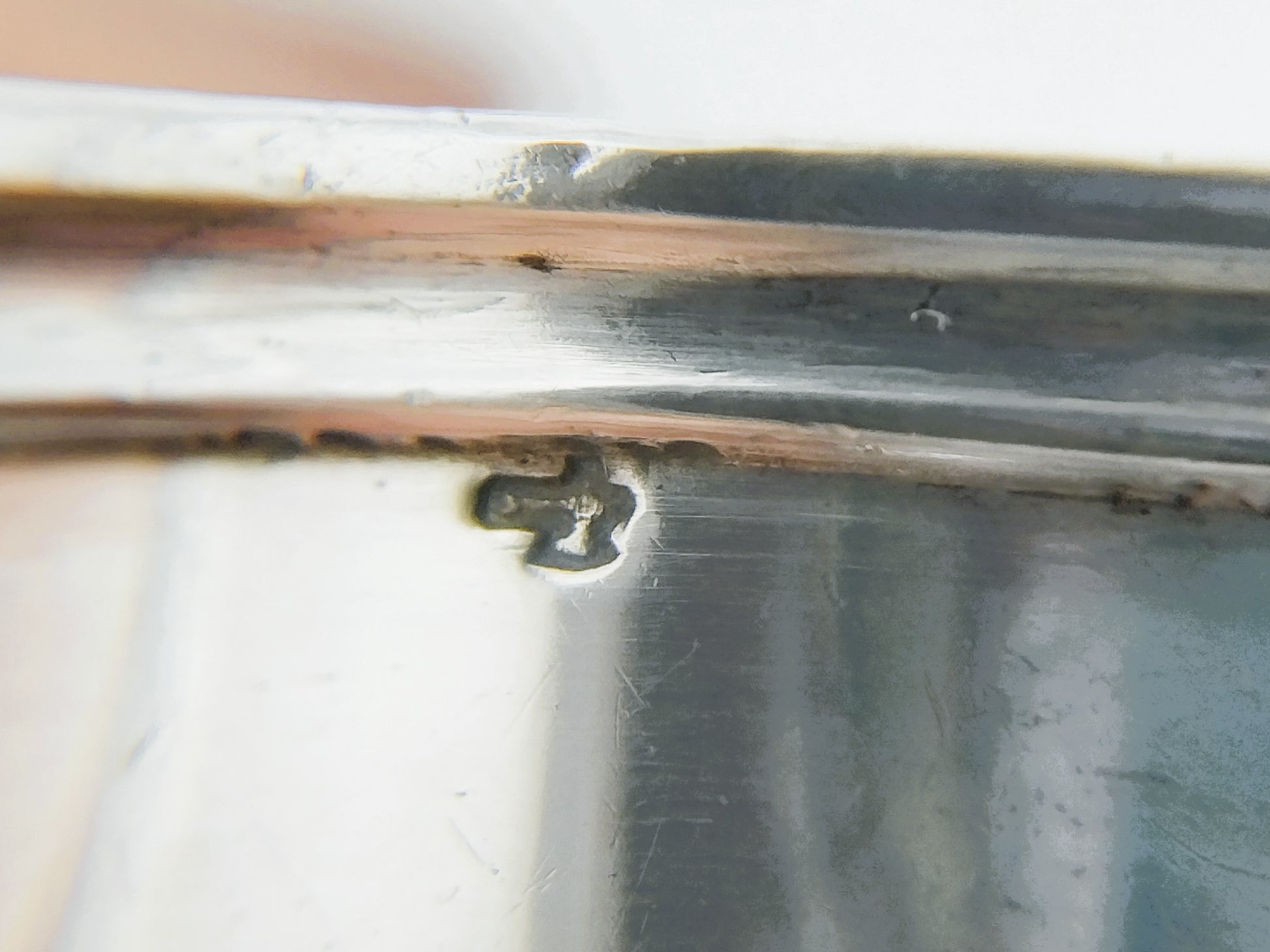 De theezeef is gekeurd met keuren uit de Franse tijd: meesterteken HH, stadskeur van Amsterdam, jaarletter a voor 1807 tot 1809 en het cijfer 10 voor 10 penningen. (833/1000)