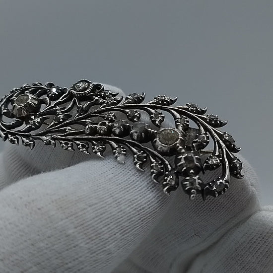 Zilveren veerbroche bezet met ca. 25 roosdiamanten in een dichte zetting. De grootste diamant meet: ca. 2 x 2 mm. De kleinste: 1 x 1 mm.
