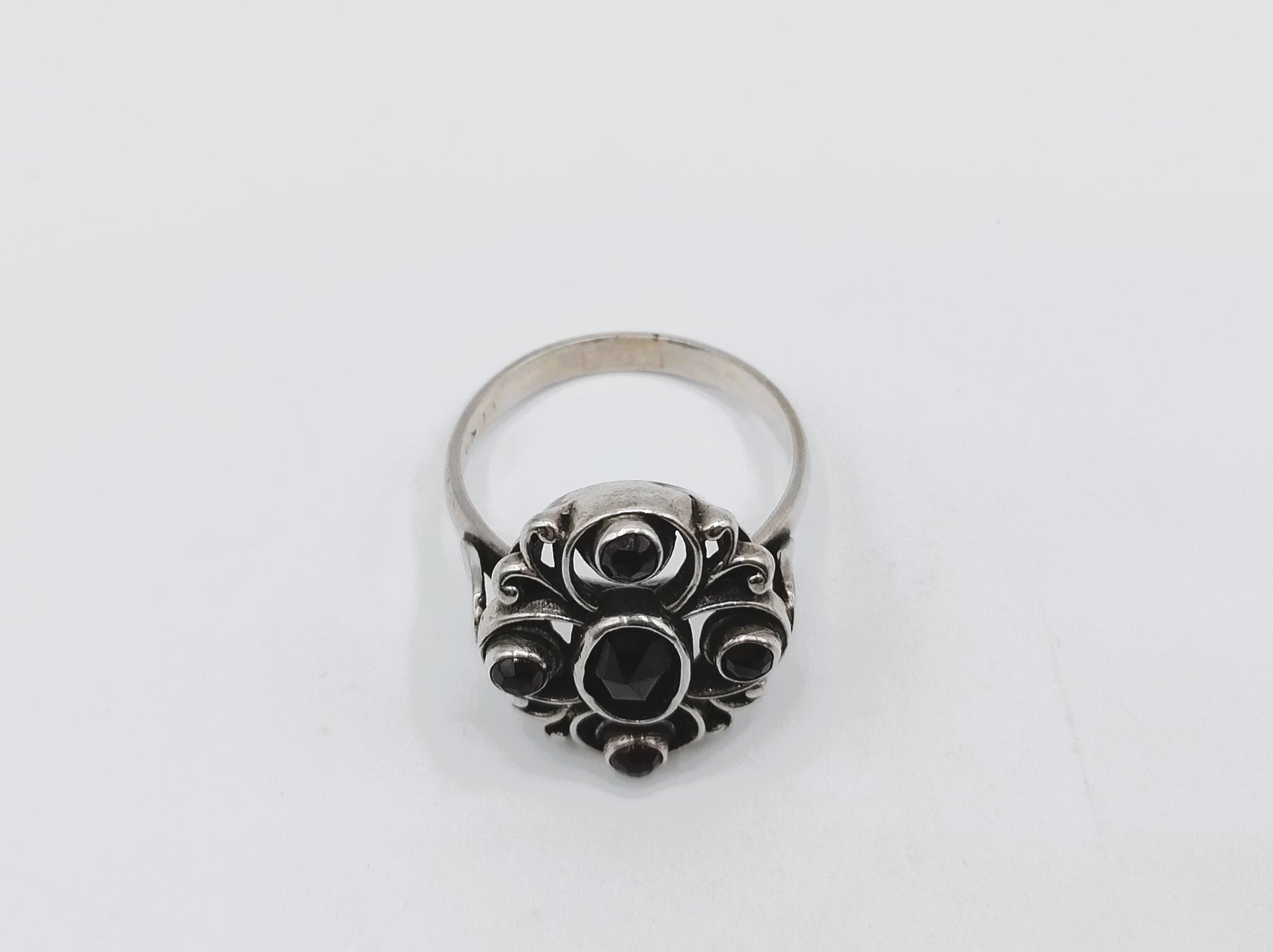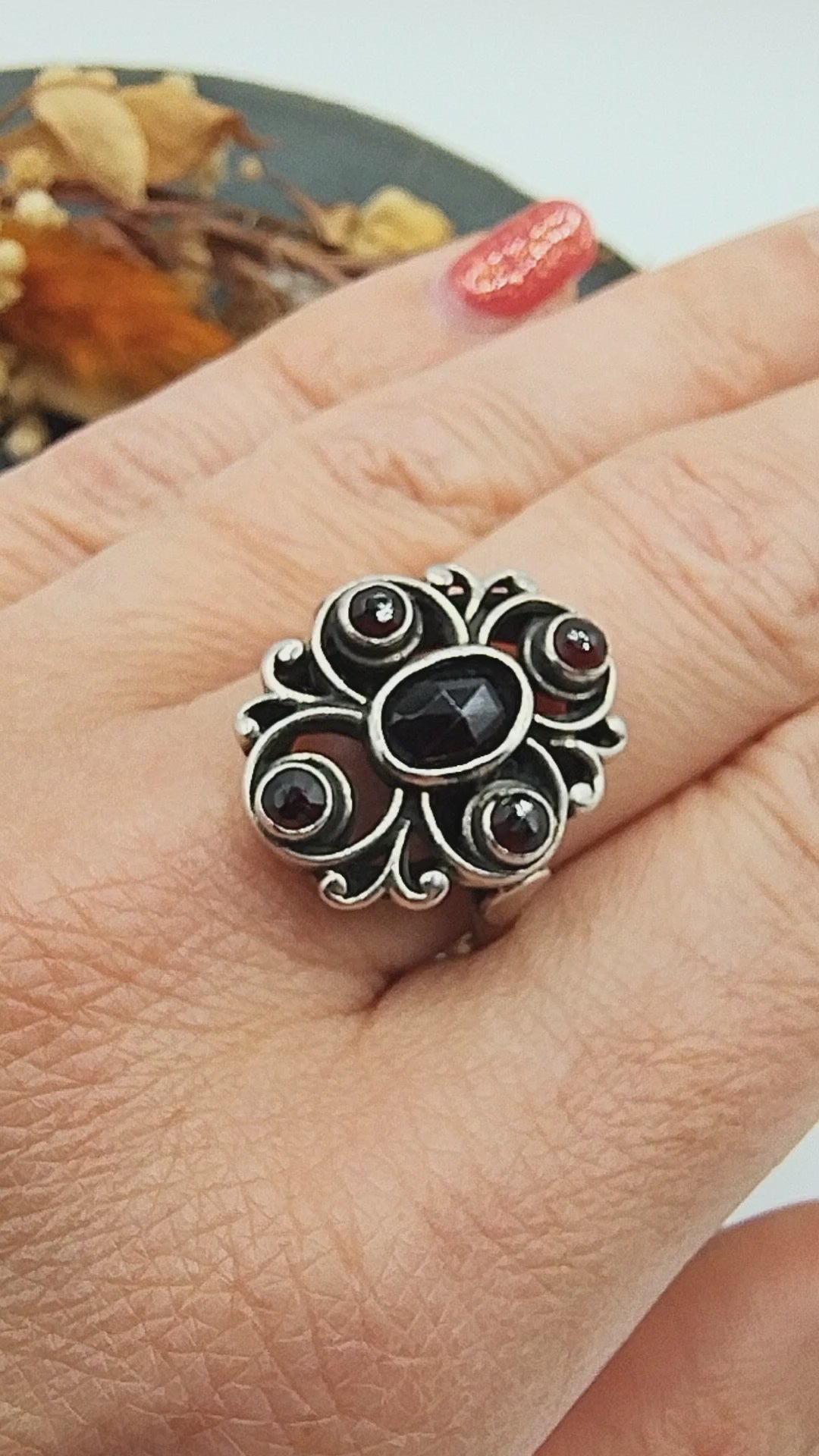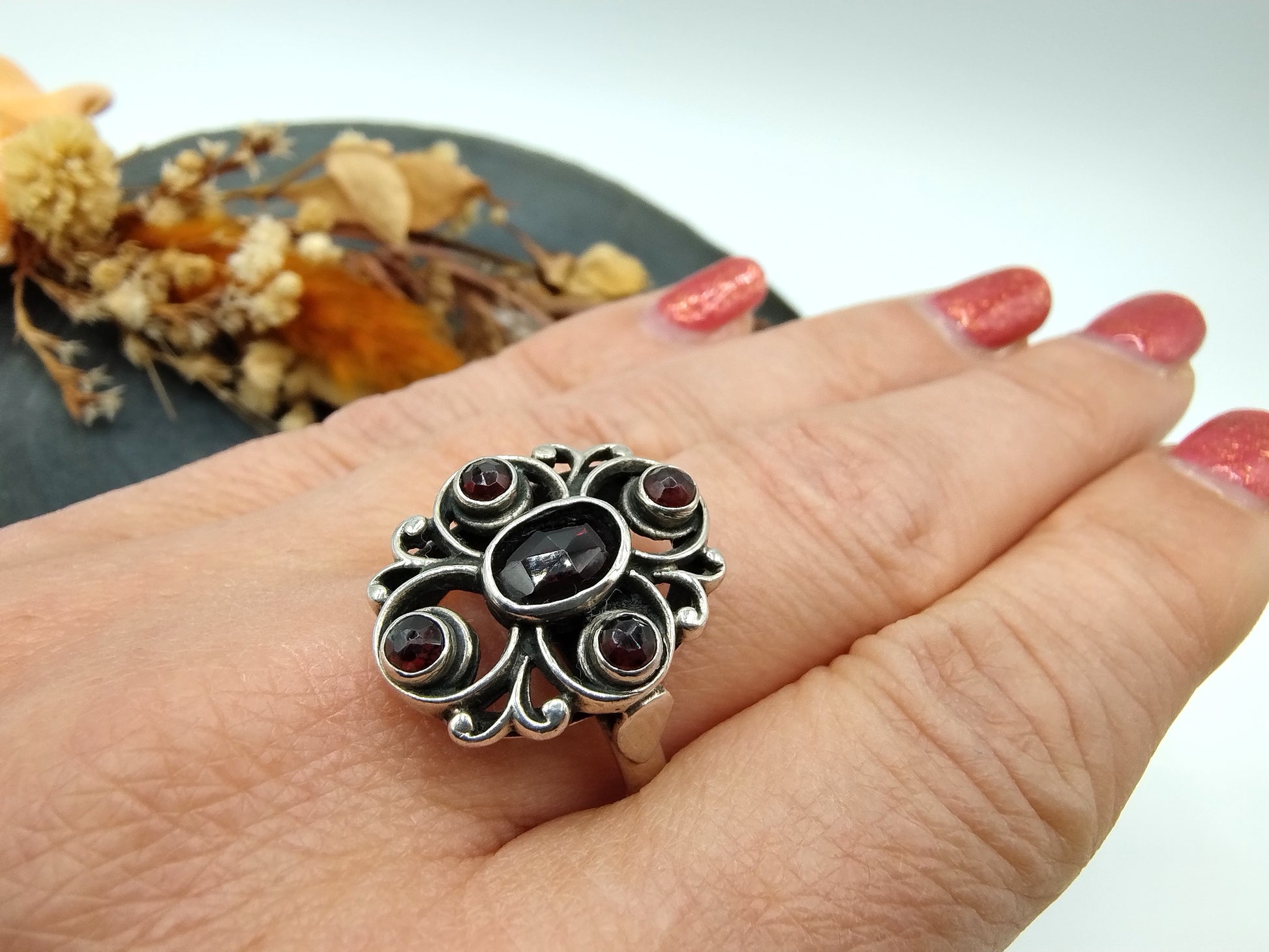 Zilveren vintage ring met 5 geslepen granaten, 19,5 mm
