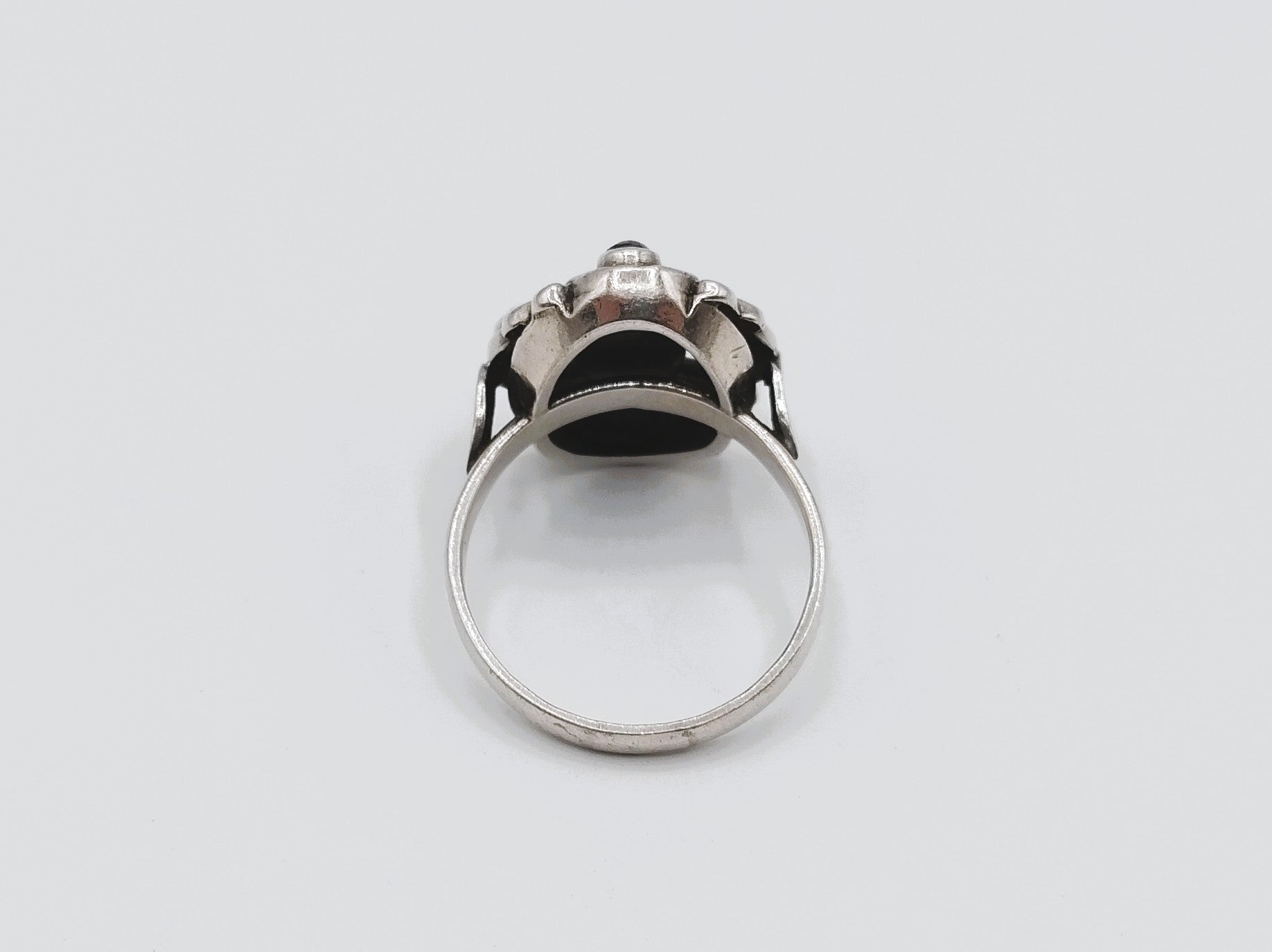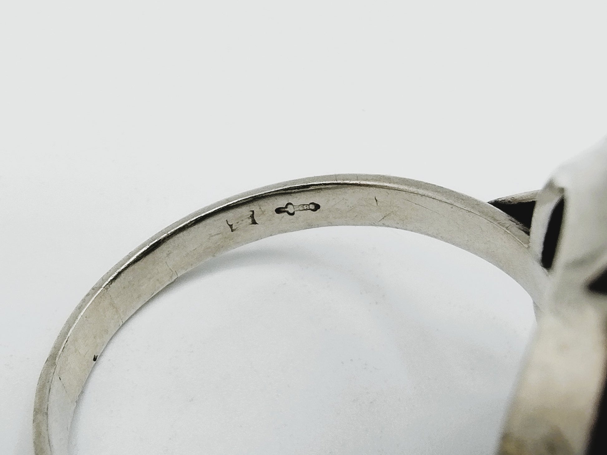 De ring is gekeurd met 835 voor 2e gehalte zilver en een moeilijk leesbaar meesterkeur.