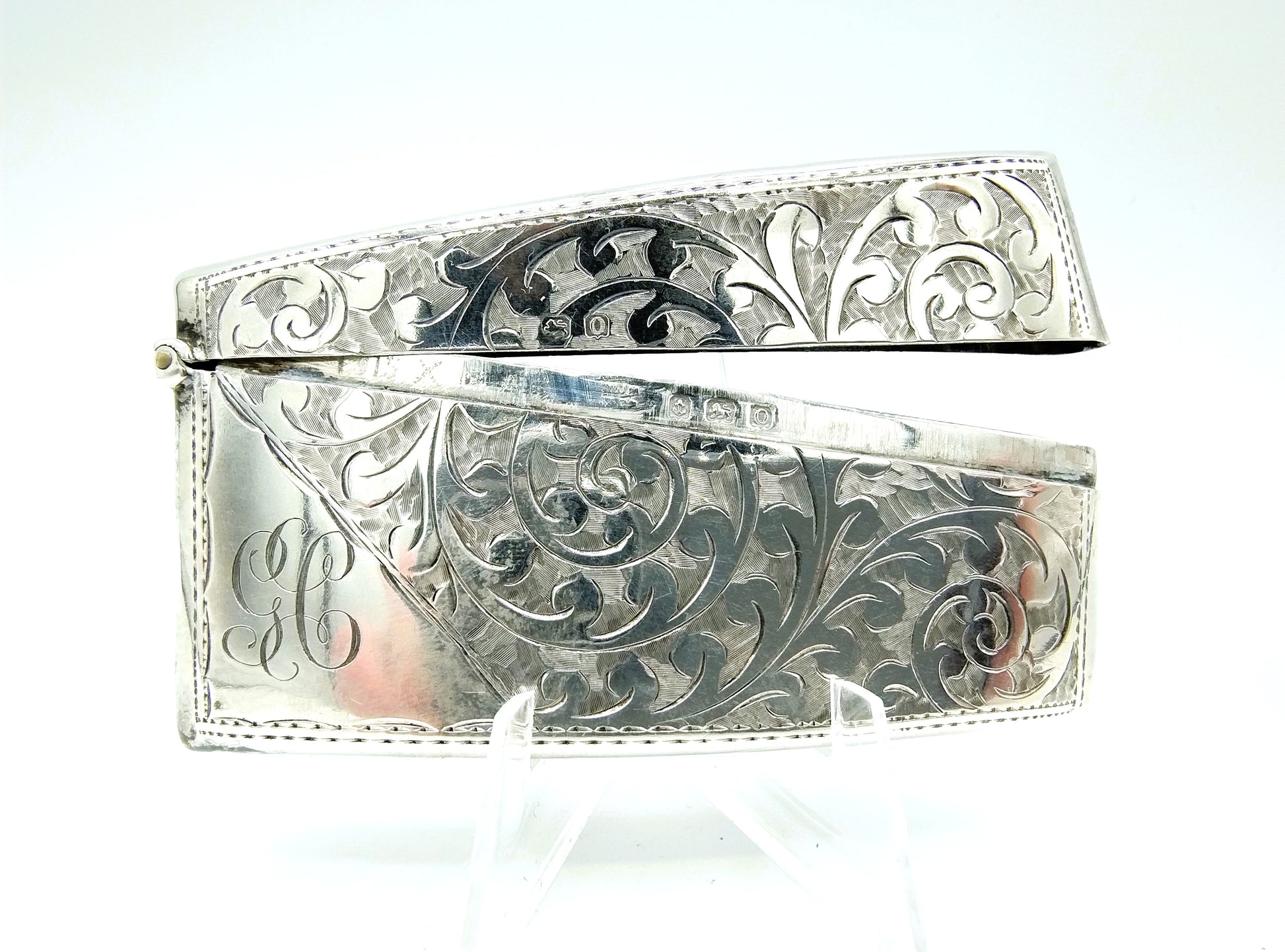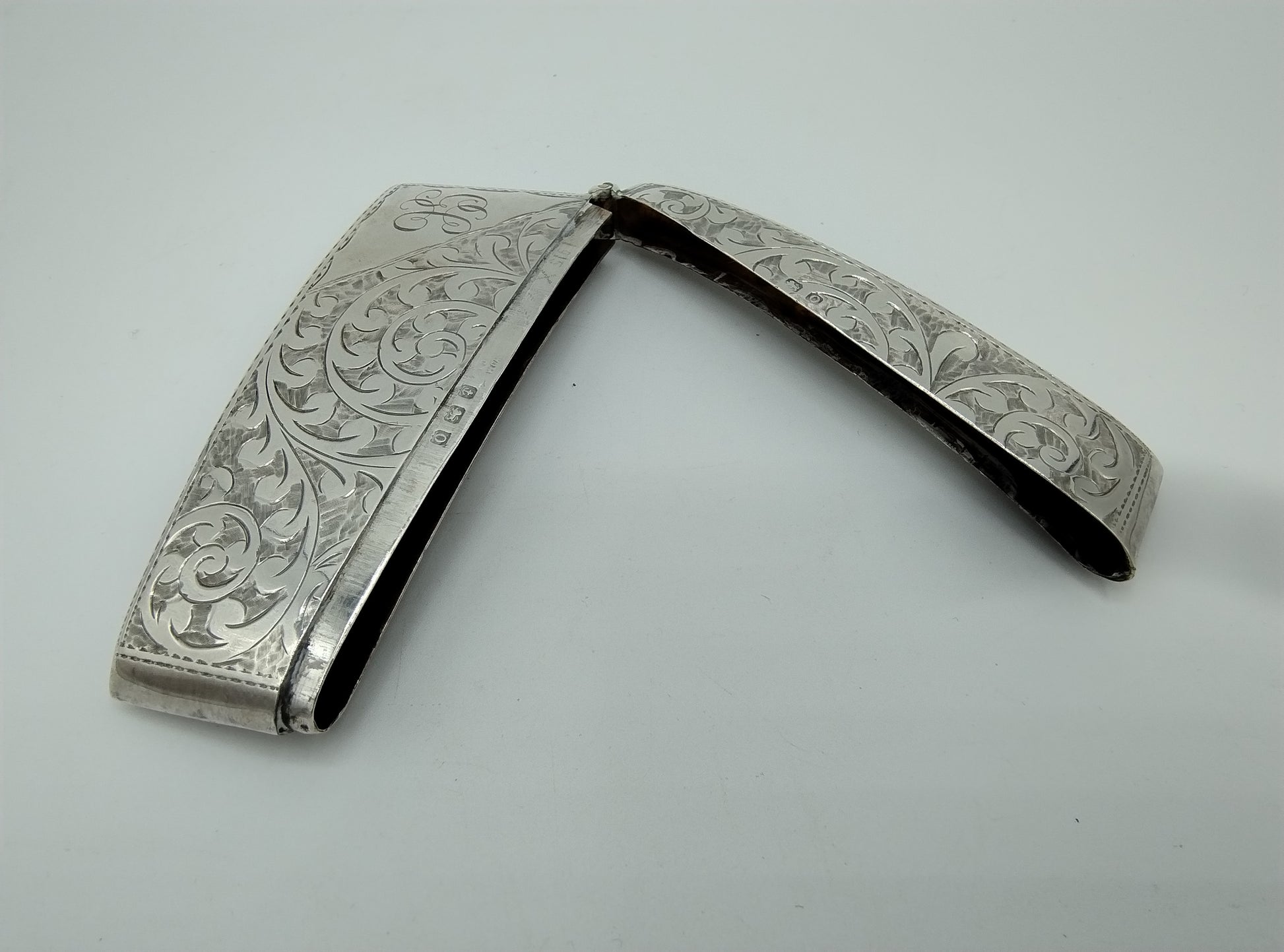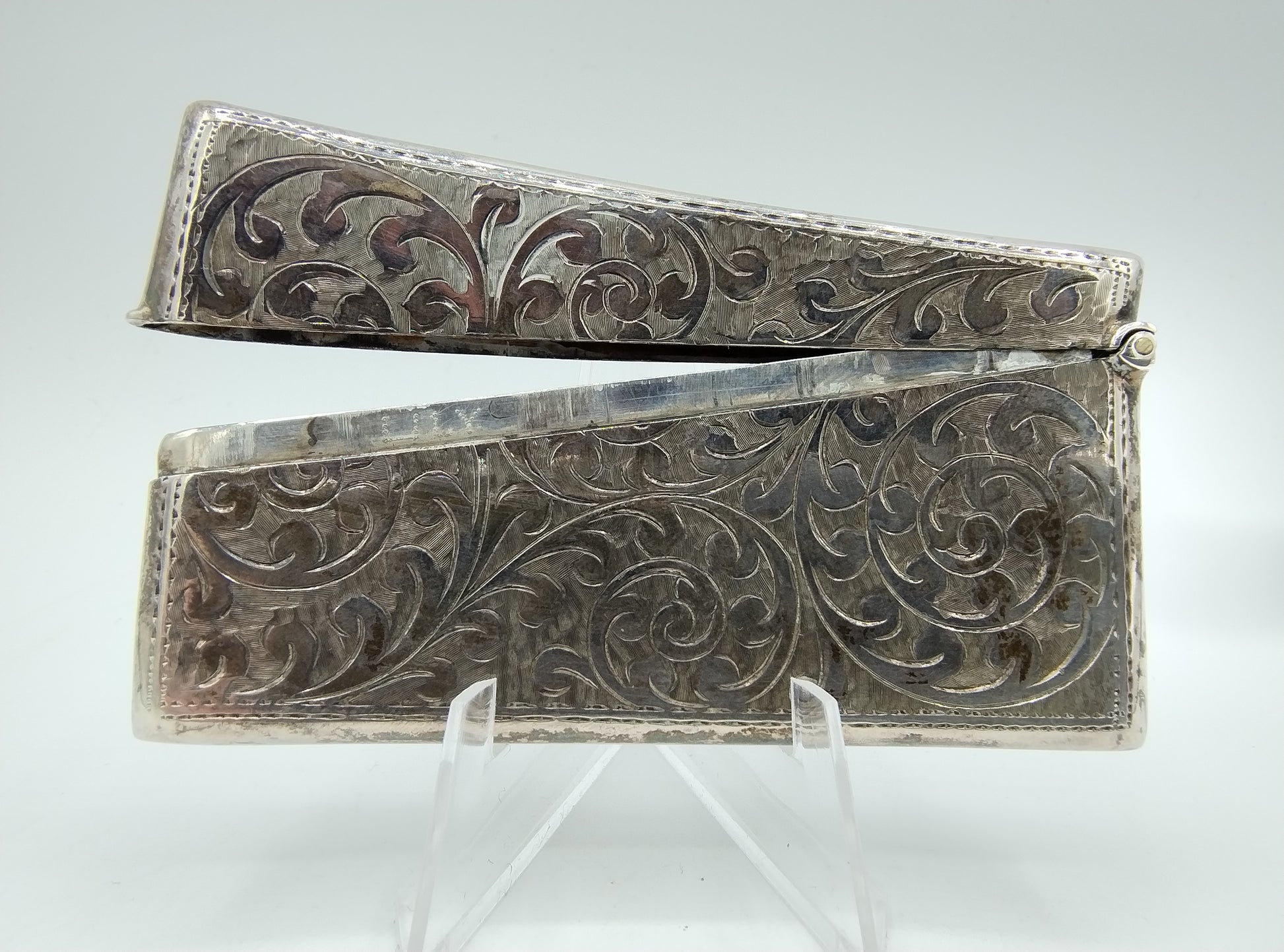 Edwardiaans zilveren kaartenhouder in elegante gebogen vorm (past precies in de zak of het vest), met scharnierende klep en fraai gegraveerd met krulversiering.