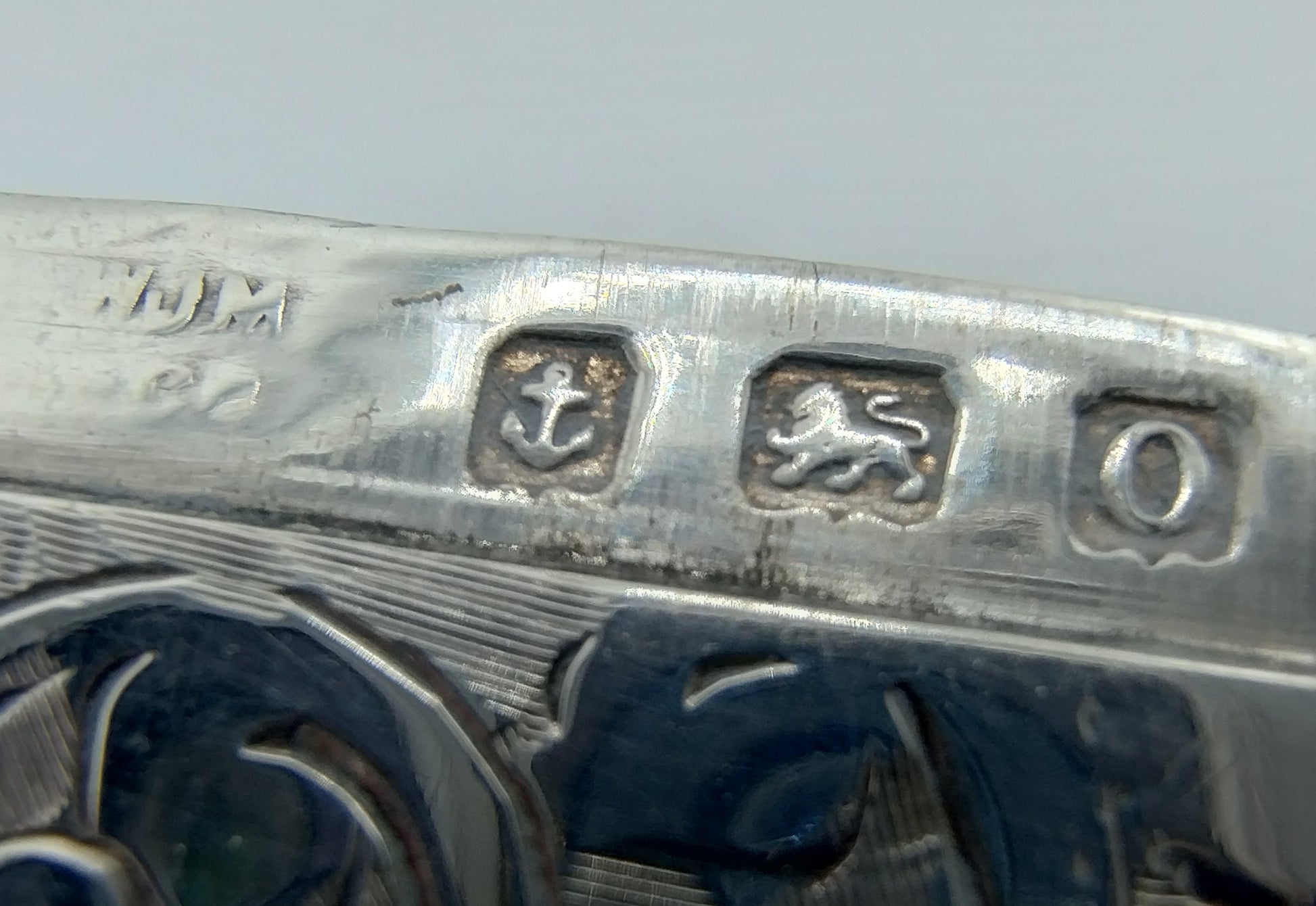 Zowel op het deksel als de behuizing gemerkt met de jaarletter O voor 1913, anker voor Birmingham, gehaltekeur en meesterkeur WJM & Co van de Fa. W J Myatt & Co, werkzaam van 1902 tot 1946.