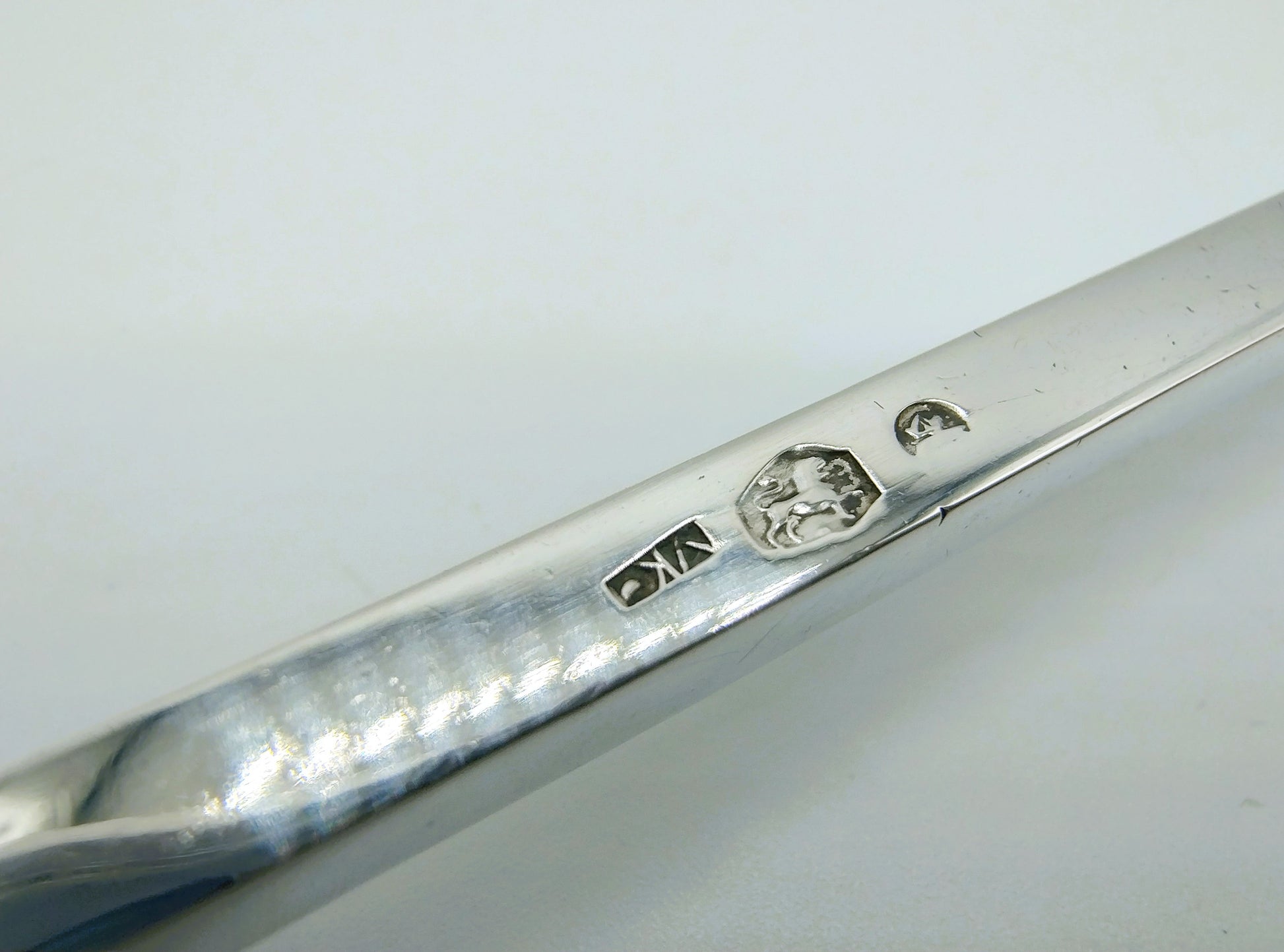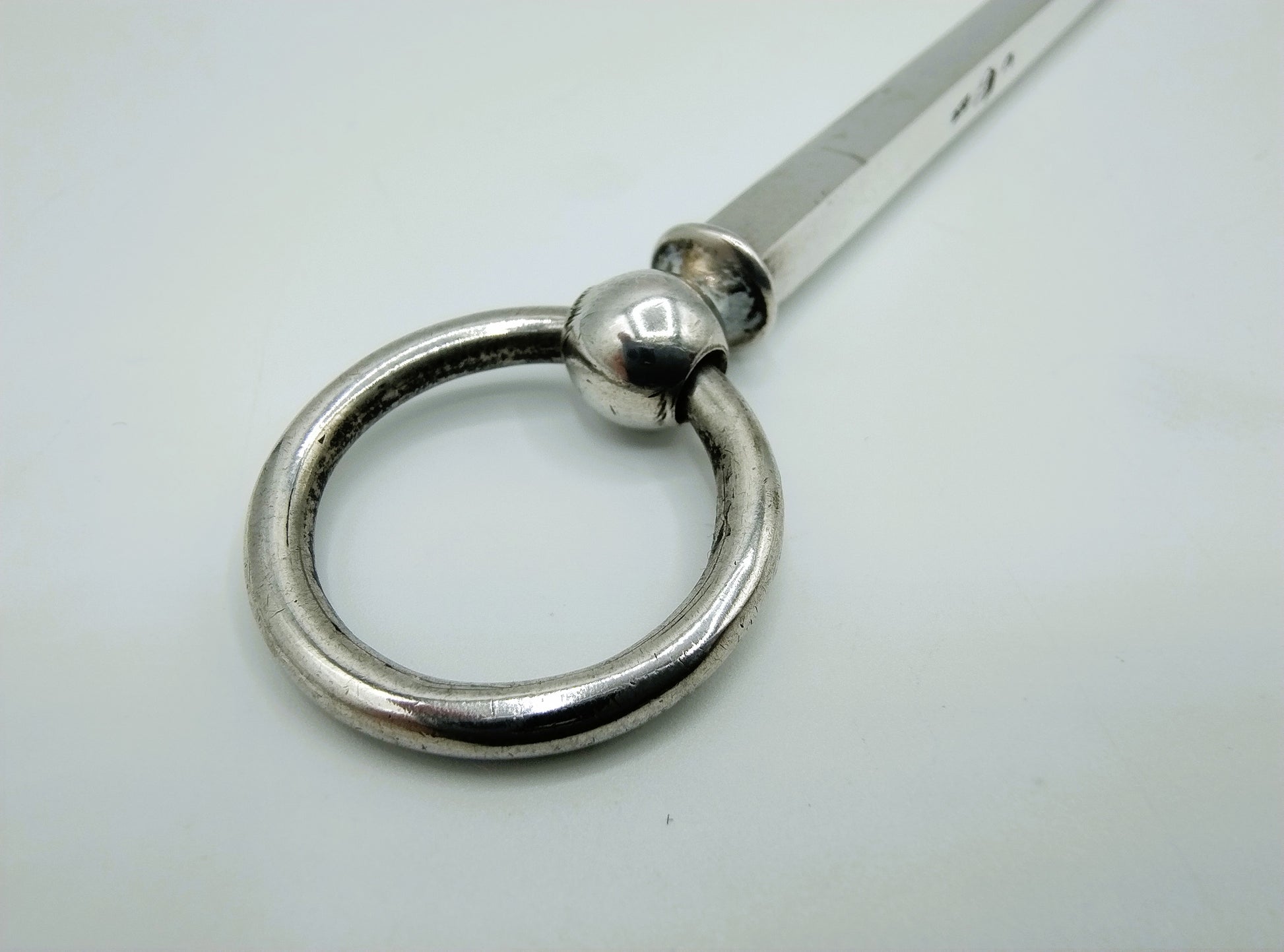 Hollandse zilveren vleespen gemaakt door de fa. J.M. van Kempen uit Voorschoten. Het keur is gebruikt tussen 1858 en 1924