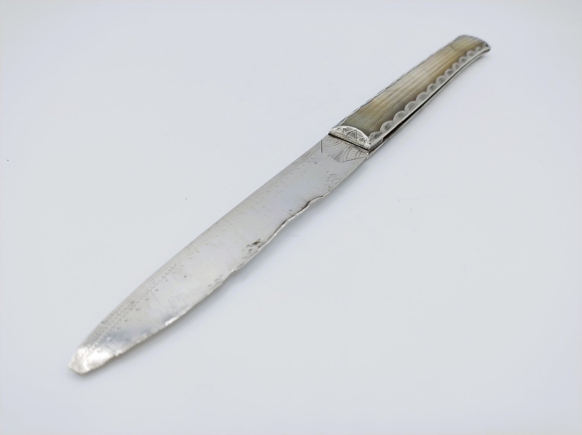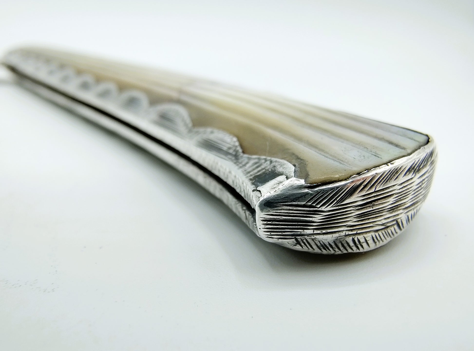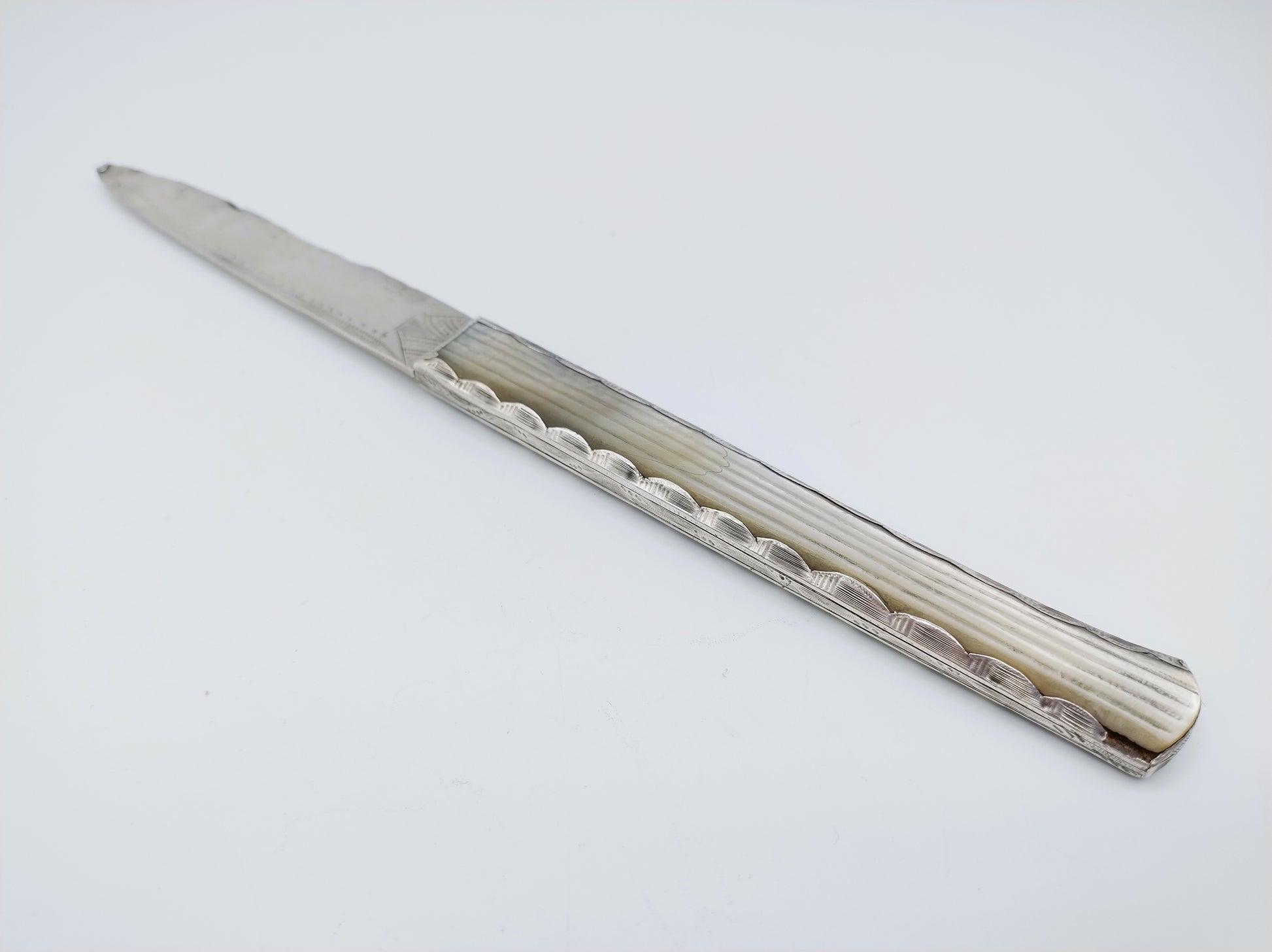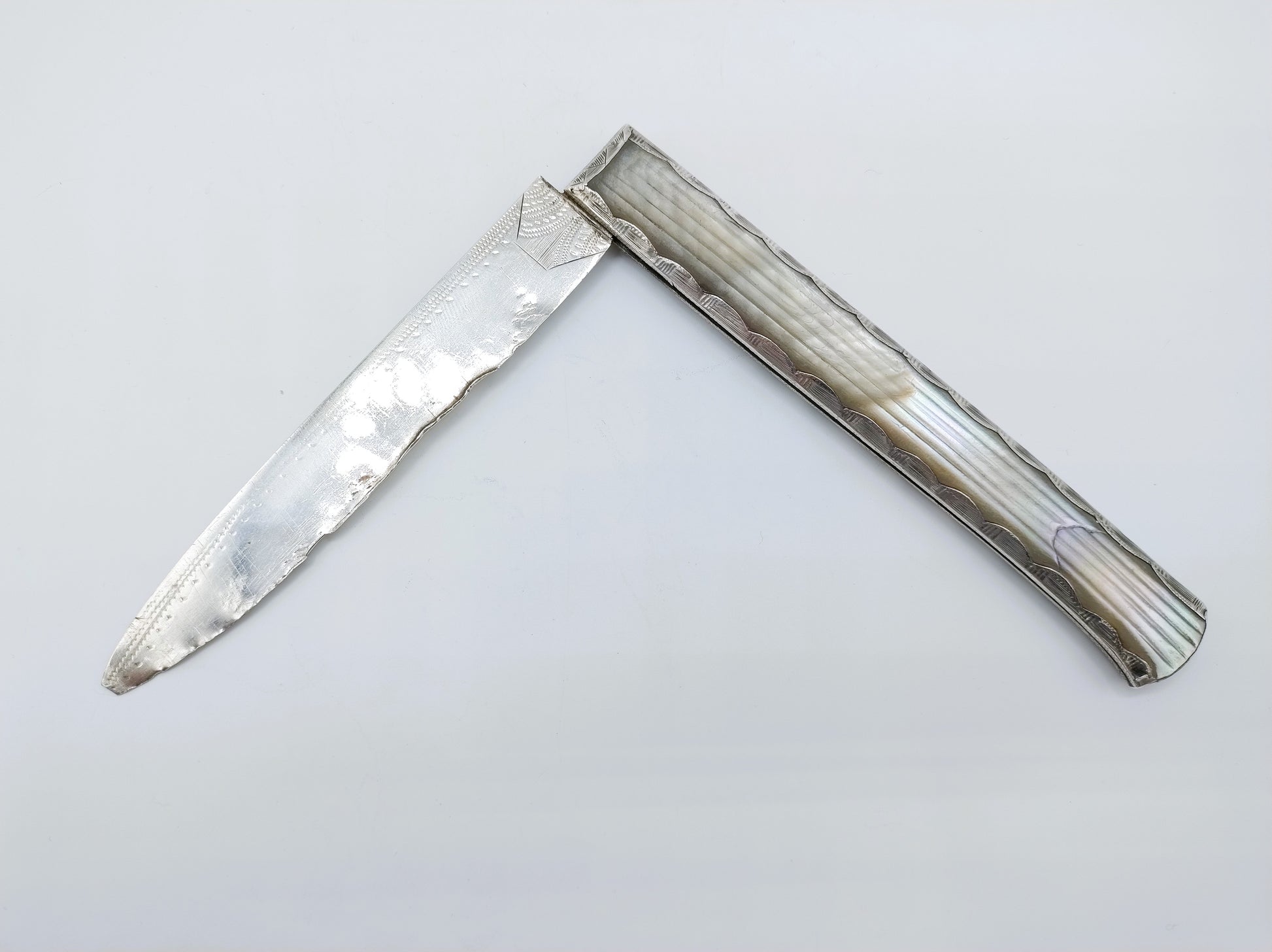 Groot zilveren zakmes met parelmoeren handvat. Het handvat is voorzien van een ribmotief.