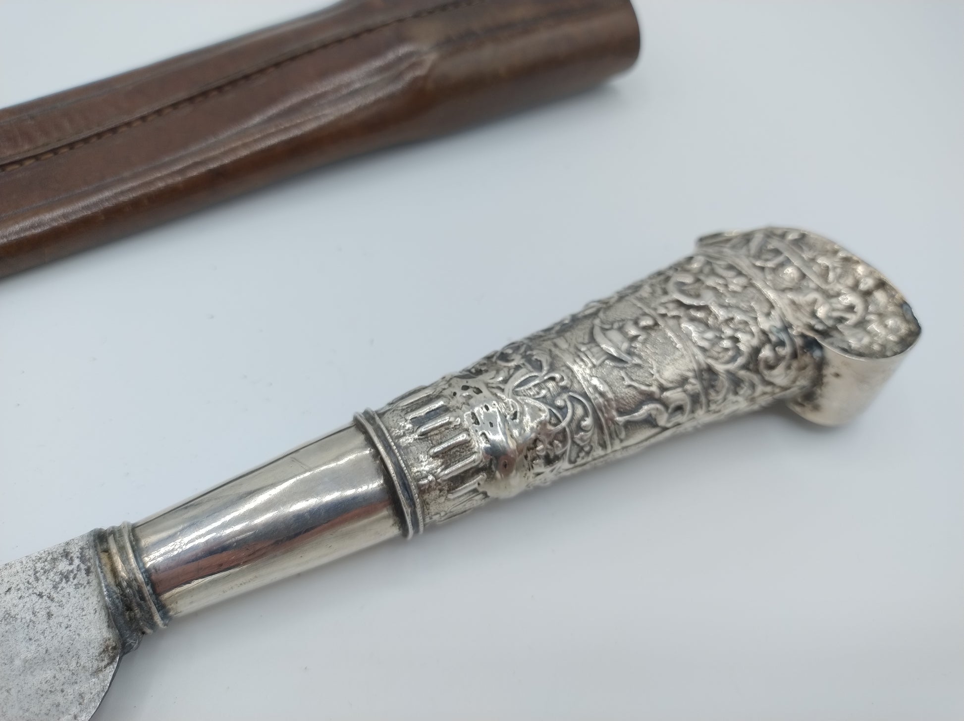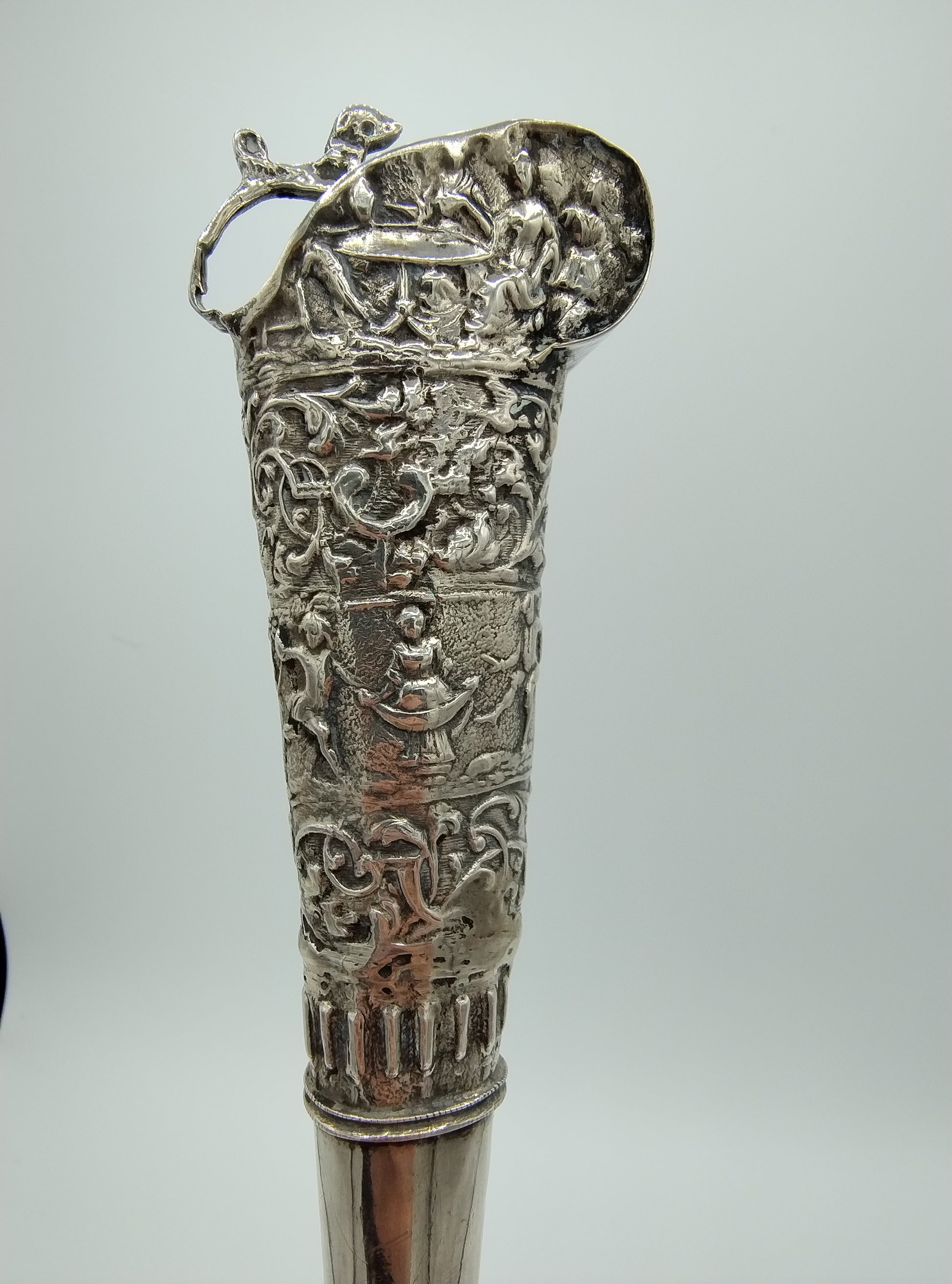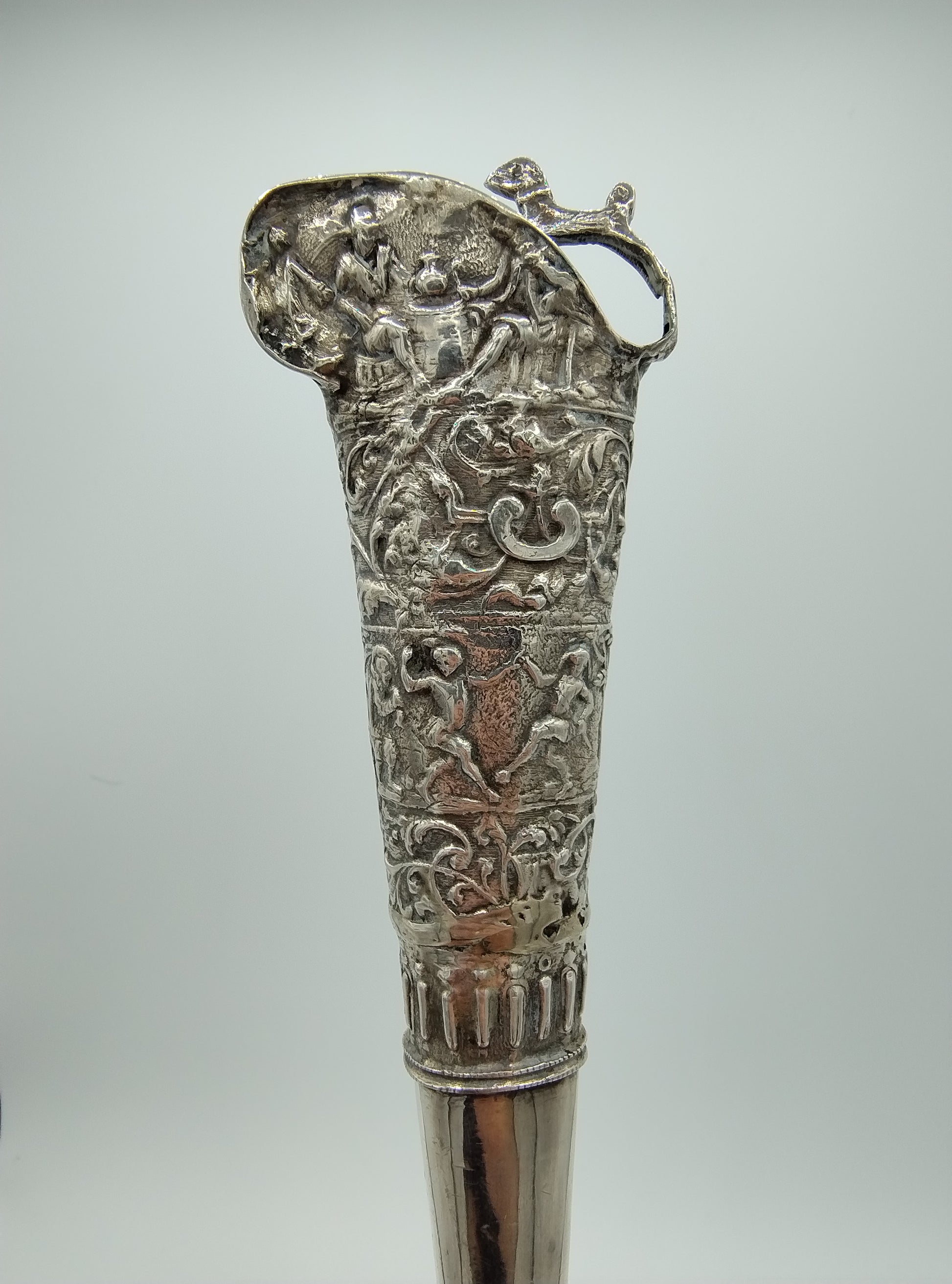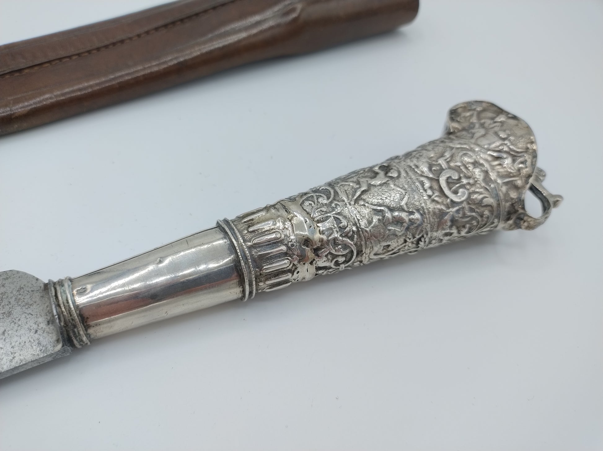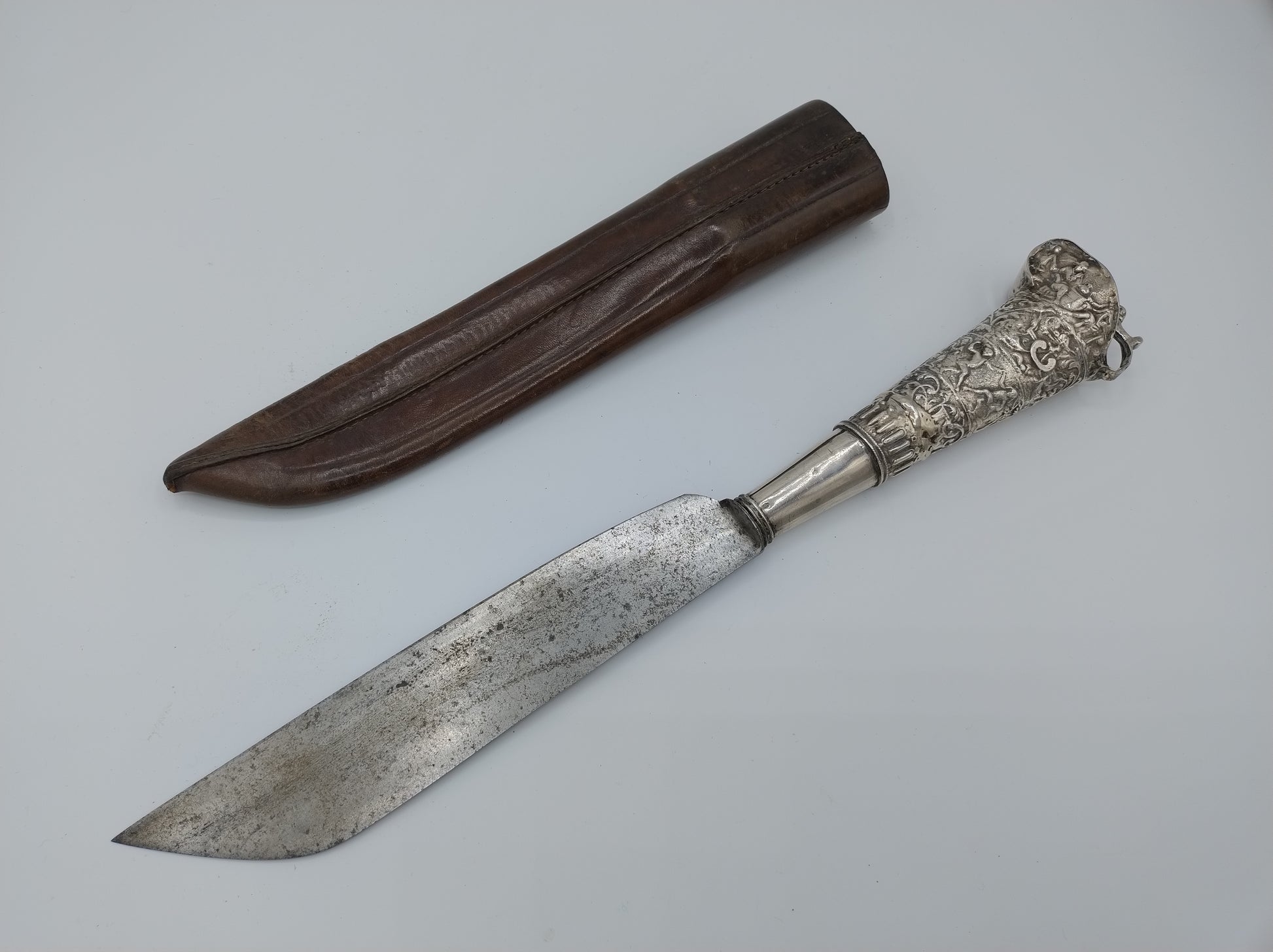 Groot Zeeuws Paeremes met allegorische voorstelling op het heft en als bekroning een gestileerde hond als teken van trouw. Des te groter het mes des te groter de status van drager. Wel deze drager had status. Het mes heeft een lengte van bijna 34 cm (!) en weegt: 181 gram.
