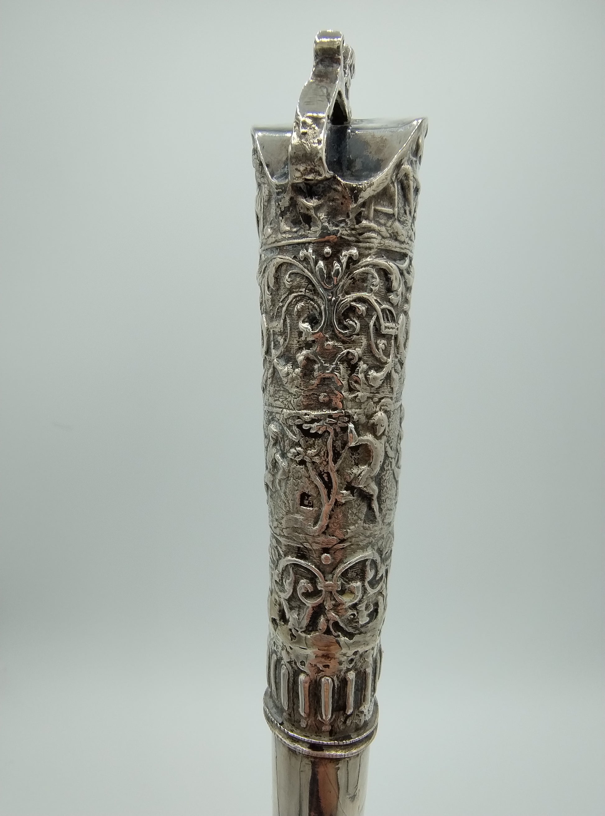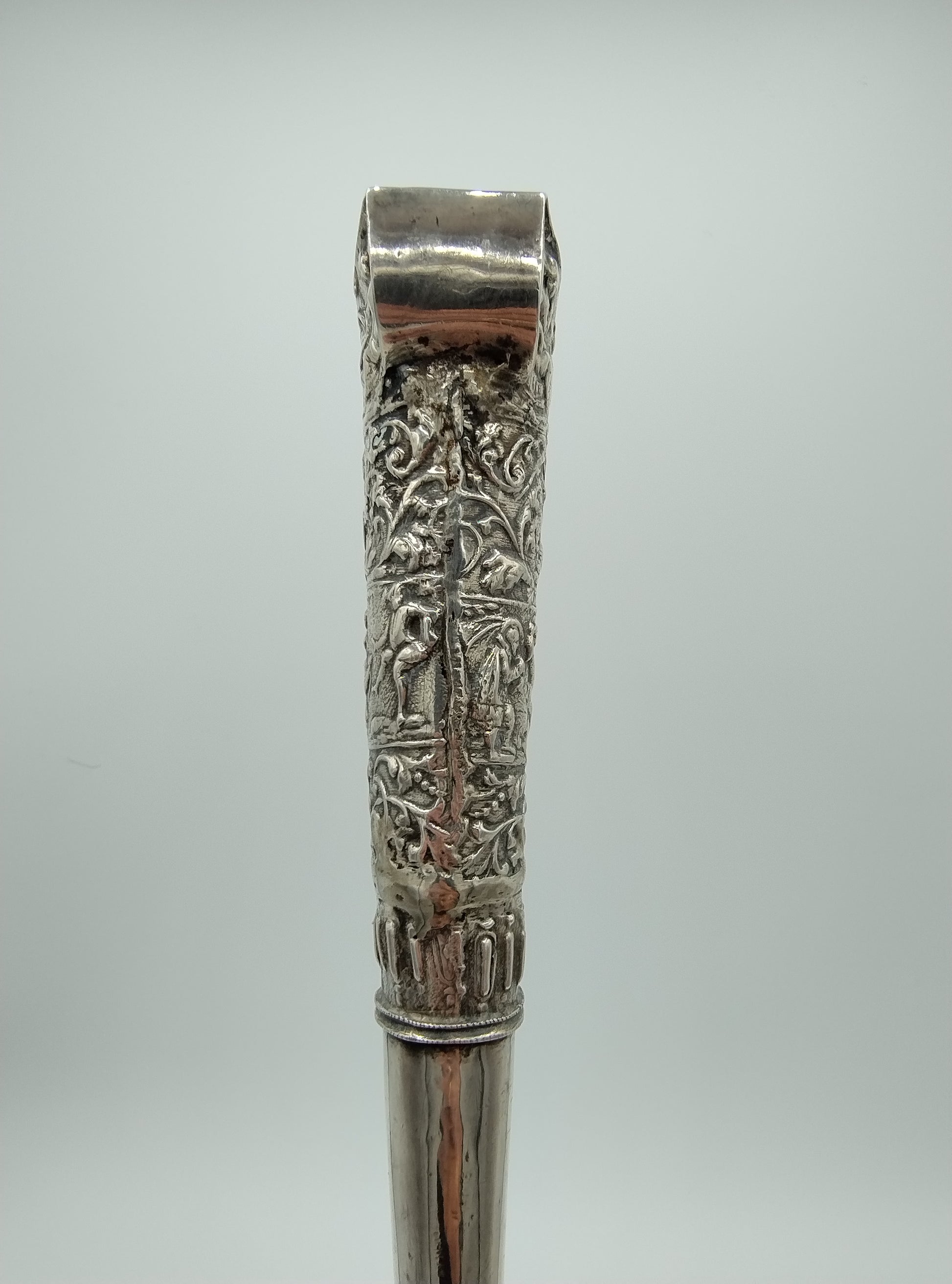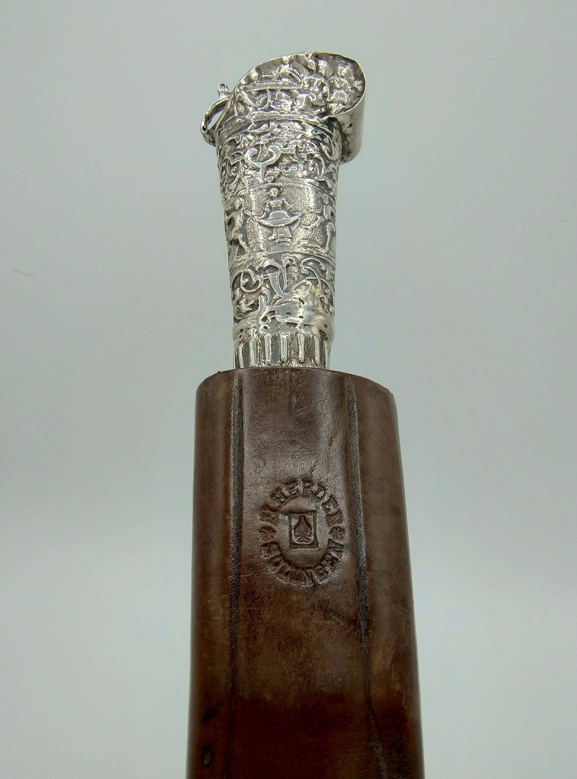 Het lemmet is geleverd door F. Herder uit Solingen (Duitsland). Het zilveren heft is gekeurd met het meesterkeur CM70 van C. Mark (of Murk)uit Middelburg. Deze zilversmid werkte van 1841 tot 1856.