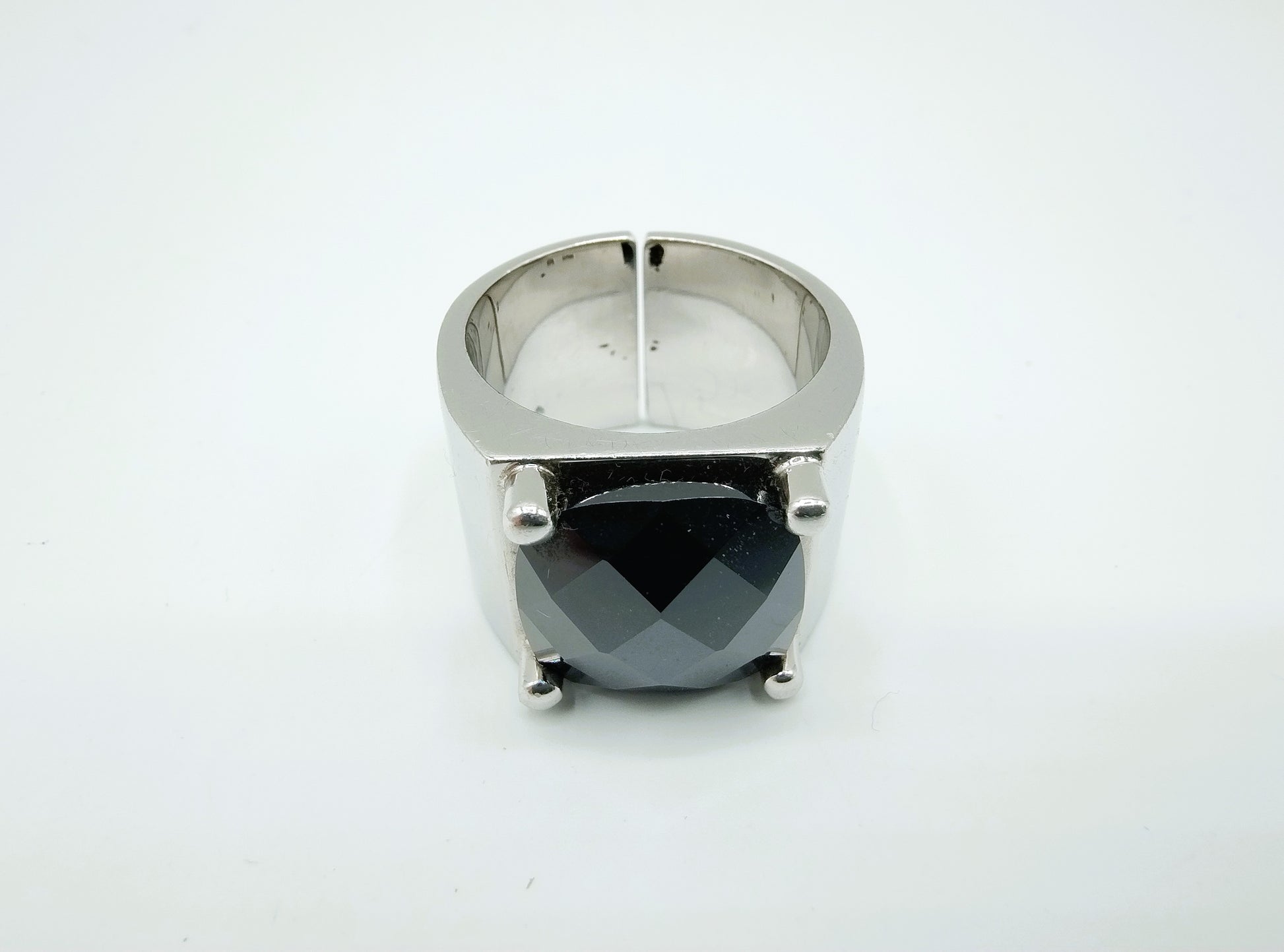 Zware zilveren ring met grote cushion geslepen onyx. De steen heeft een afmeting van 1,5 x 1,5 cm.