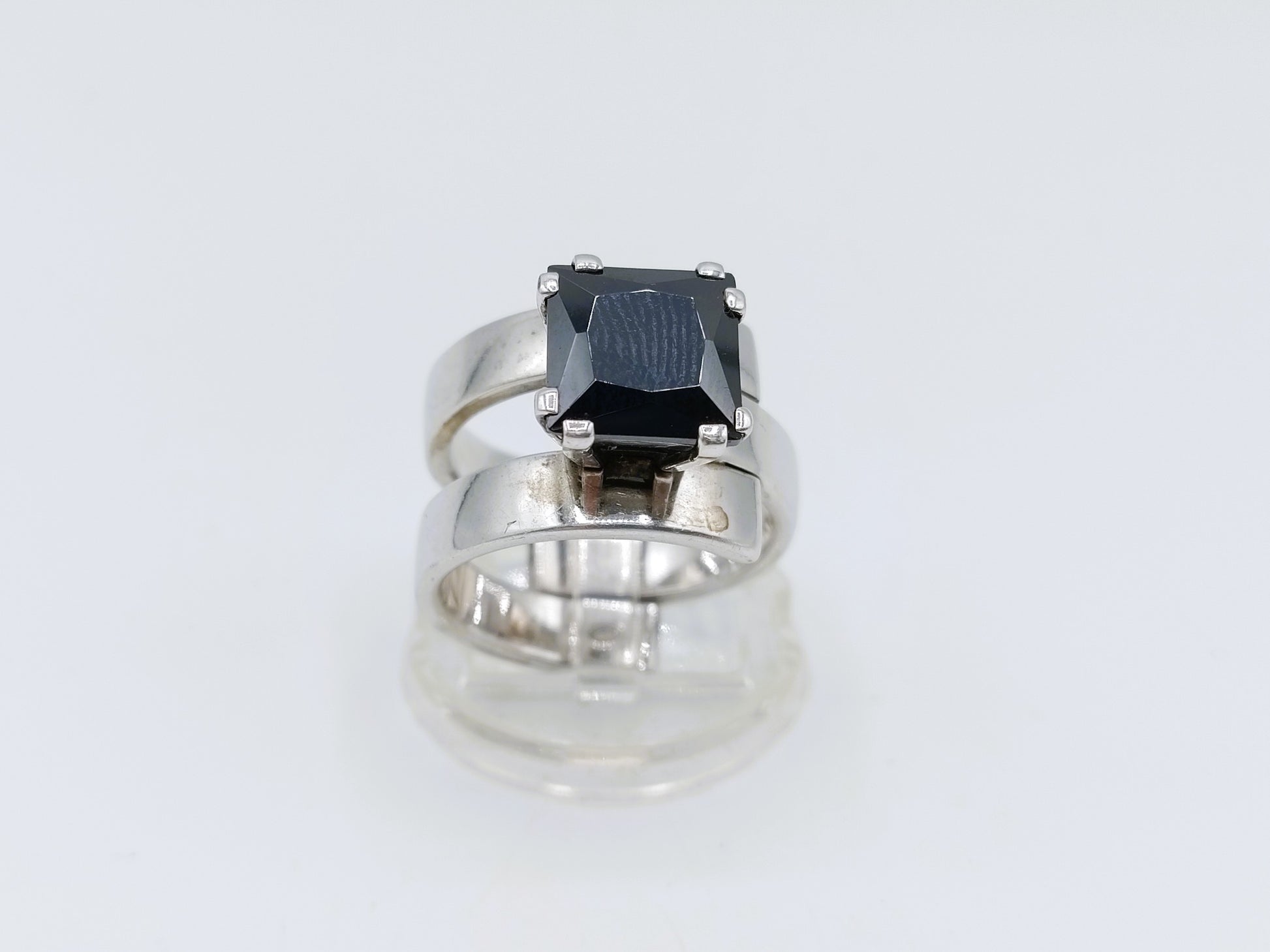 Zware zilveren ring met grote cushion geslepen onyx. De steen heeft een afmeting van 1 x 1 cm.